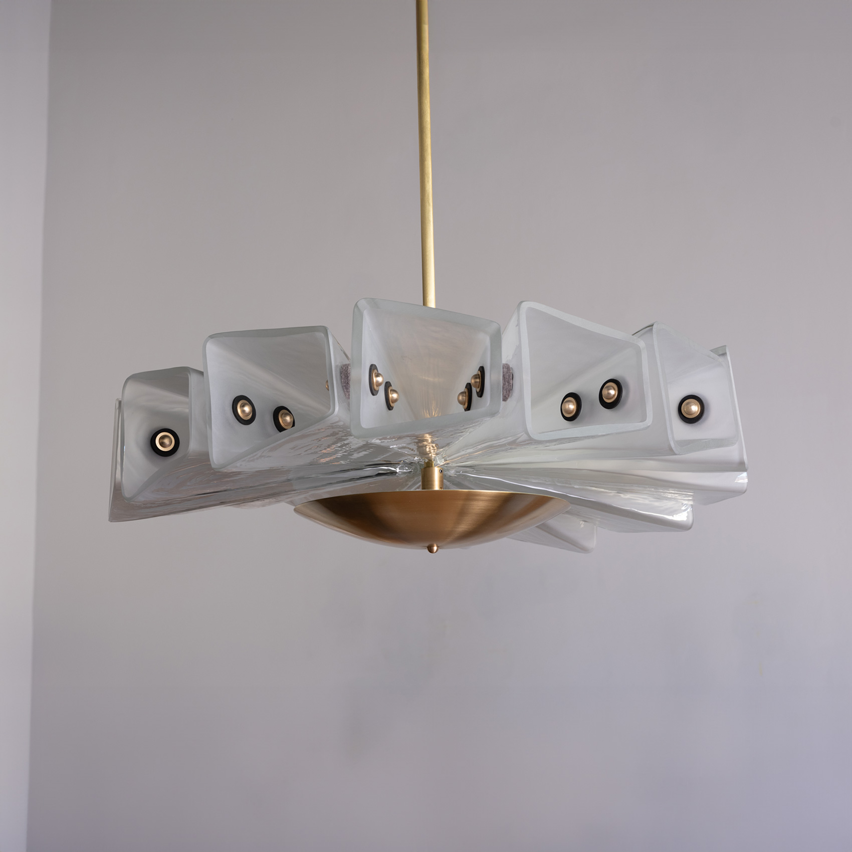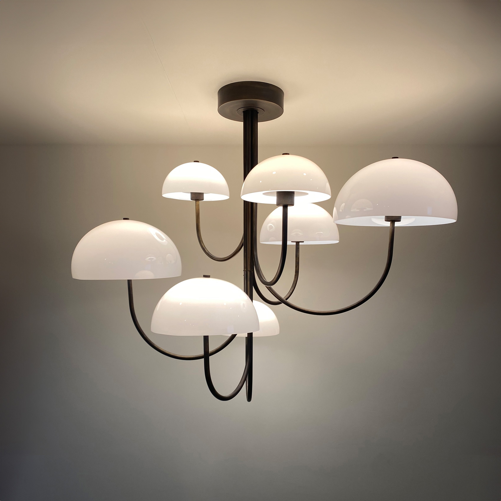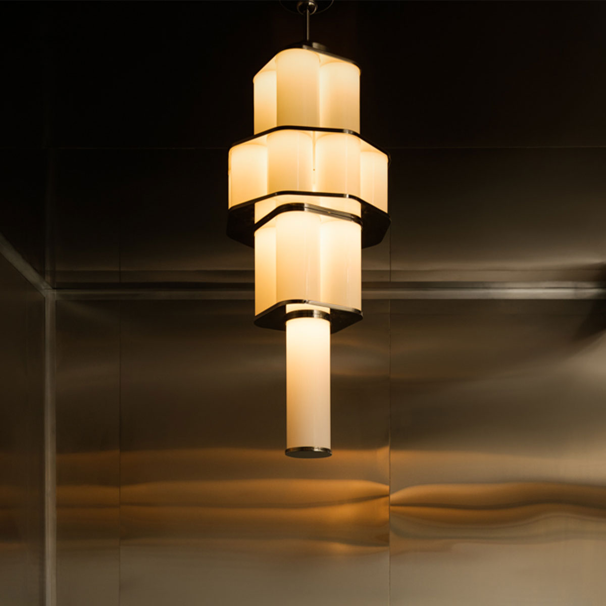 Bauer Chandelier 02 – Polished Nickel + White Glass