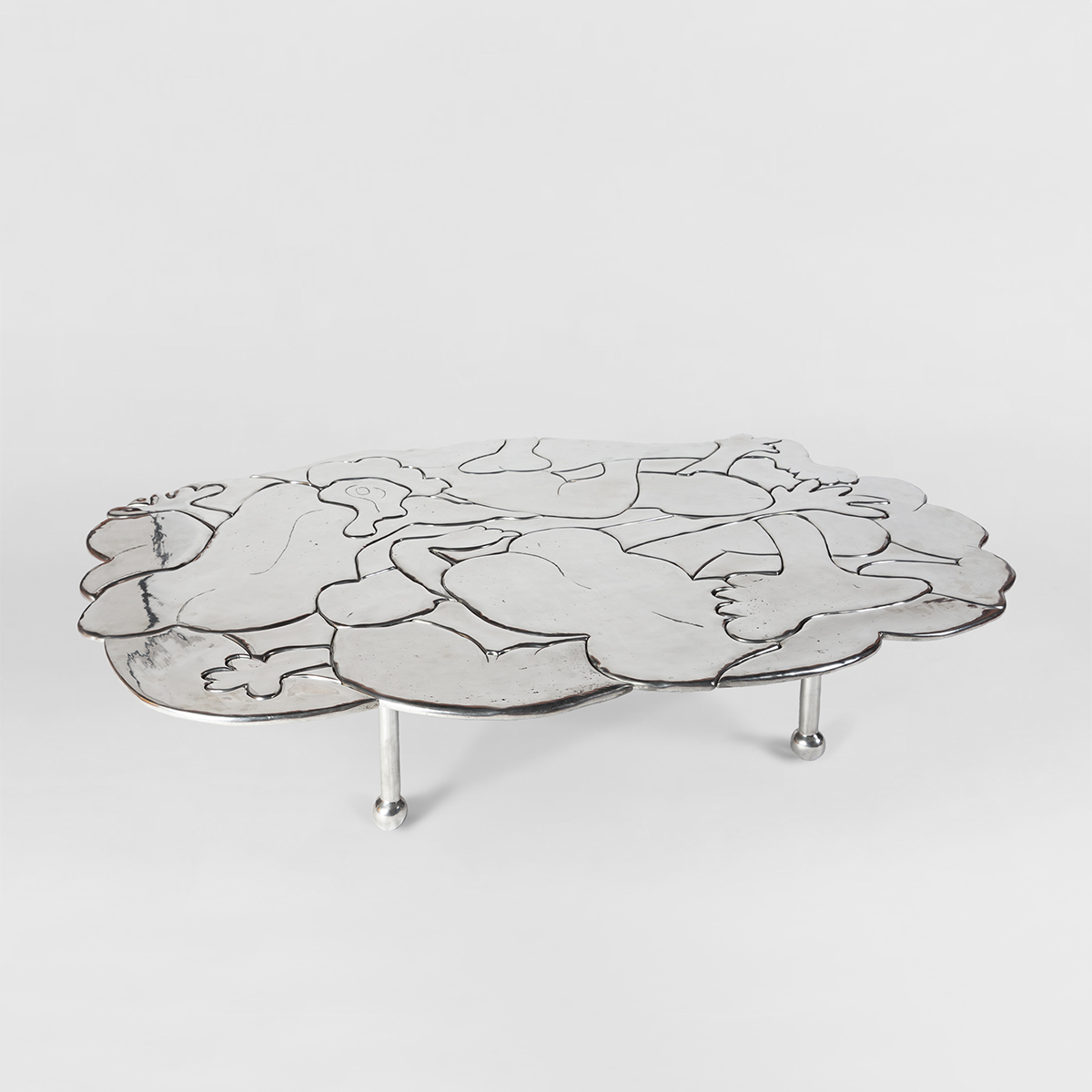 Chris Wolston’s new furniture pieces employ freely illustrated aluminum pieces to present a tactile and compelling design statement. With a new cabinet, armchair, dining table, lighting, and wall installation, Wolston combines his interest in ancient influences and postmodern fabrication. Inspired by the surroundings of his studio in Medellin, Colombia, Wolston has created wildly colorful sand-cast aluminum pieces, collaging leaves, flowers and fruit into a rich patchwork. This is Wolston’s first experimentation with coloring aluminum though anodization, a process which extends to a series of table top sculptures, also included in this presentation.