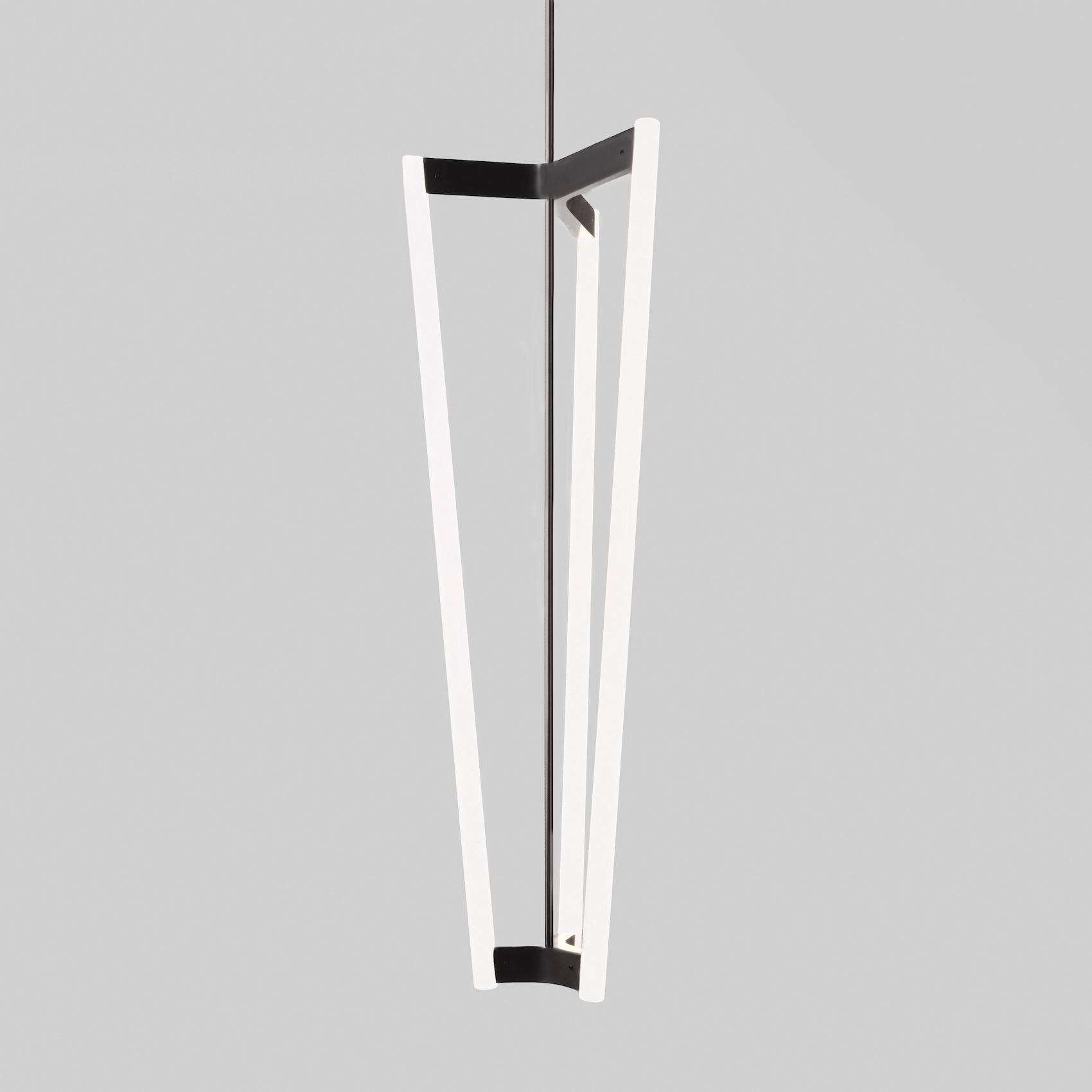 The Tube Chandelier, a triangular fixture with lights illuminating from each of its three sides, is a sleek addition to any residential or commercial space.