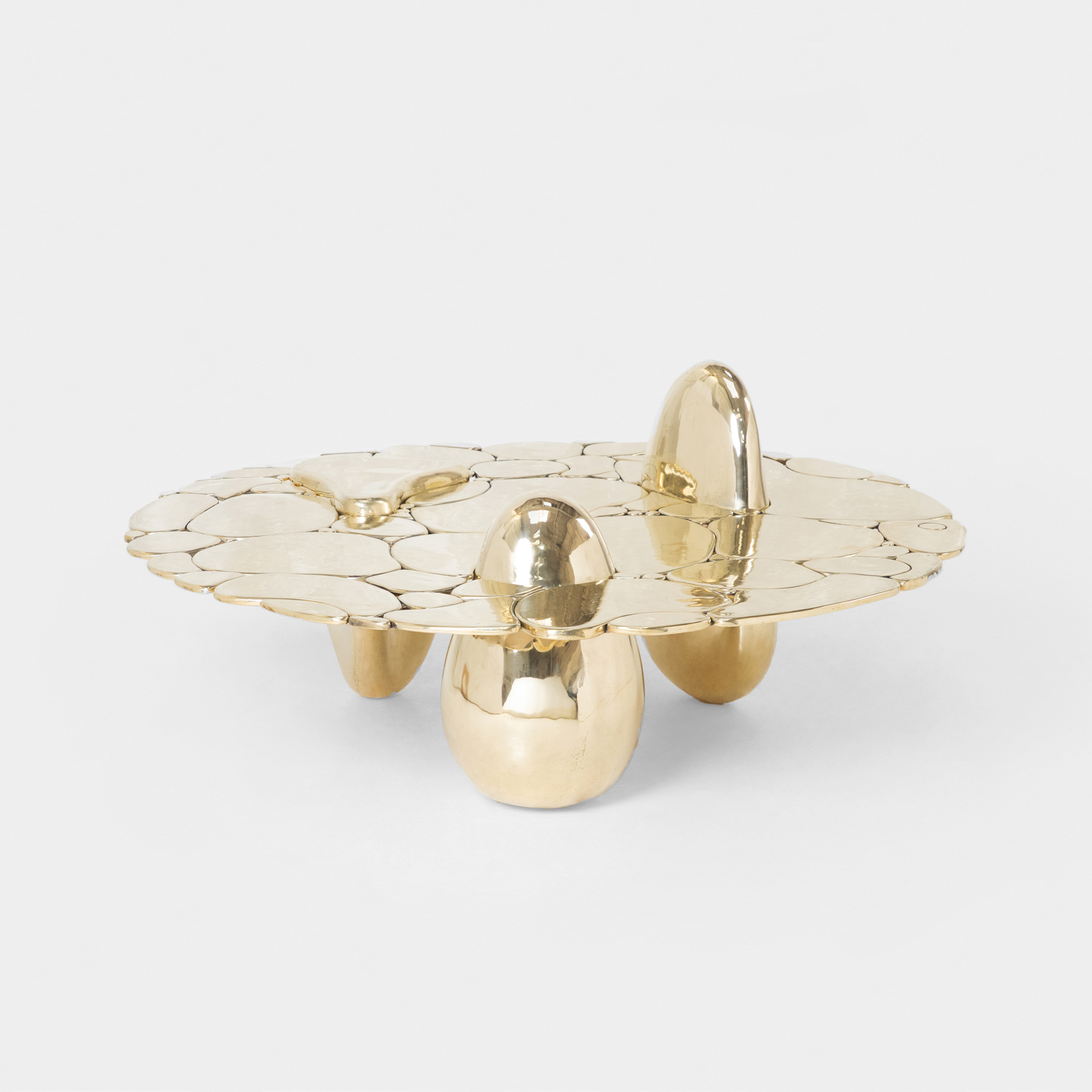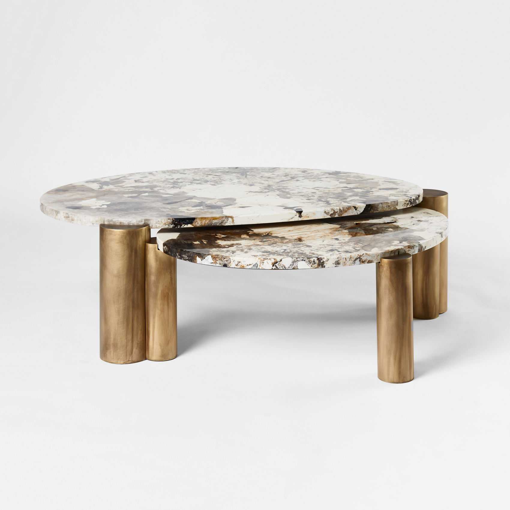 Patagonia Granite and a hand-burnished brass base. The interlocking design unites two tables, creating one synchronized structure.