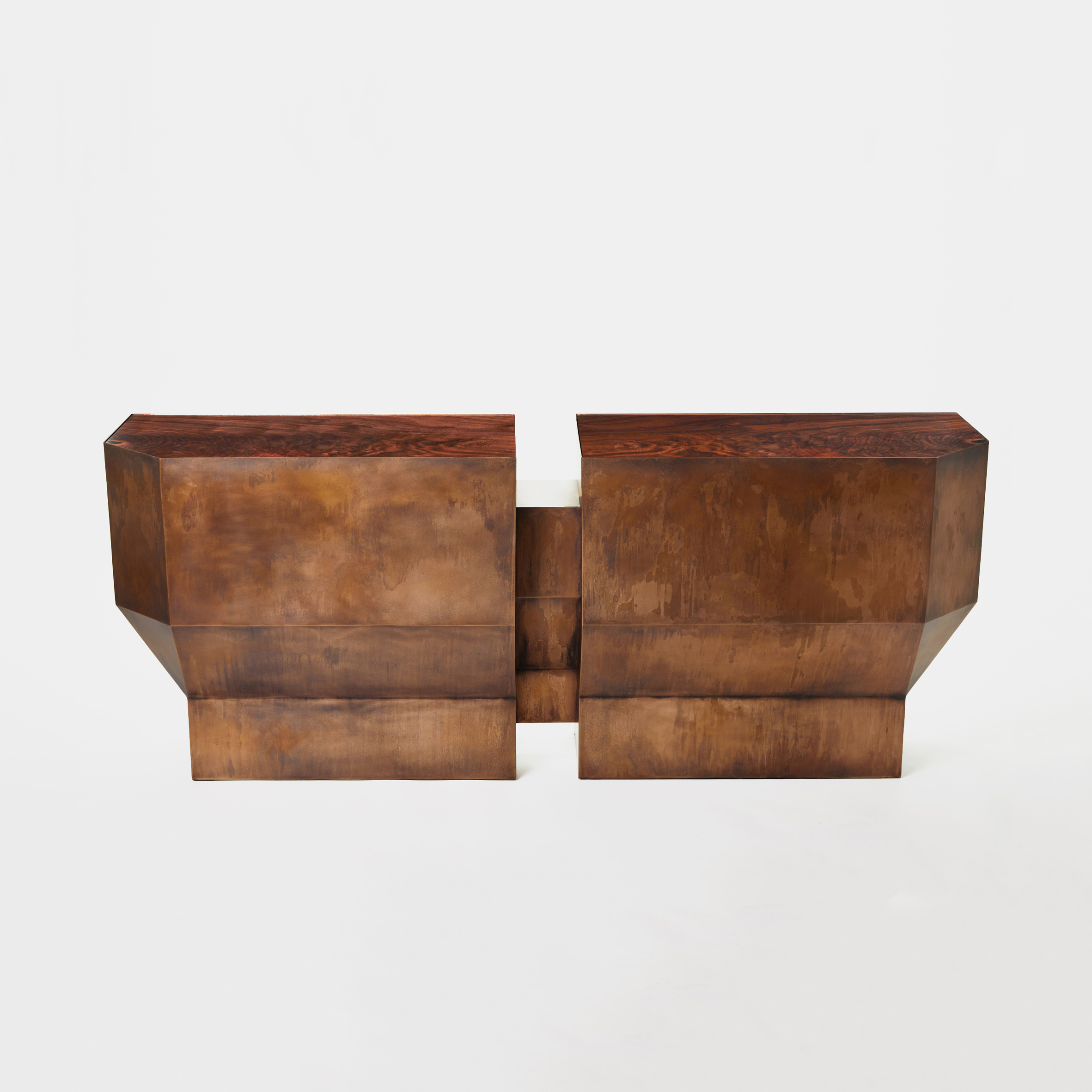 Rampart Console, a commanding formation inspired by medieval battlement structures. The Rampart Console can be produced in a variety of metal finishes and wooden tops.
