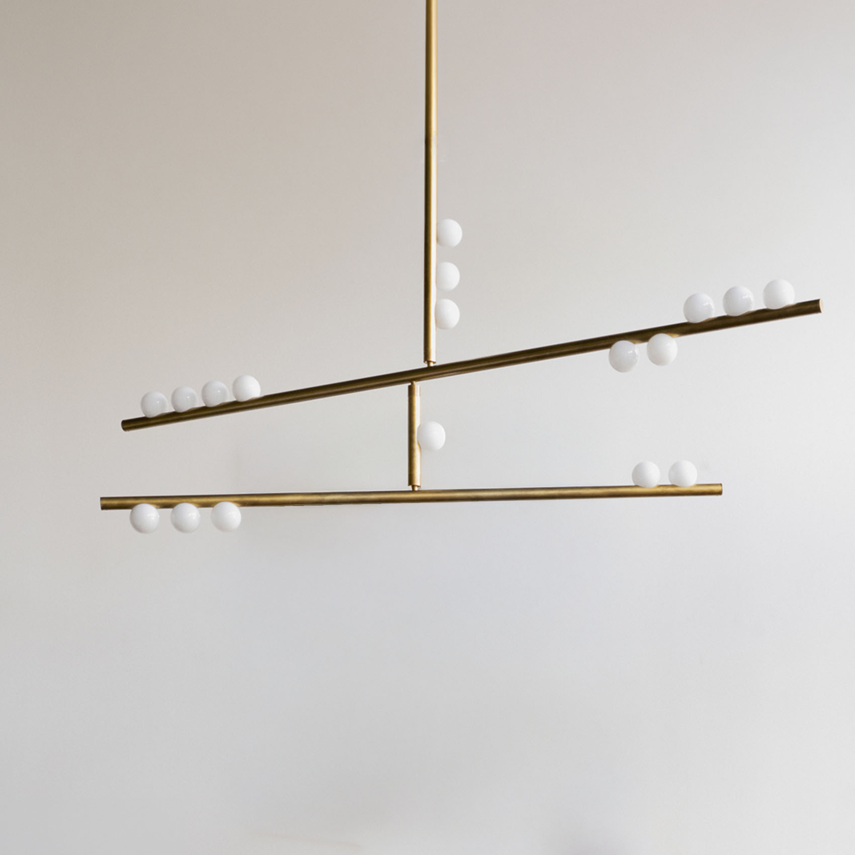 Lindsey Adelman has long been obsessed with illumination in all its forms. Her work treads the porous border between sculpture and design, taking inspiration from such diverse sources as the paintings of Piet Mondrian, an elegiac passage from Camus’s “The Fall” and the spidery brilliance of Giacometti. Ever since the debut of the Branching Bubbles chandelier, the first product made in her newly opened studio in 2006, her goal has been to transform the ephemeral nature of light into something not merely tangible but enduring. Combining organic, handwrought materials like blown glass with the strong industrial beauty of machine-milled components, her lighting systems create radiant warmth while underscoring the drama of shadows and emptiness.