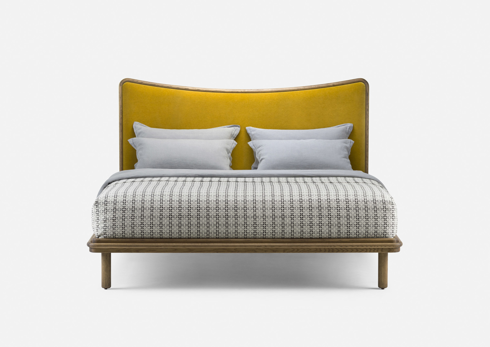 Inspired by the juxtaposition of old and new design seen in converted Brooklyn brownstones, Carlton Bed is modern with historical references. It shares its design language with Elliot Table and Chair. The frame is made from a series of carved wood components, revealing a stunning composition of grain patterns. Upholstery softens the headboard.