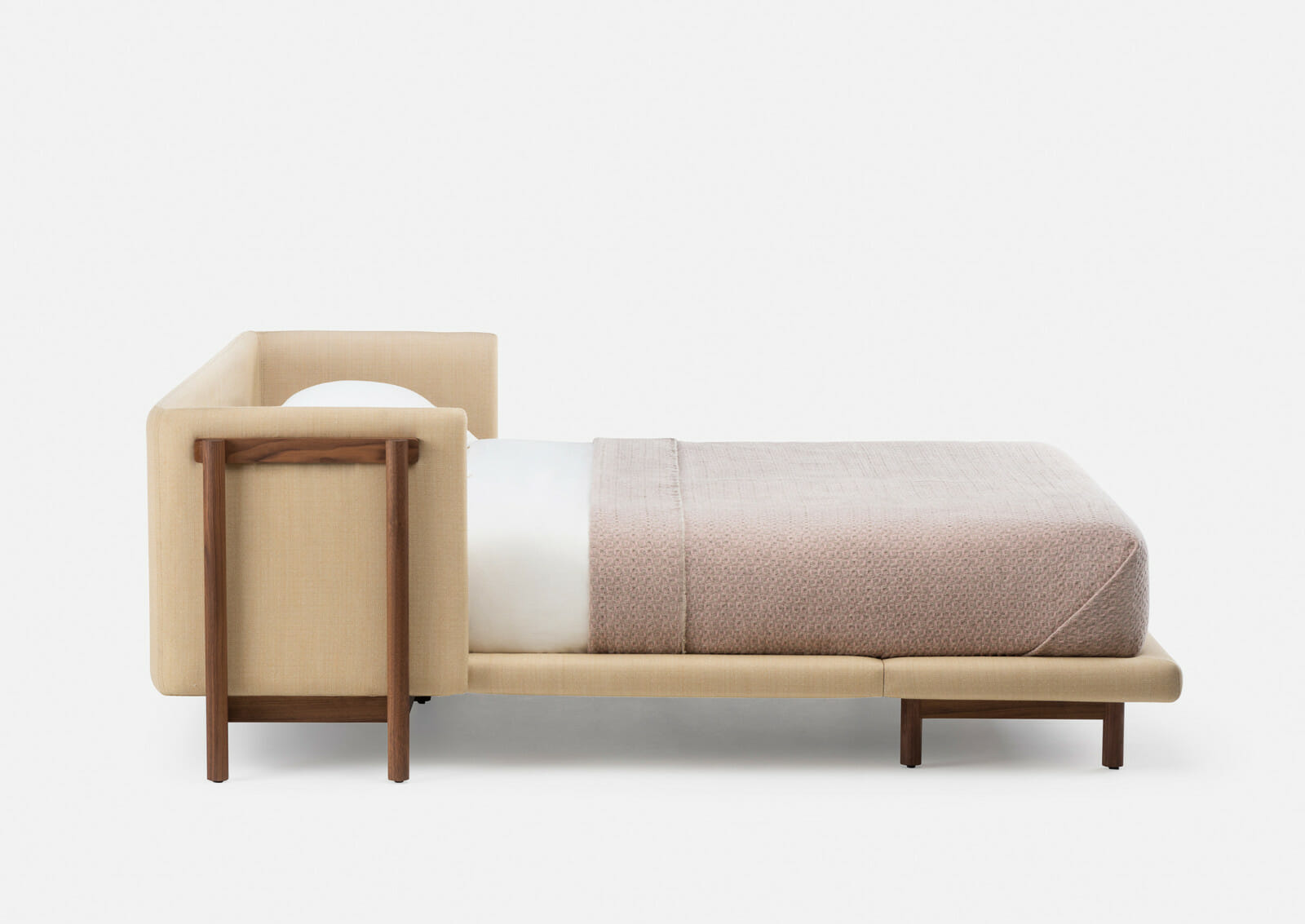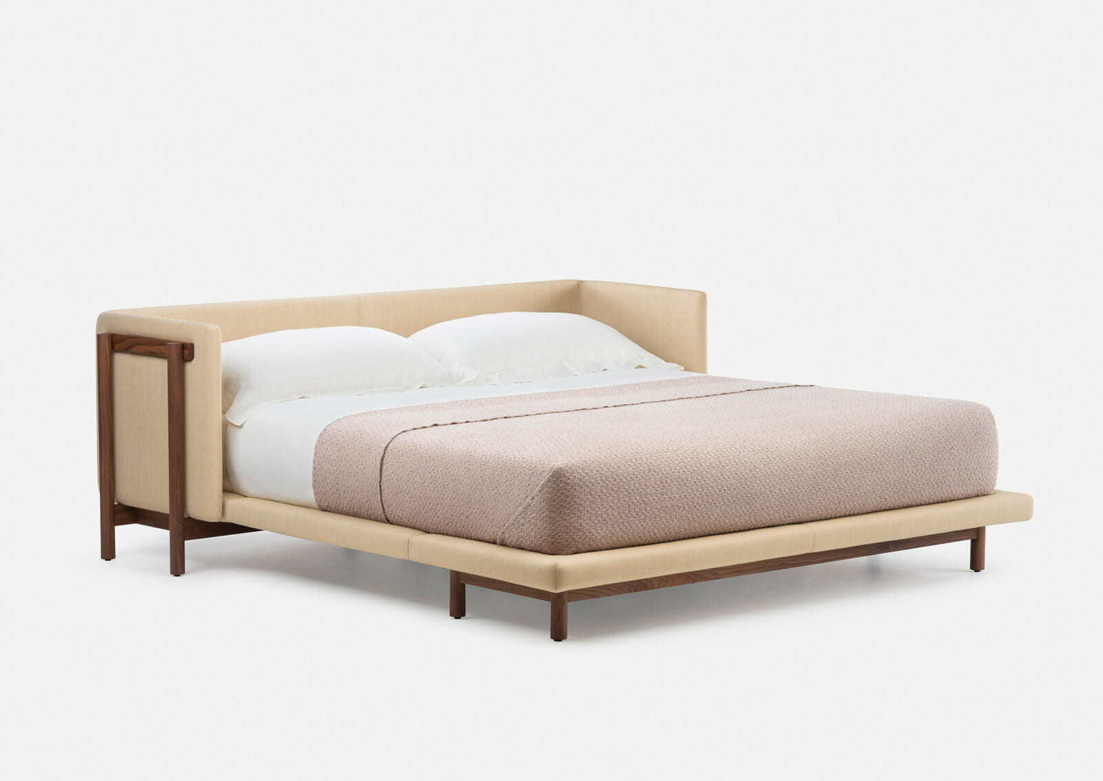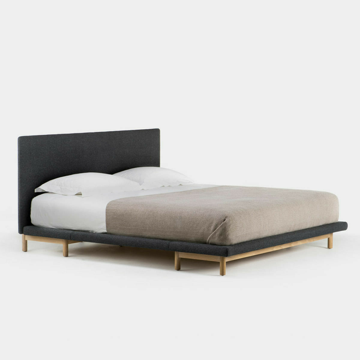 Frame is an upholstered bed supported by a wooden frame structure to which various accessories can be clipped, such as a tray or light. The Frame bed is available in two styles, one with "arms" and one without. Designed by Neri&Hu and manufactured by De La Espada for the Neri&Hu brand.