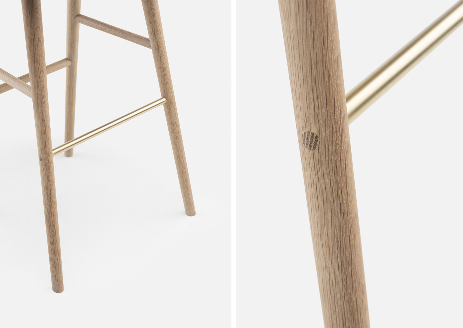 Available in Ash, Oak, or Walnut in a range of finish options, and a range of fabric or leather options. Brushed Brass detailing