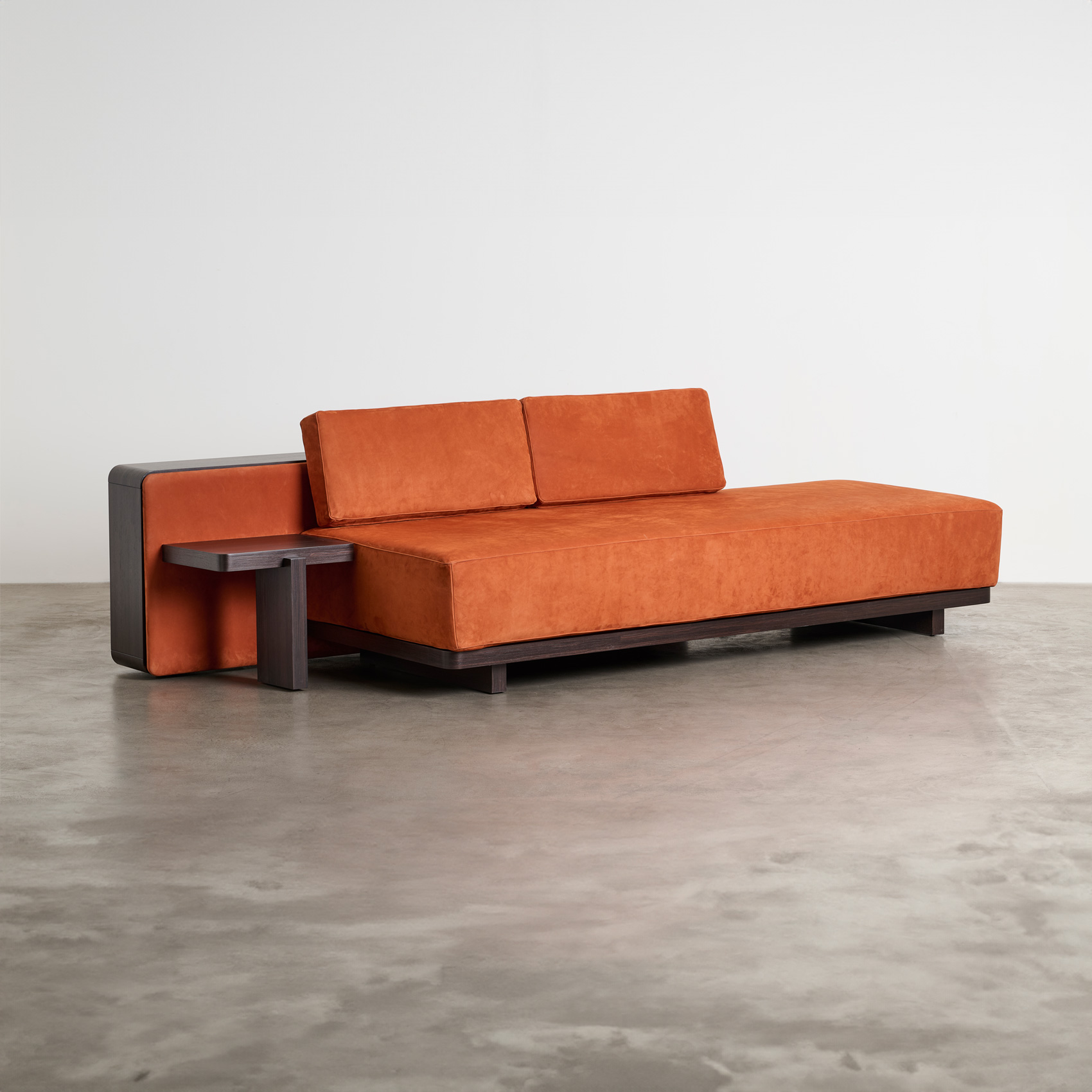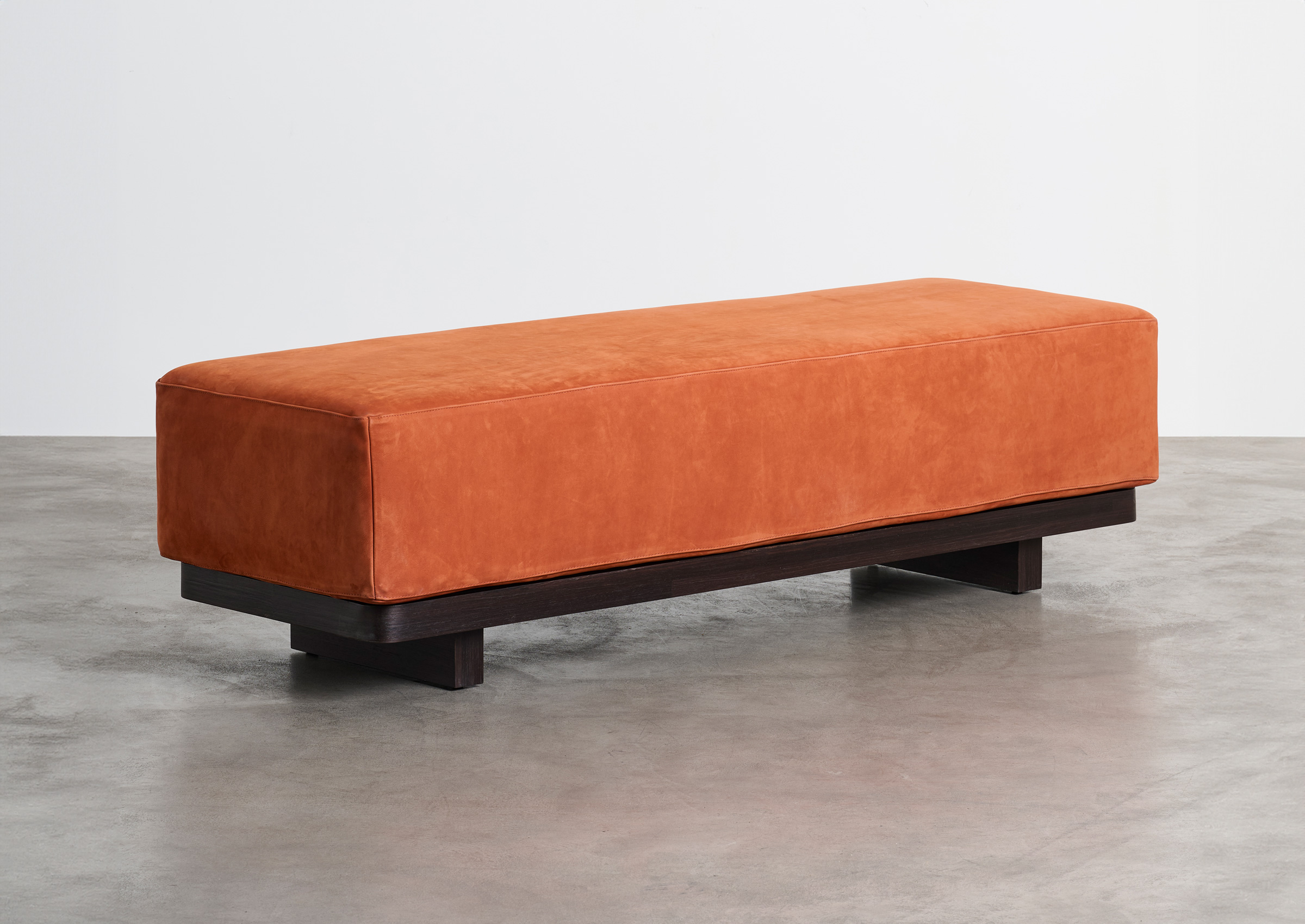 The Lisboa Bench, designed by Lucia Ippolito, features a wooden frame with polyurethane foam padding and is upholstered in either fabric or leather.