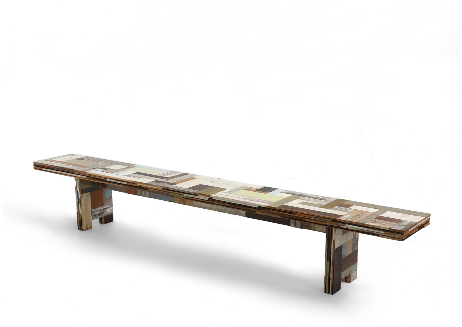 The Waste Bench is meticulously crafted in Piet Hein Eek's studio using traditional wood-working technique. It brings his quintessential vocabulary of recycled wood collage to a bench design of exceptional grace. Each bench is completed with a characteristic high gloss finish. Due to the nature of the material used in production, each piece is one-of-a-kind.