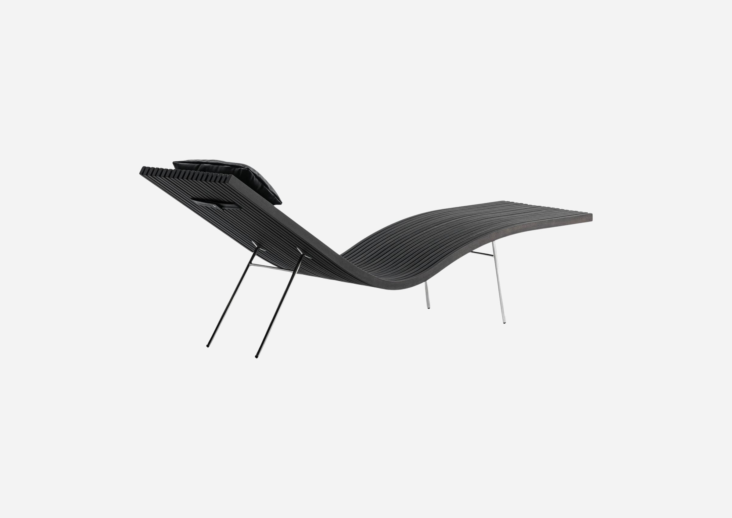 Chaise longue was designed for a spa complex in the Swiss valley of Vals, Therme Vals, built of stacked layers of local stone. The chair profile is made of laminated wood, arranged at equal interval, softly curved to fit the human body, and lifted into the air by slender metal legs. Lying down on the Chaise longue creates the feeling of floating in the air. To produce this chair in Japan, we decided to make the wooden frame using the traditional steam bending technique instead of the original laminated wood. In a process practiced for a hundred years, the wood is steamed at a high temperature and then bent into a metal mold. This technique does not waste any wood, which is essential even more in modern society. The wood is taken out of a hot kiln and bent along its grain within five minutes before it quickly hardens. It could only be done by skilled artisans working together to fit the wood into the metal mold. The bentwood dried in the mold shows a beautiful curve as if it has always been that way. Using solid wood makes the product durable to be cherished for a long time.
