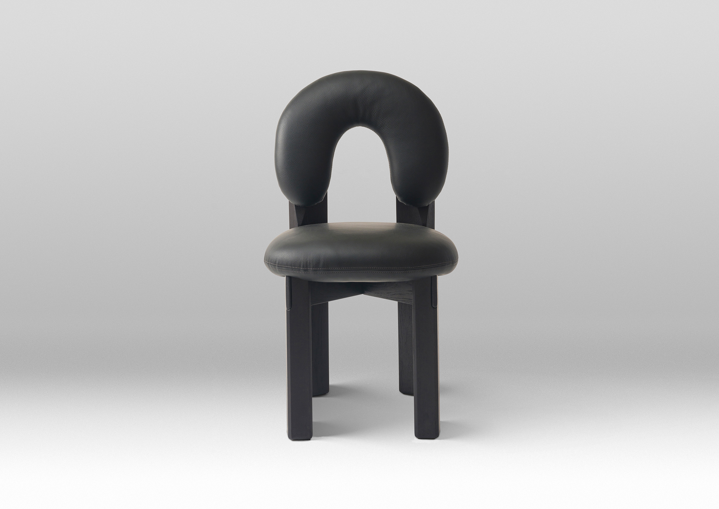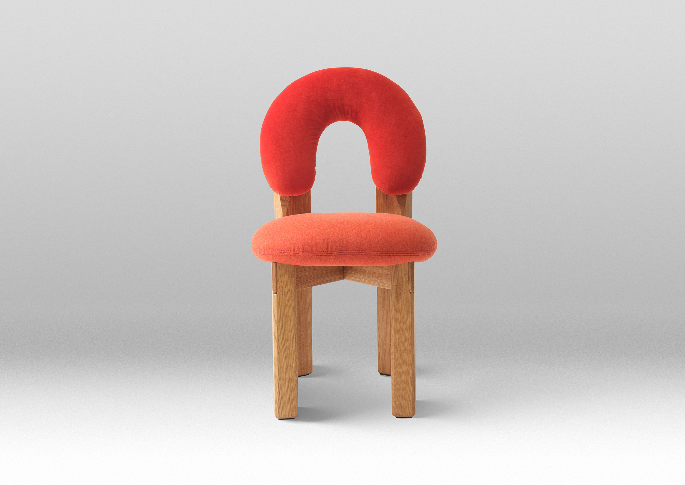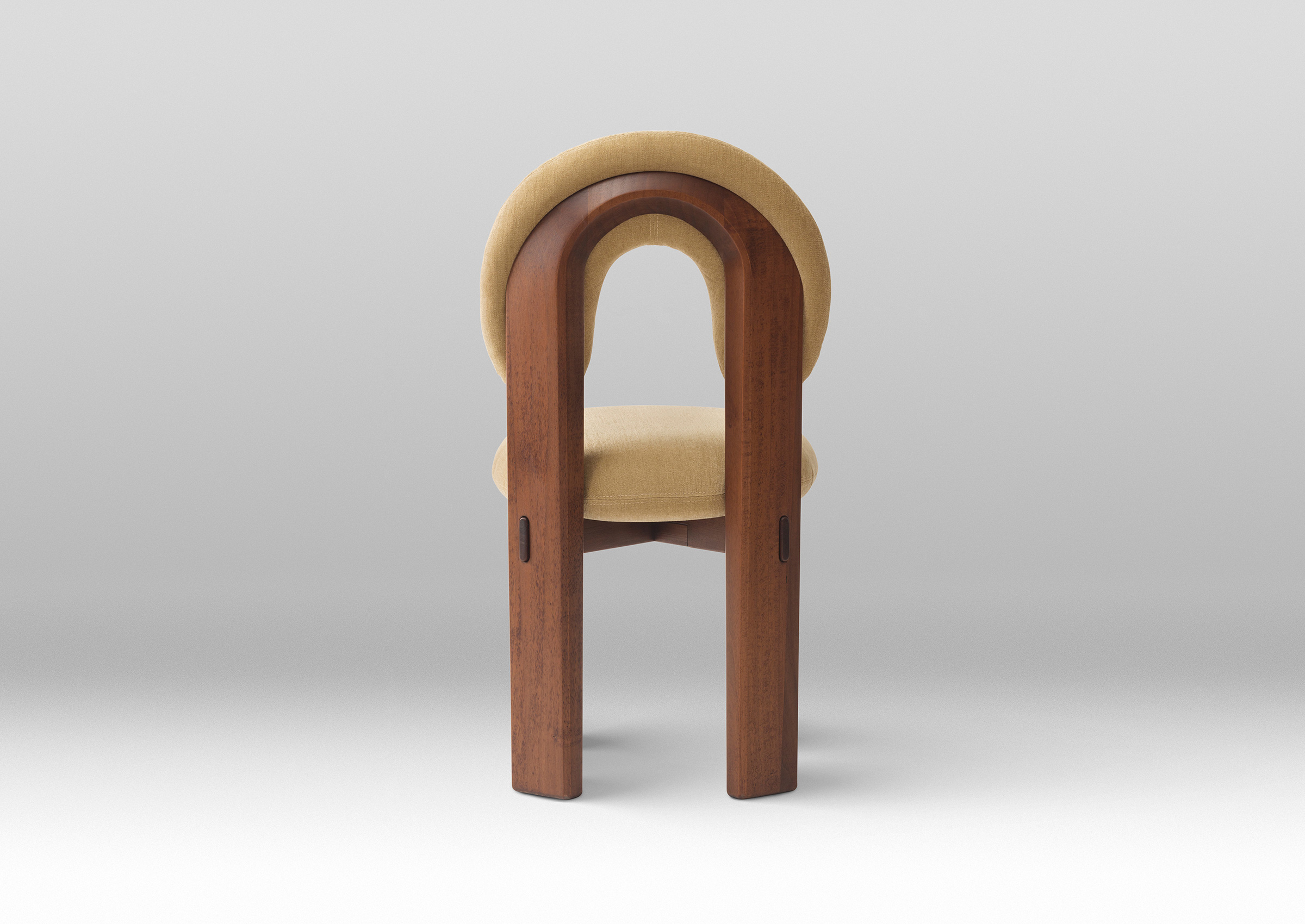 The Ithea back is formed from a solid piece of wood, expertly whittled and shaped into an angled arch, reminiscent of the archivolts of Romanesque monasteries. The silhouette requires an exactitude of woodworking that speaks to the craftsmanship of Orior, further revealed by the wood joinery. Complete with upholstered cushions, the Ithea provides a gracious and upright seat.