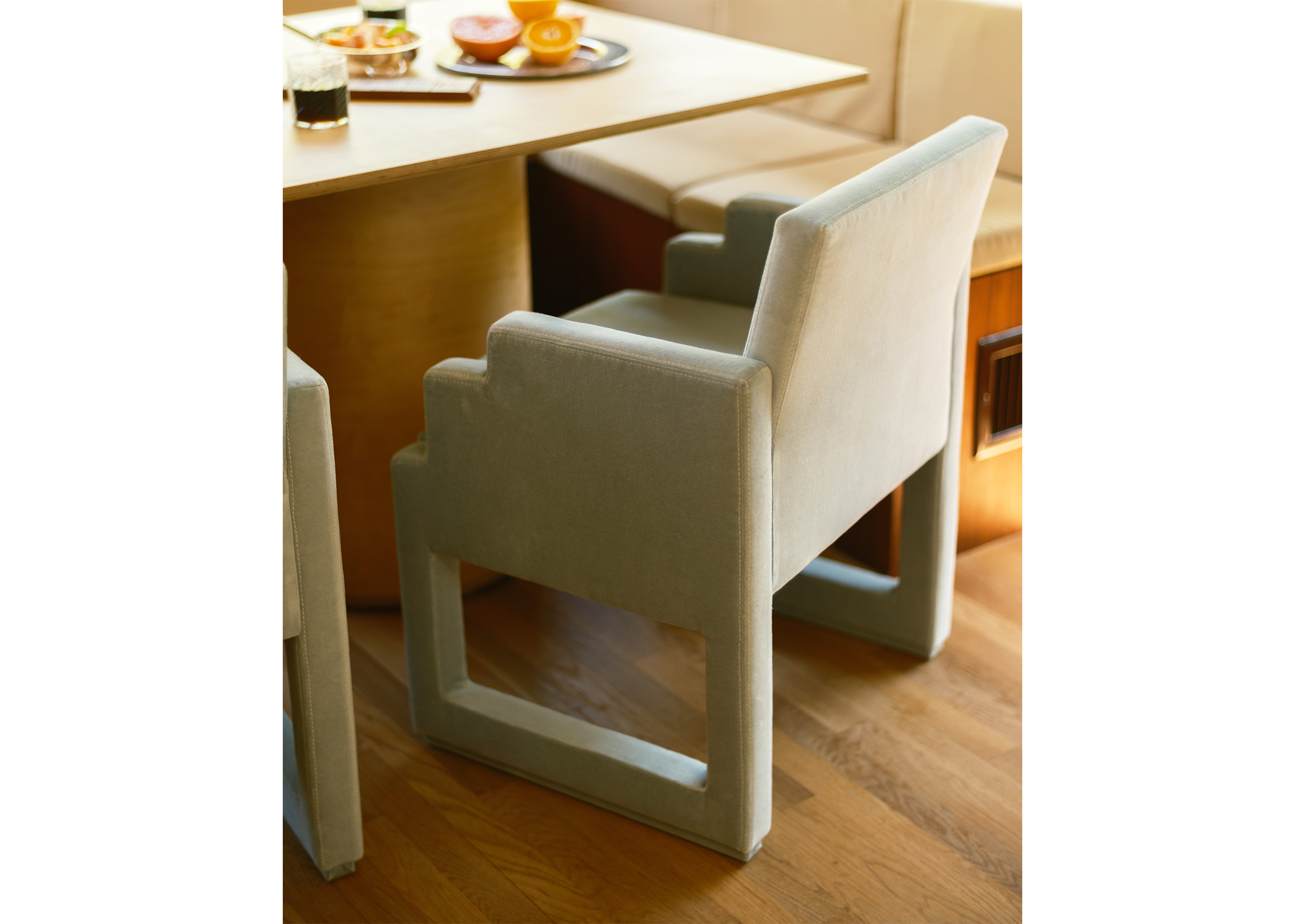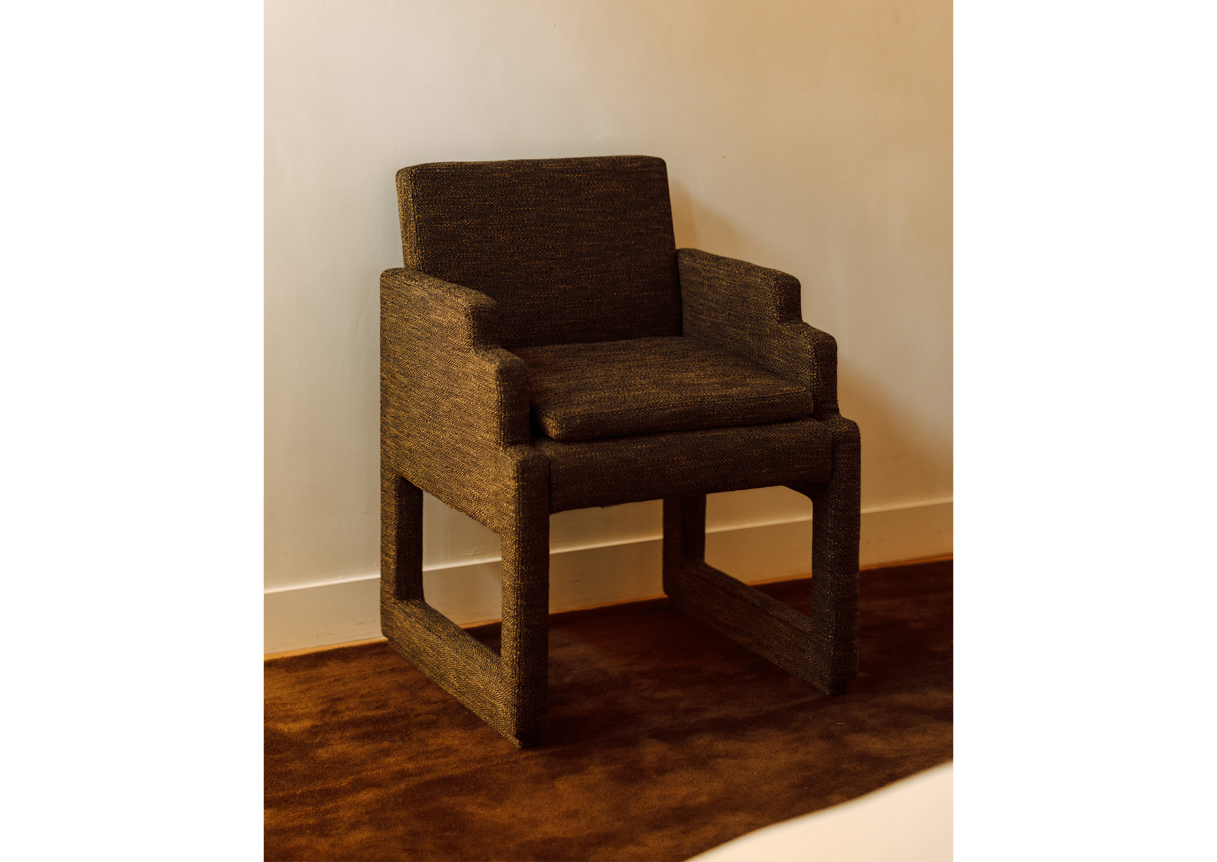 The Popro Dining Chair by Willett redefines classic dining seating with bold architectural lines and an enveloping silhouette. Fully upholstered, the chair’s blocky, cantilevered legs merge seamlessly with its angular armrests, while a loose seat cushion adds comfort and contrast. Designed with sculptural clarity, the Popro Chair pairs functional comfort with a commanding presence.