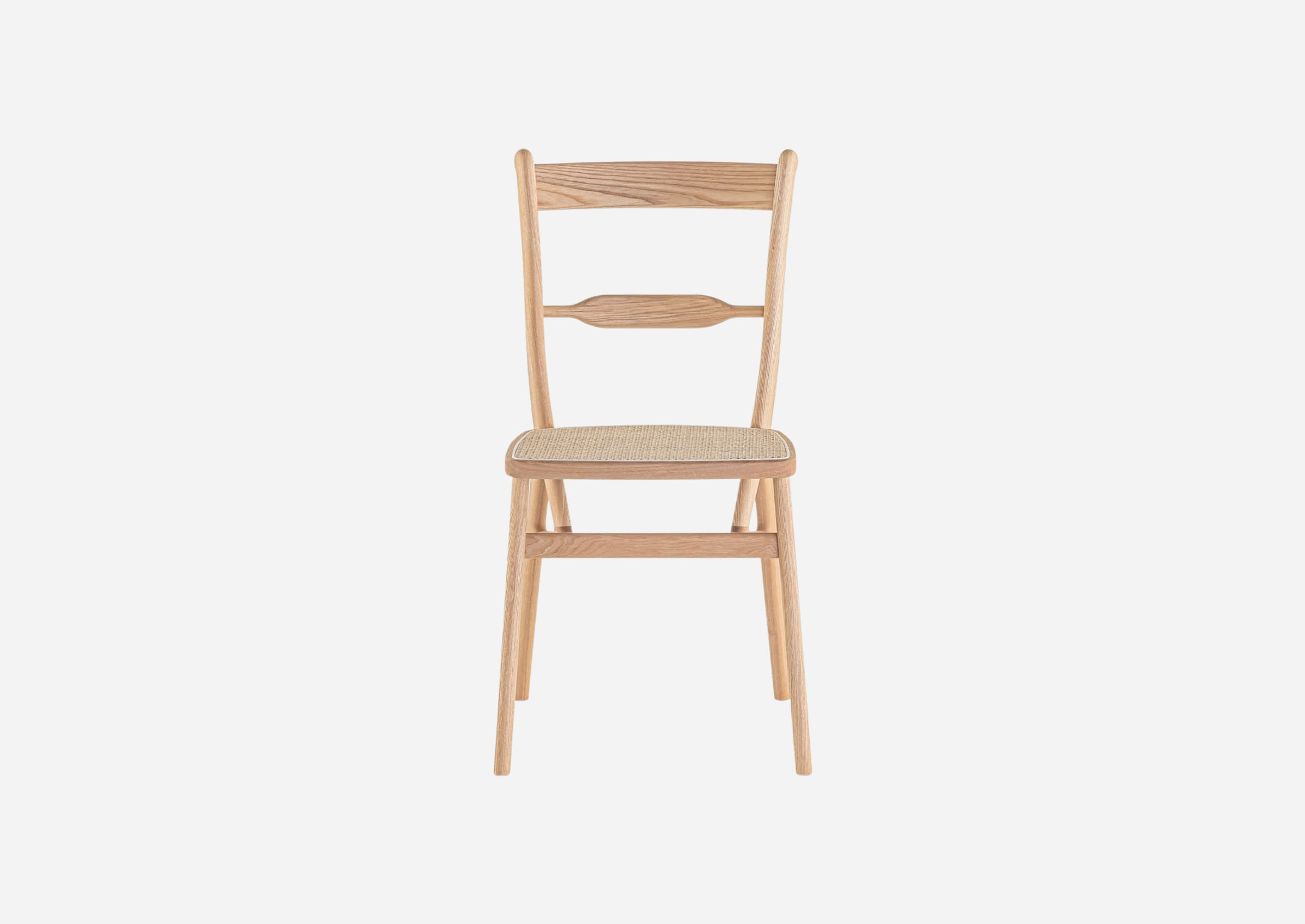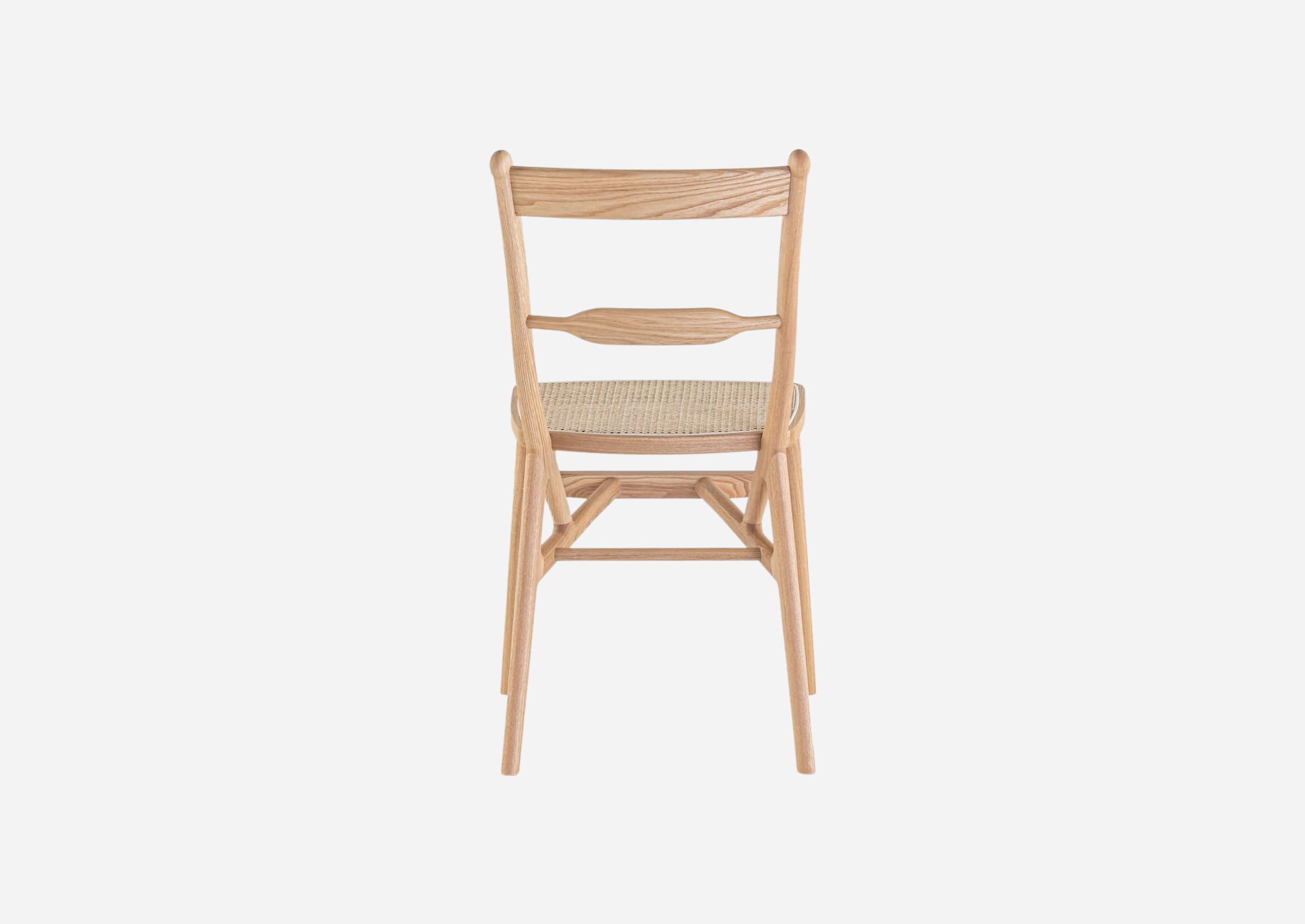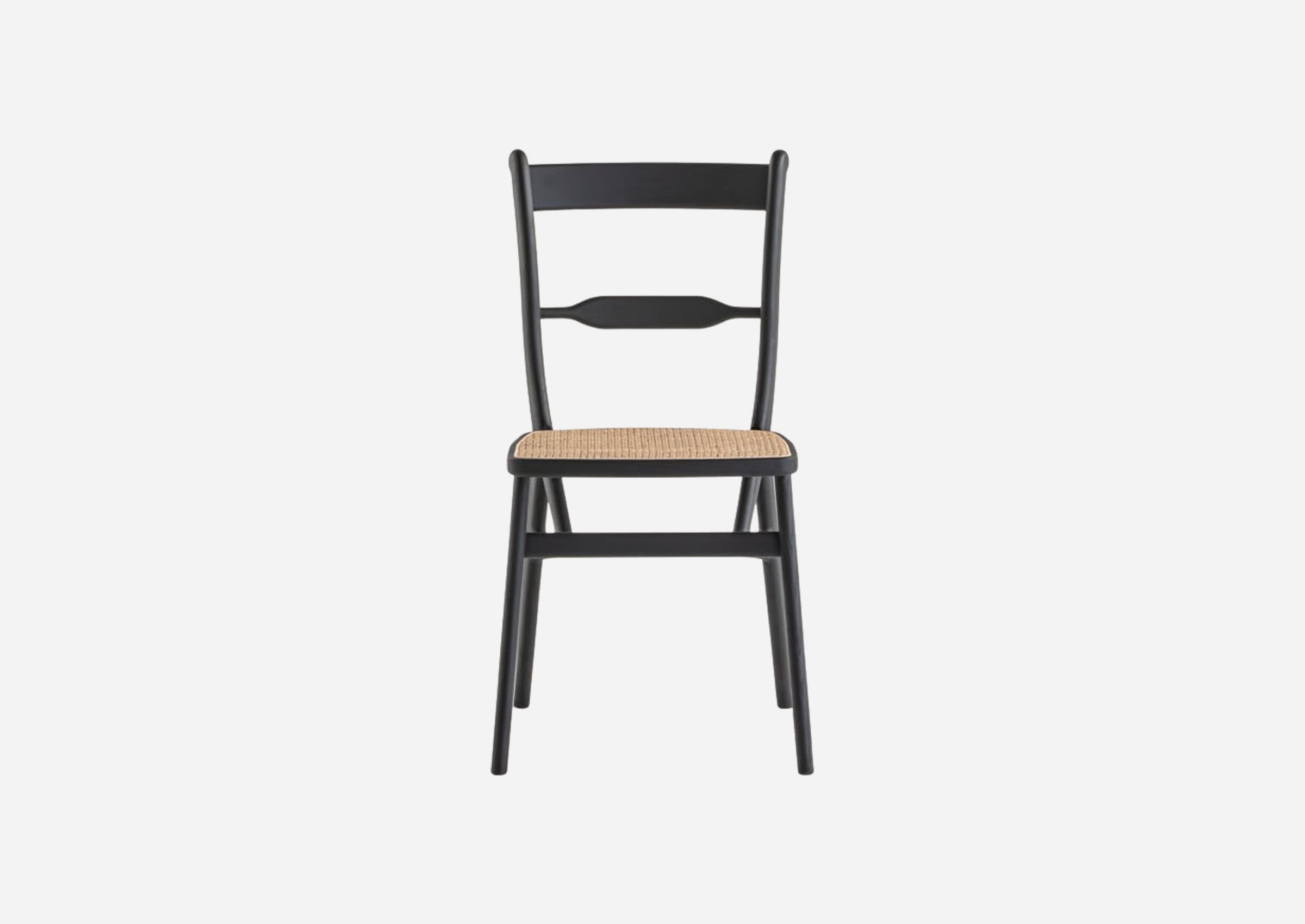 The TLSB chair is a scrollback chair whose name is an acronym for Triangular-Legged Scroll-Back, highlighting its unique design in which the back pillars, crosspiece, and rear legs are arranged in a triangle, and a rattan-covered seat frame is fixed on top of it. This innovative structure, which was conceived to ensure efficient material use and rigidity, has made the chair even lighter, evolving it into an easy- touse furniture item that can be lifted with one hand. While boldly modifying the structure itself, we have retained and refined the original elements such as the central stay and scrolls, resulting in a design that feels like a fusion of classic and modern, Western and Eastern. The small seat, slightly high curved backrest, and unique appearance, which imparts a sense of volume, still feel fresh even after 150 years.