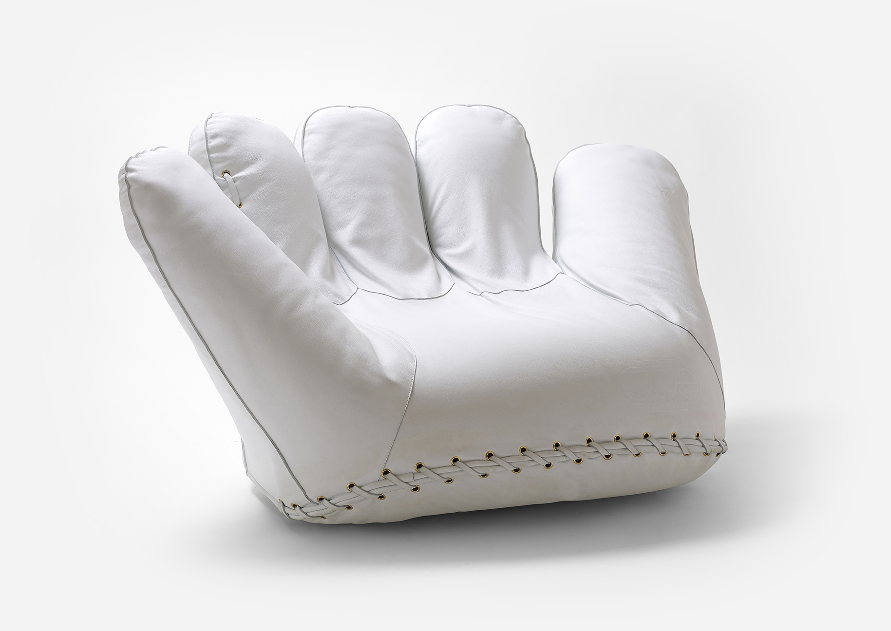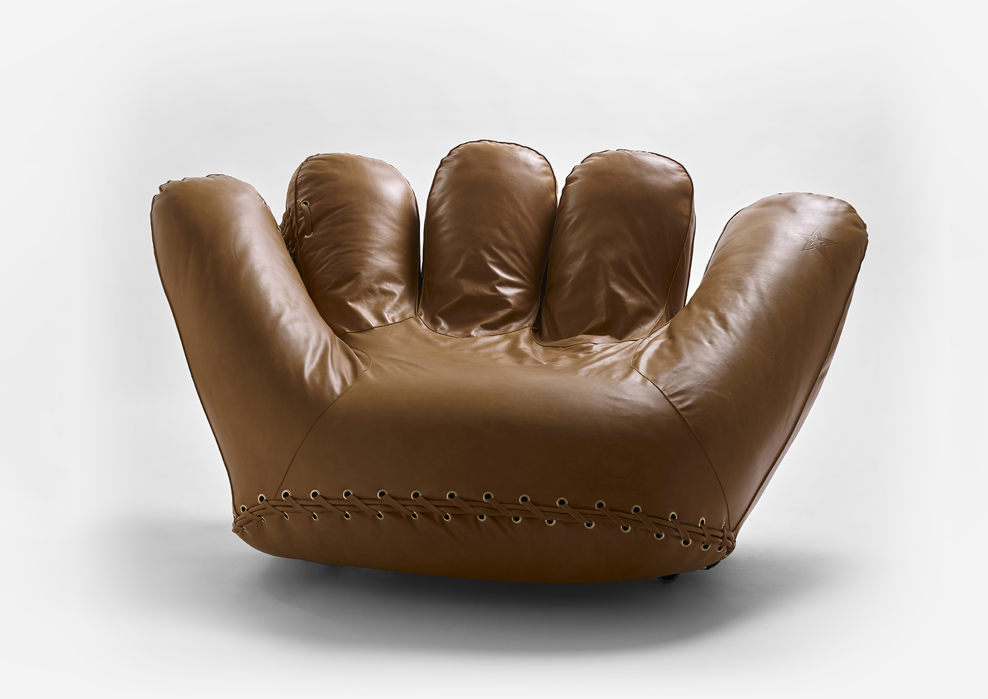 Joe is a big comfortable chair in the form of a giant baseball glove, mounted on invisible wheels. With this project the designers, inspired by the poetics of Pop Art, gave material form to their admiration for the legendary American baseball star Joe DiMaggio. With a courageous shift of scale, they transformed the glove into a welcoming place to sit, inserting a hyperrealist figure borrowed from the world of art into the domestic environment.