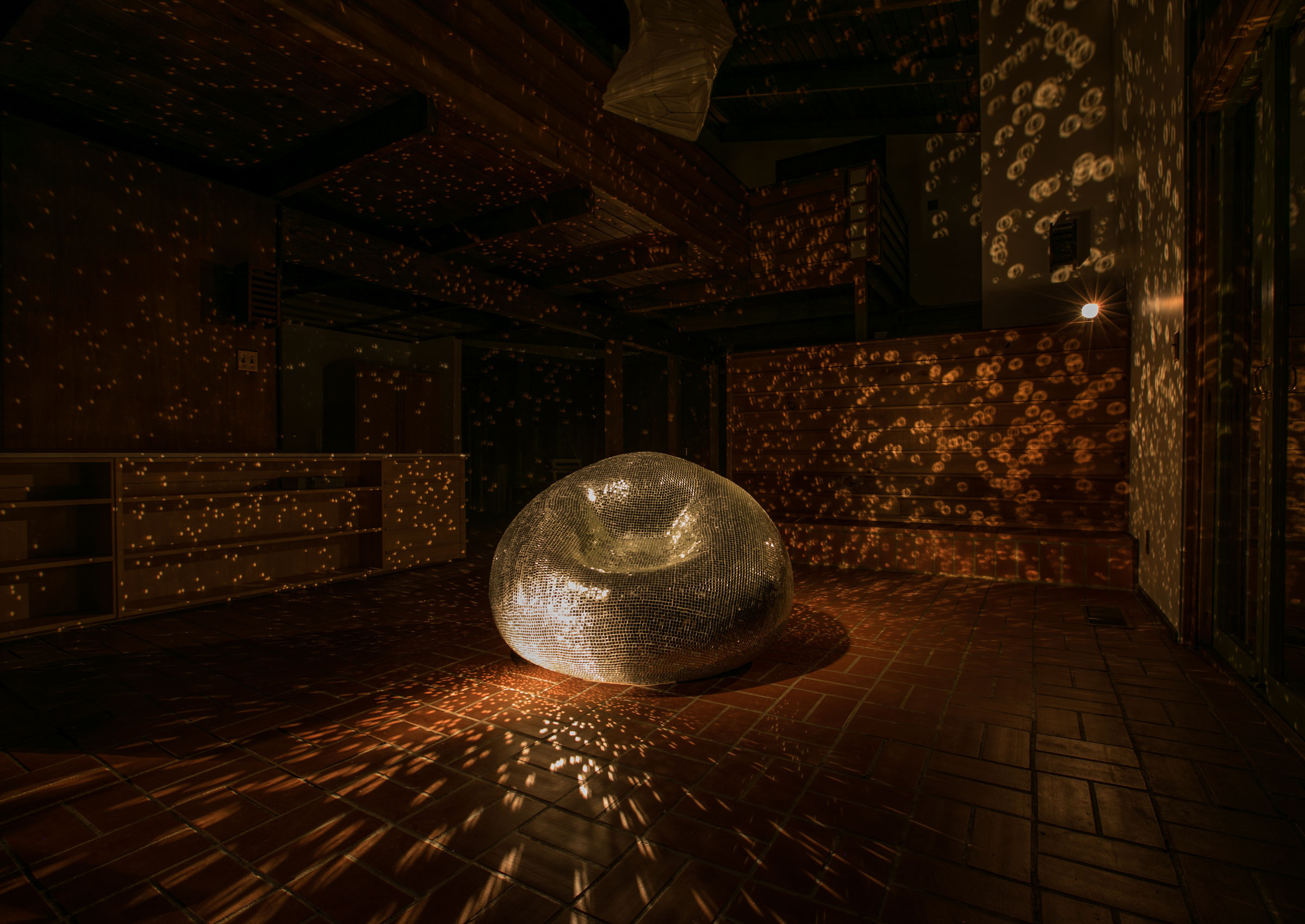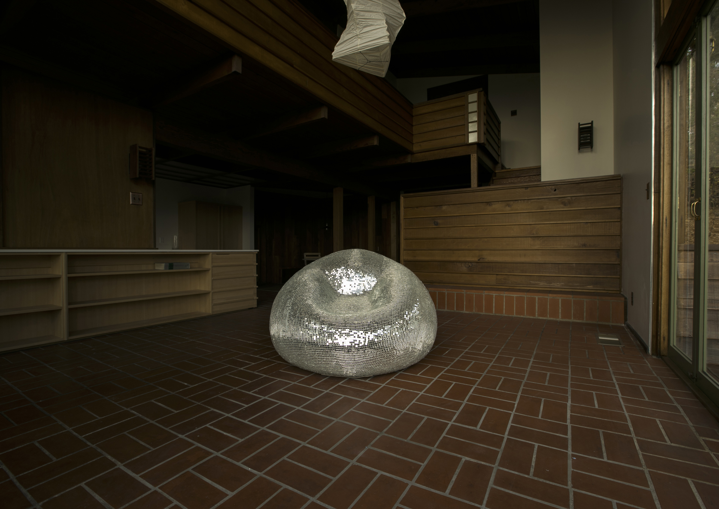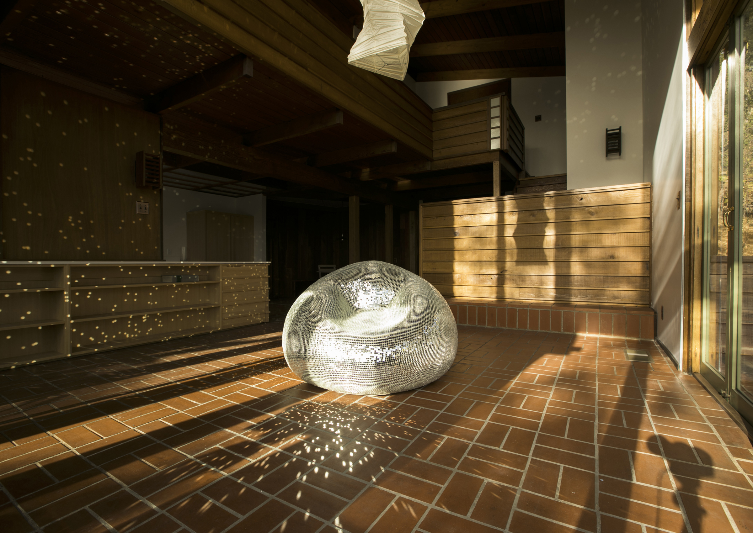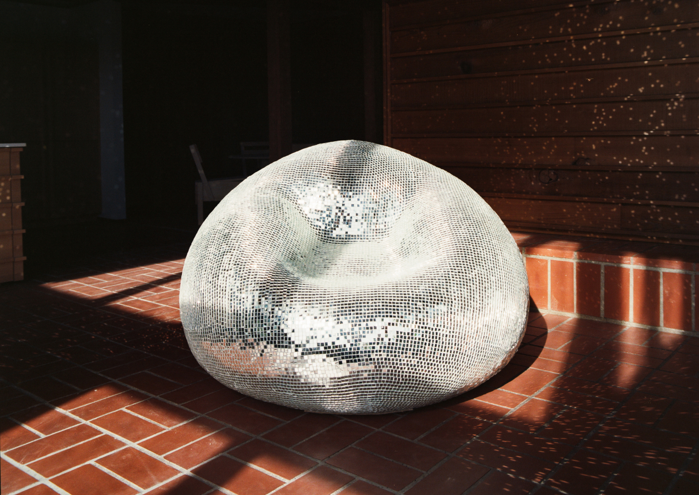 The chair is a hollow, thin-concrete monocoque shell, formed over an inflatable mold and covered in 30,000 individually handset mirror tiles. When placed in direct sun, it creates a "daylight disco" as the sun cycles throughout the day, year, and varying weather conditions. As no two days are exactly the same, each day is a new constantly changing light show.