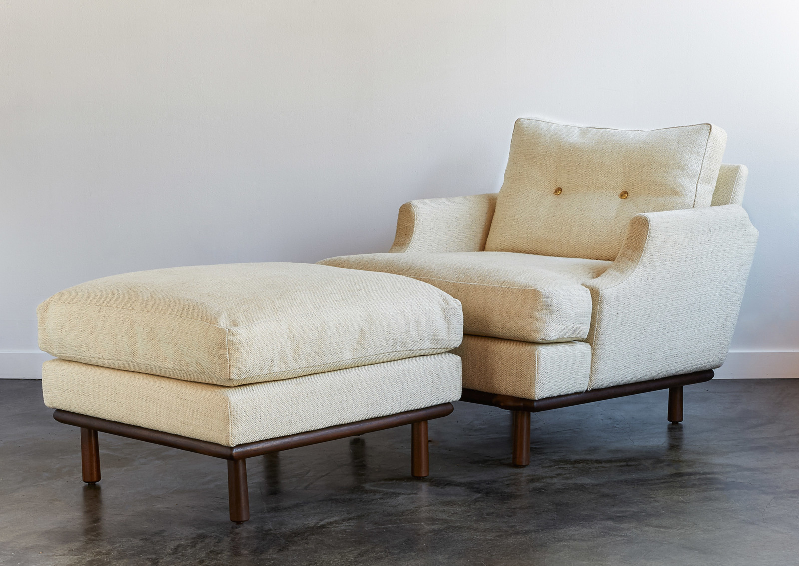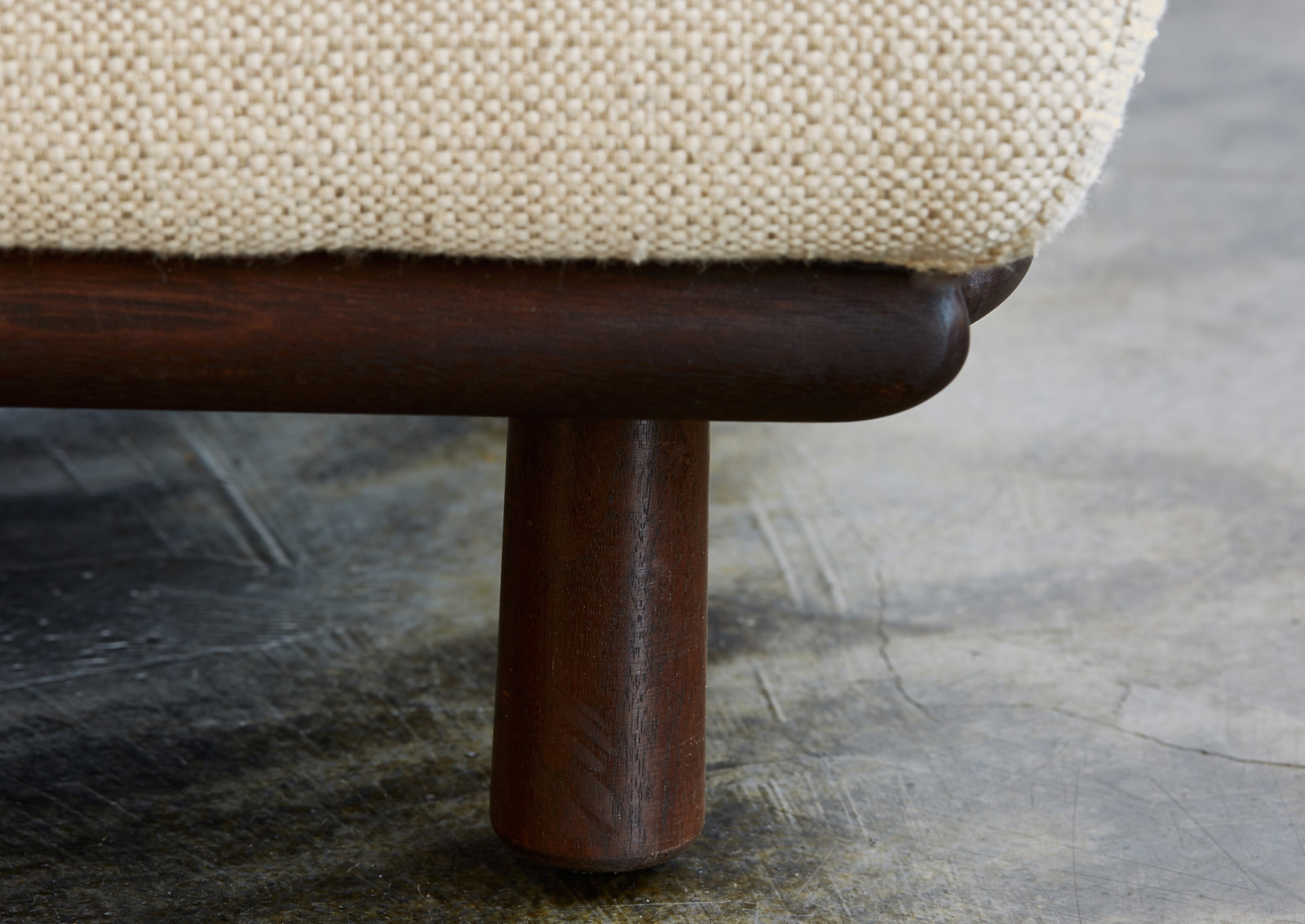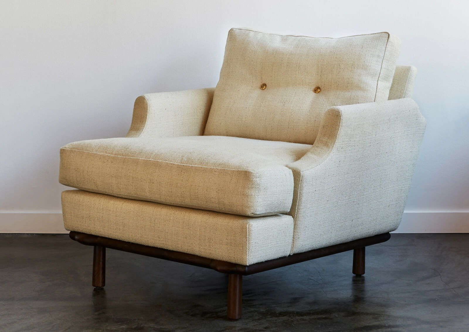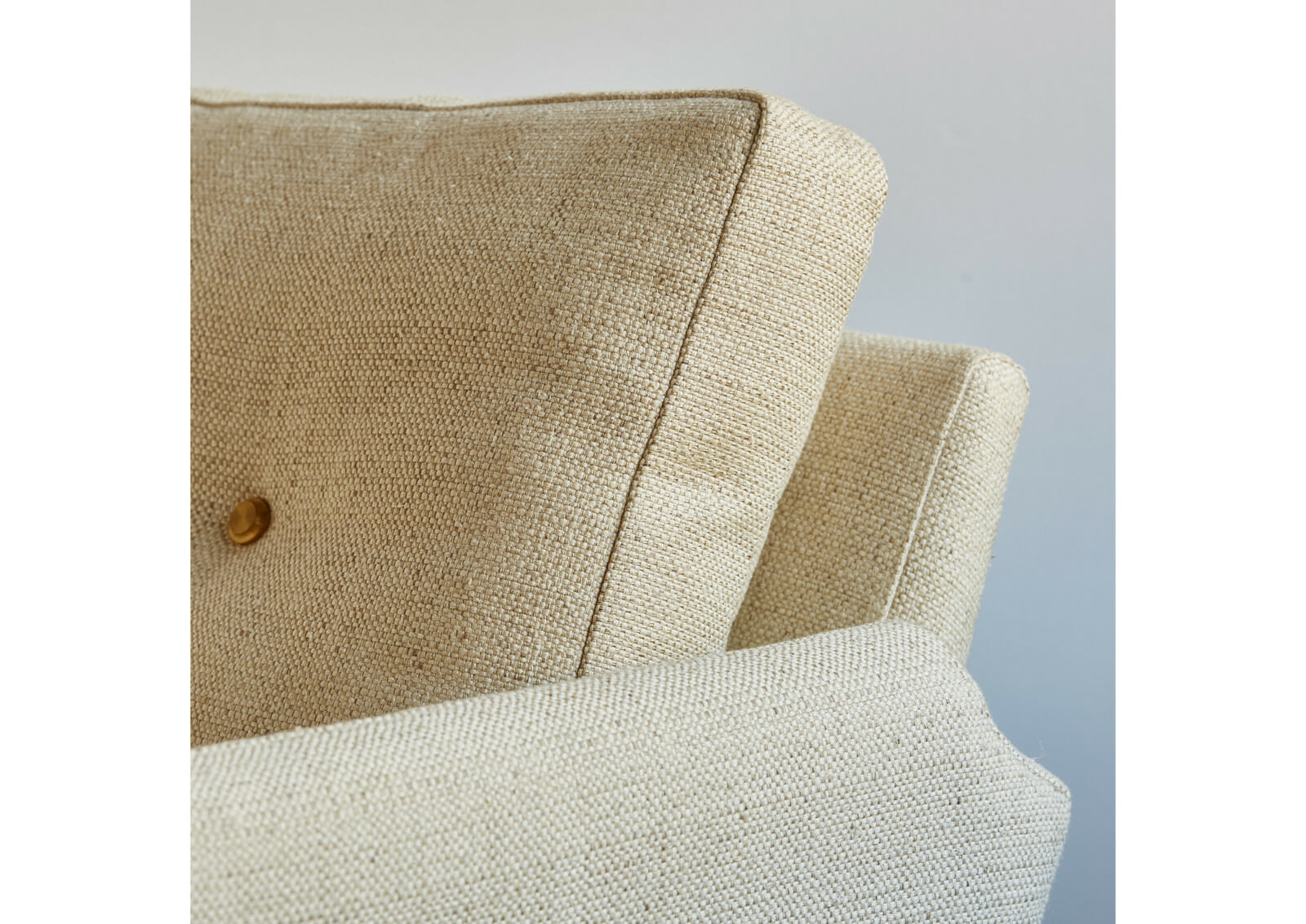 Jason Miller combines the proportions of mid-century sofas with Shaker woodwork and traditional upholstery detailing for The Future Perfect's Kent collection. These disparate influences come together to make a contemporary sofa that feels simple and elegant without being minimalist. The Kent armchair cushion has brass buttons on one side and upholstered buttons on the other side. Please inquire directly for more information on fabric material options.