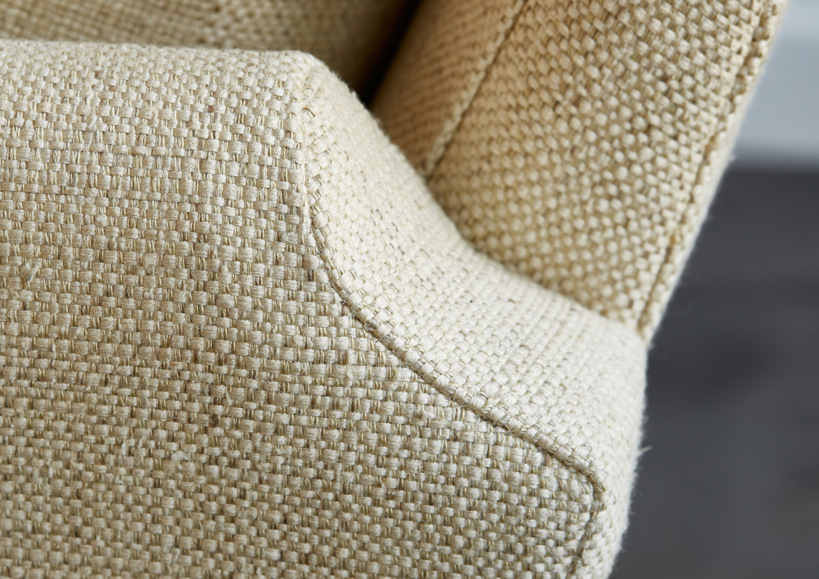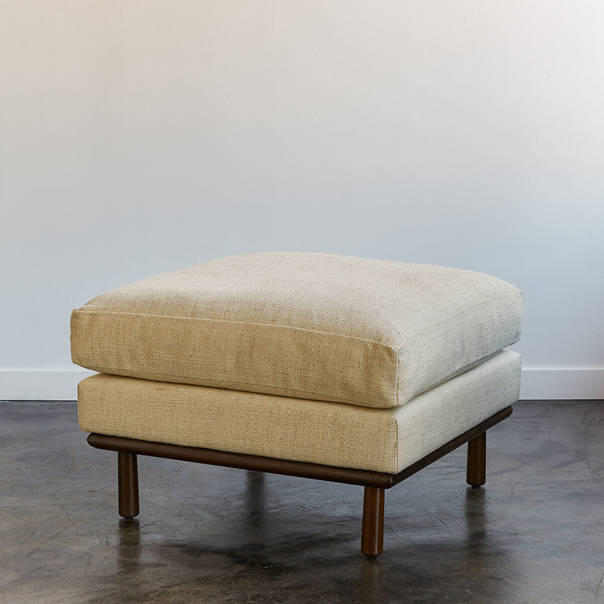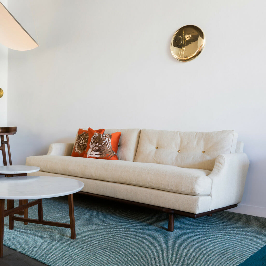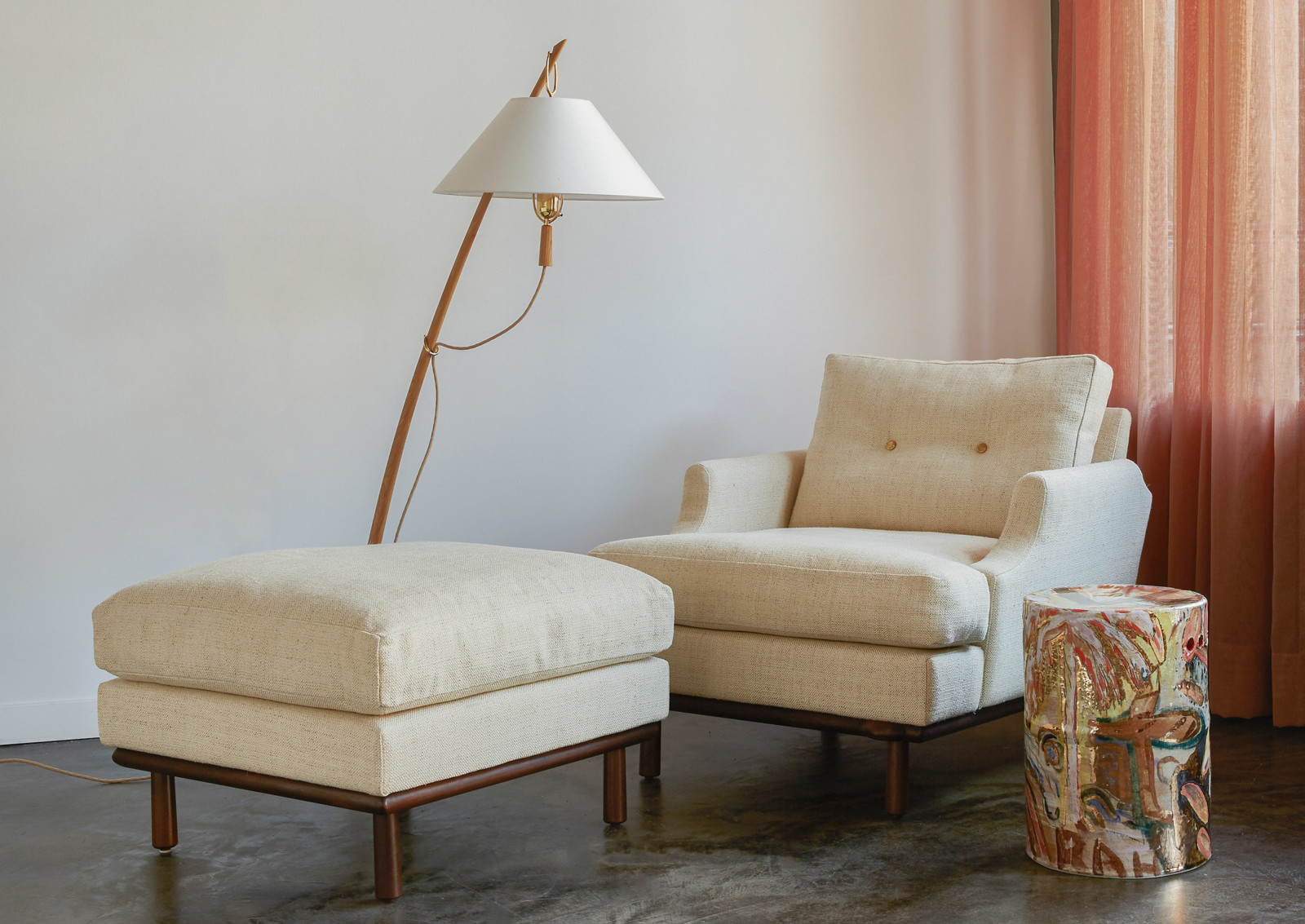 Jason Miller combines the proportions of mid-century sofas with Shaker woodwork and traditional upholstery detailing for The Future Perfect's Kent collection. These disparate influences come together to make a contemporary sofa that feels simple and elegant without being minimalist. The Kent armchair cushion has brass buttons on one side and upholstered buttons on the other side. Please inquire directly for more information on fabric material options.