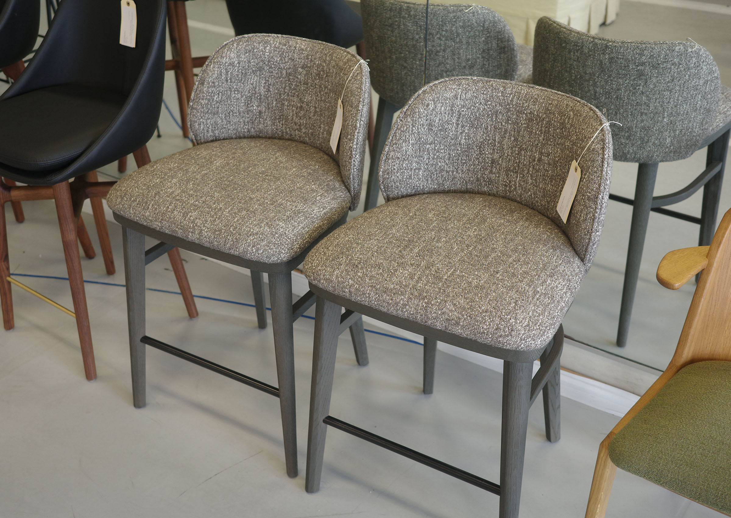 With the LUM, Christophe Delcourt showcases his passion for materials and profound allegiance to the work of the hand. The barstool is constructed of smooth oak, with upholstery in exquisite Grady fabric. The gentle taper to the legs and tastefully angled backrest make this a refined and elegant seating choice for any kitchen, breakfast nook, or dining room.