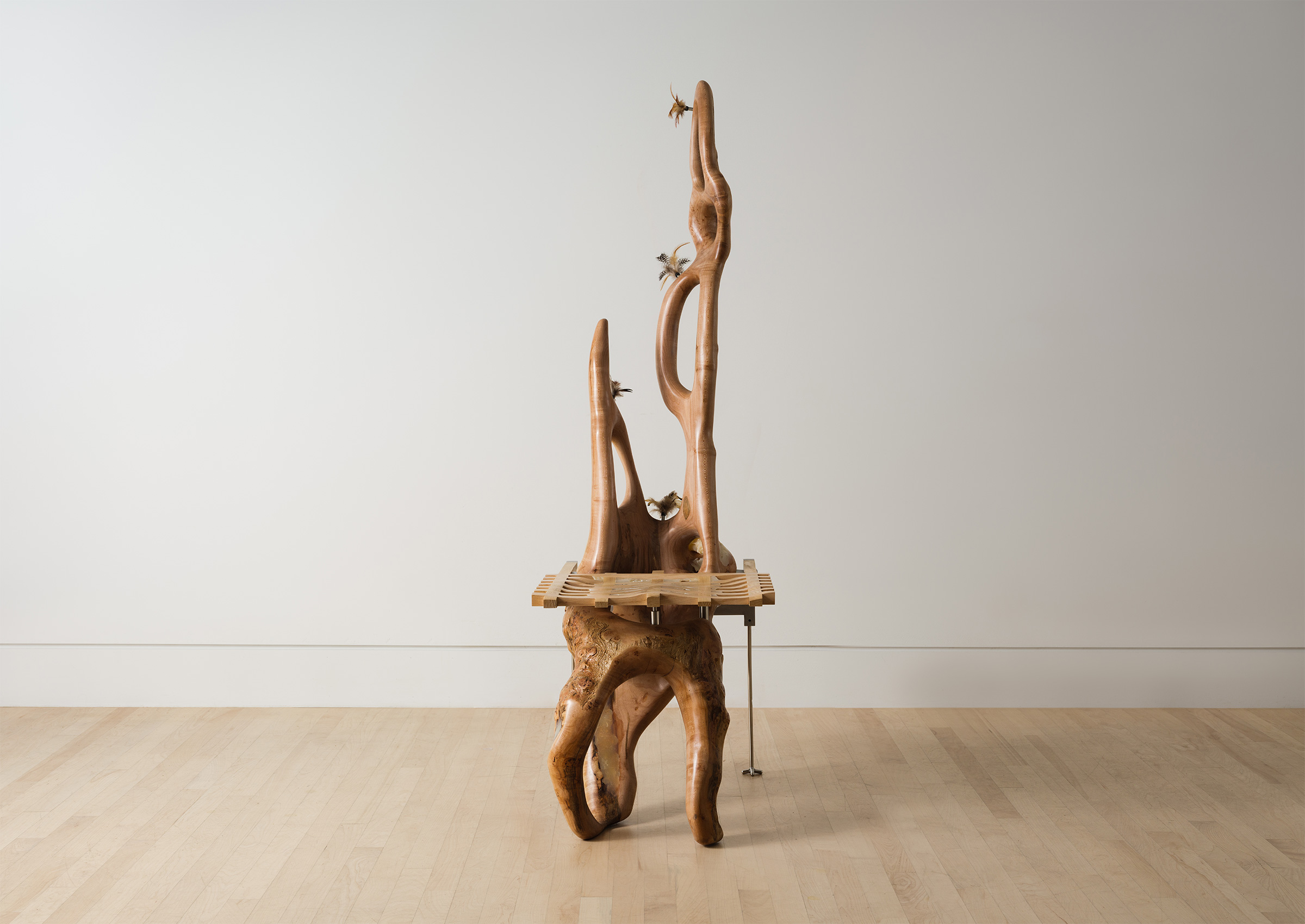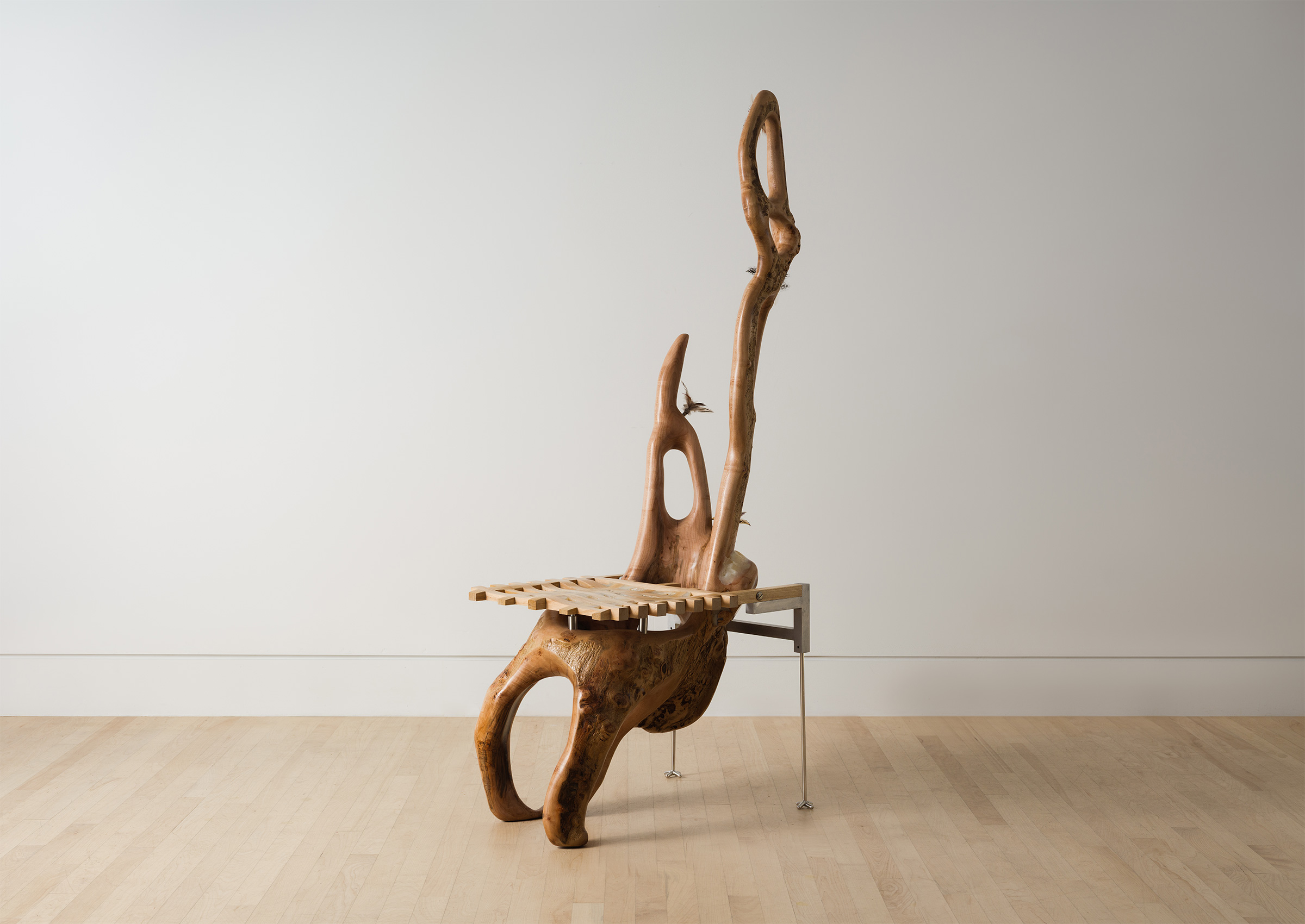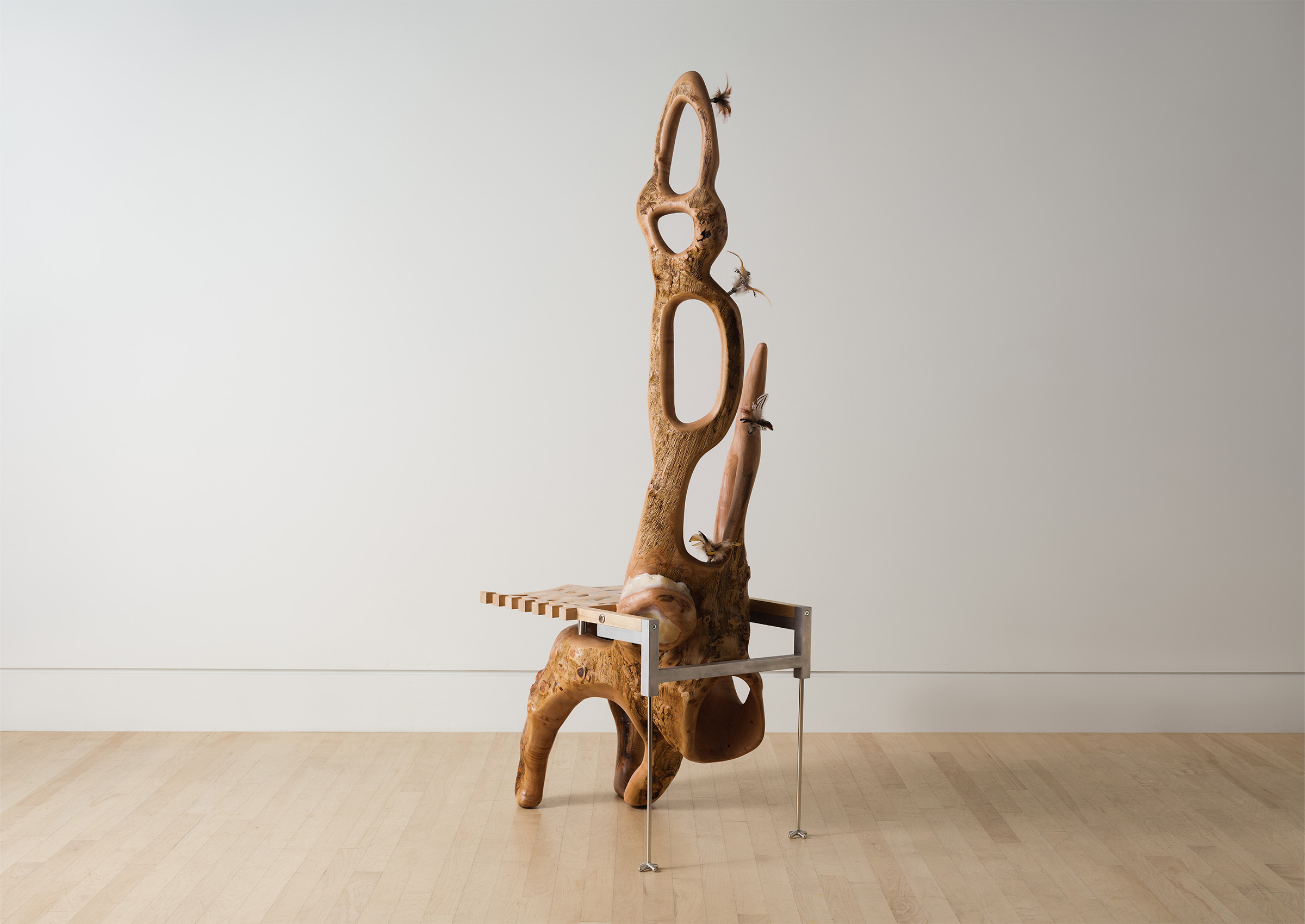 Crafted from a fallen Brooklyn maple branch, aluminum, and feathers, this chair reinterprets natural decay as renewal. It’s an ode to material transformation and the life cycle of design.
