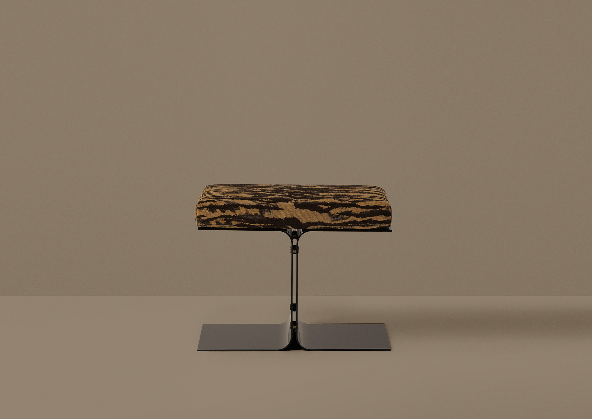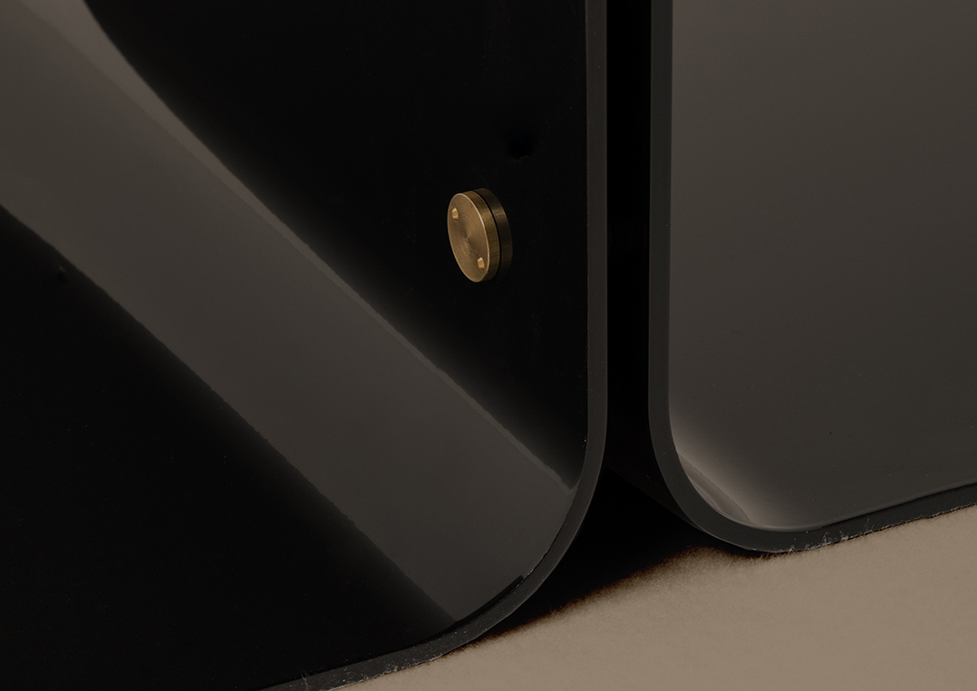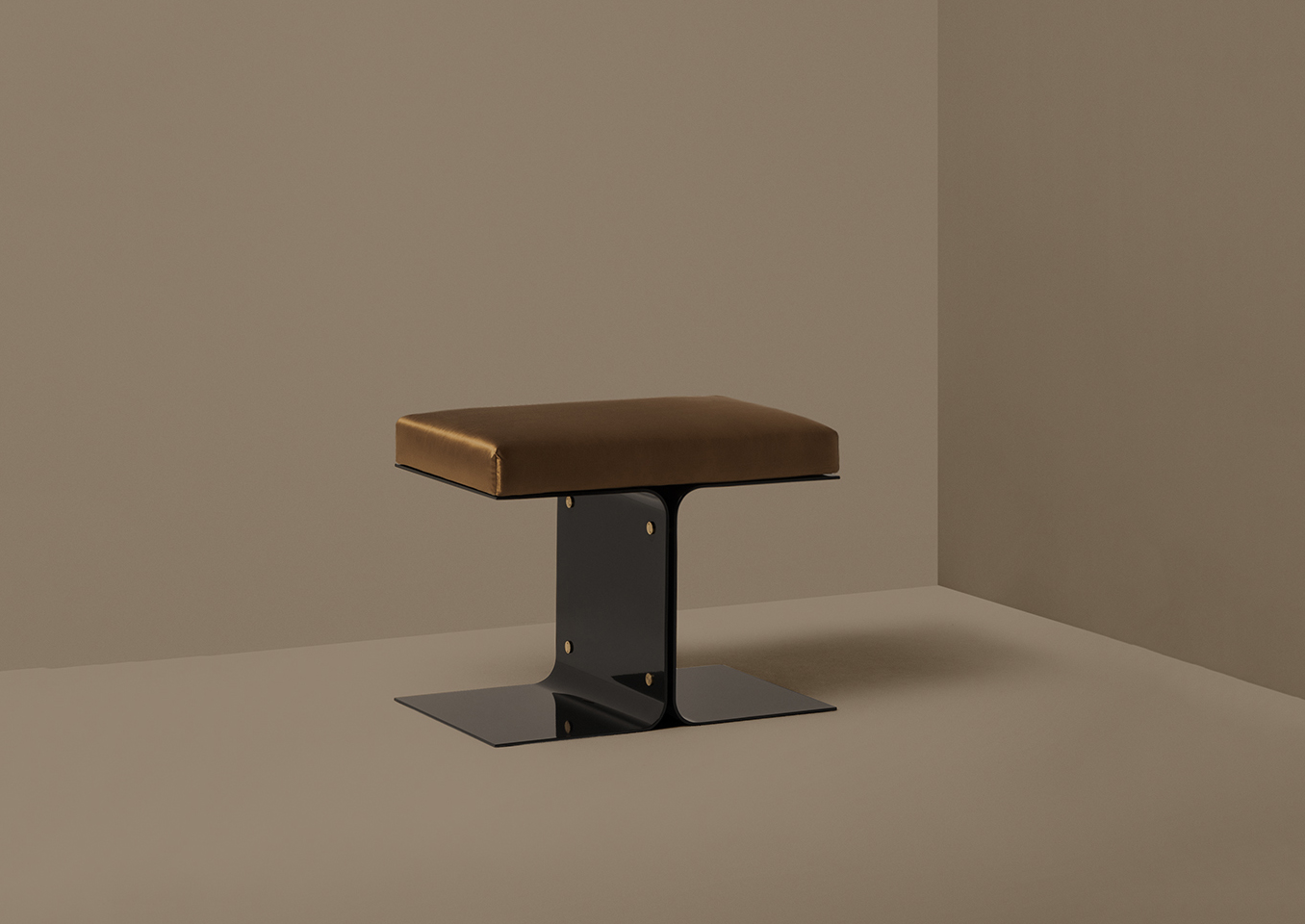 Designed in 2006, this striking piece evinces retro-futurism. This ottoman is composed of two C-shaped elements in matte black or painted metal. The fixing studs are in oxidized brass. Dimoremilano's Progetto Non Finito collection (unfinished in English) exemplifies the Milanese studio’s highly idiosyncratic approach to product design. The expansive collection, which continues to grow, is all about contrast and design tension: darkness and light, rough and smooth; and embellishment with restraint. With its commanding presence, each piece works individually or pairs exquisitely with other items in the collection.