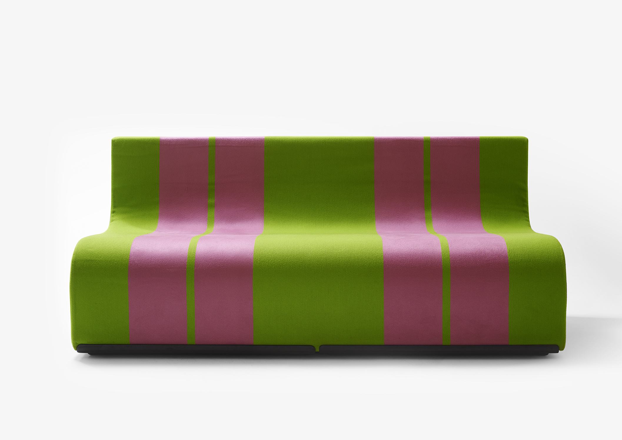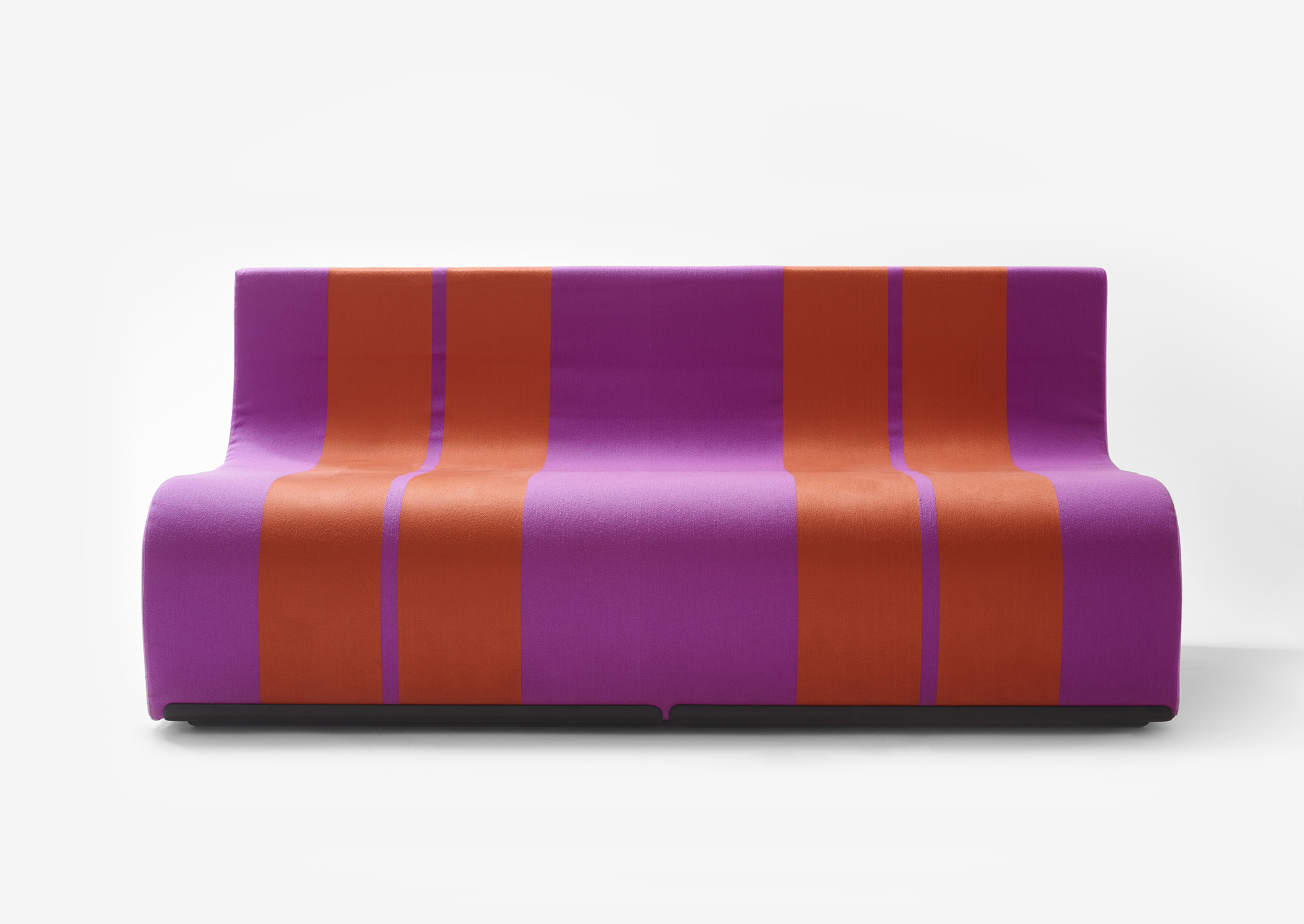 Sofo is a seat to place in a row, like a train, or to stack to build solid, colorful mountains. It is simply a block made with an S—shaped cut from a cube of polyurethane, covered with fabric featuring two large stripes. The result of a very simple operation, without wasted material or thought. It presents itself as a compact, abstract, colorful object that communicates the joy of living, like things that arrive from another world.