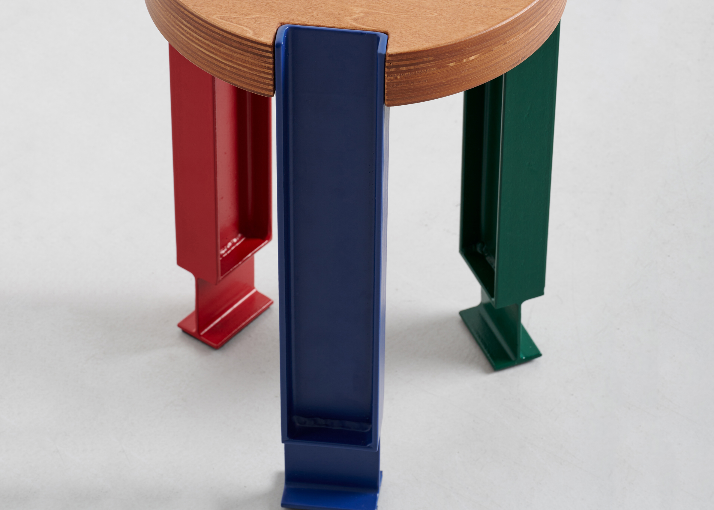 Stool with painted metal legs, in three different colors, seat in plywood.