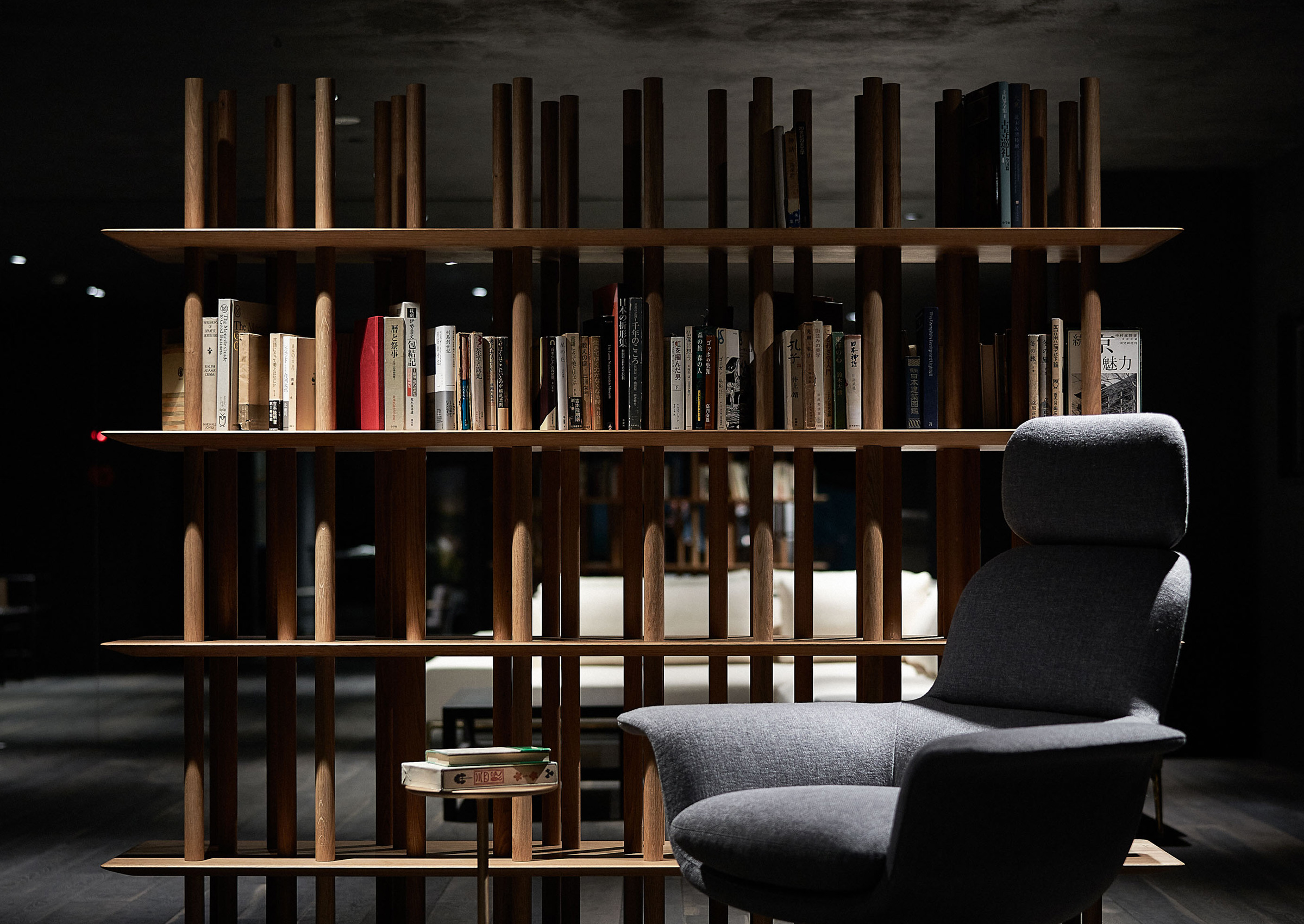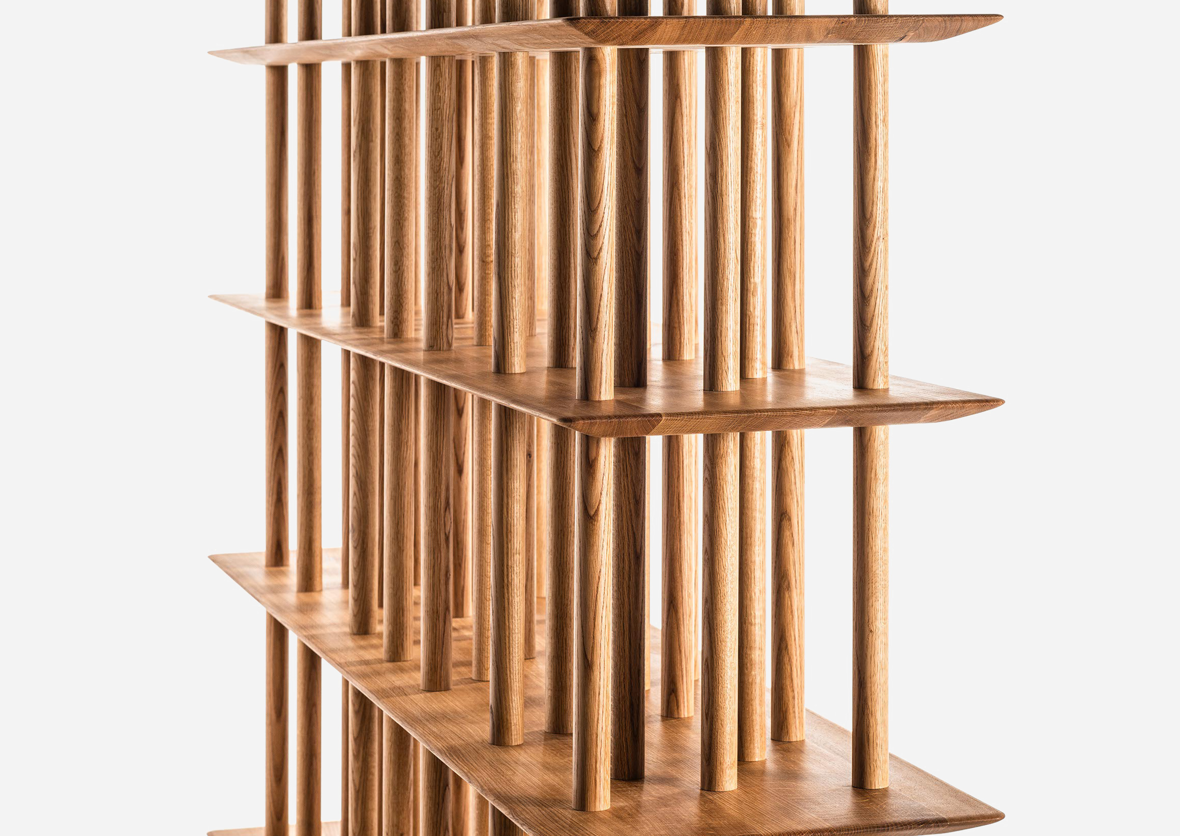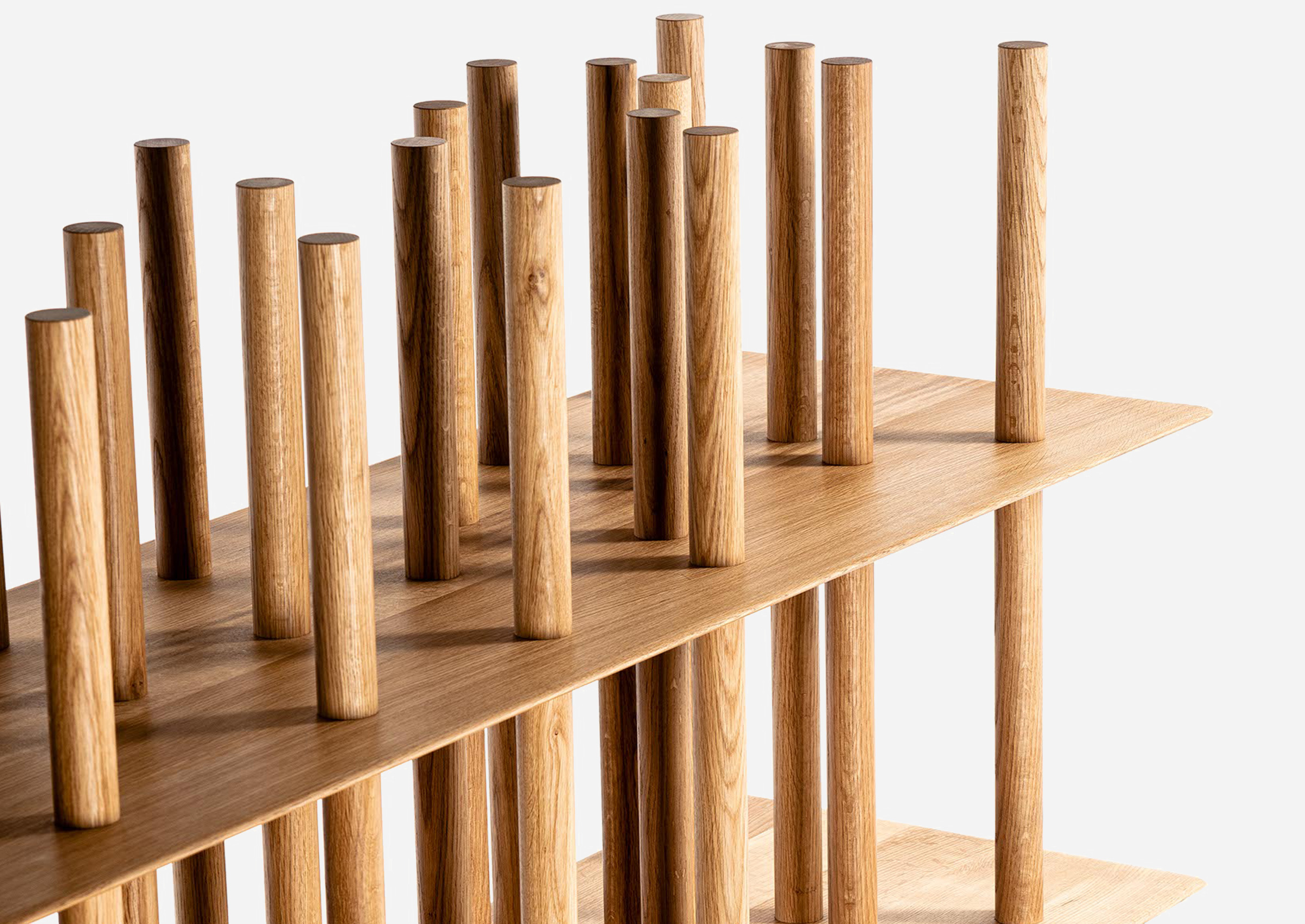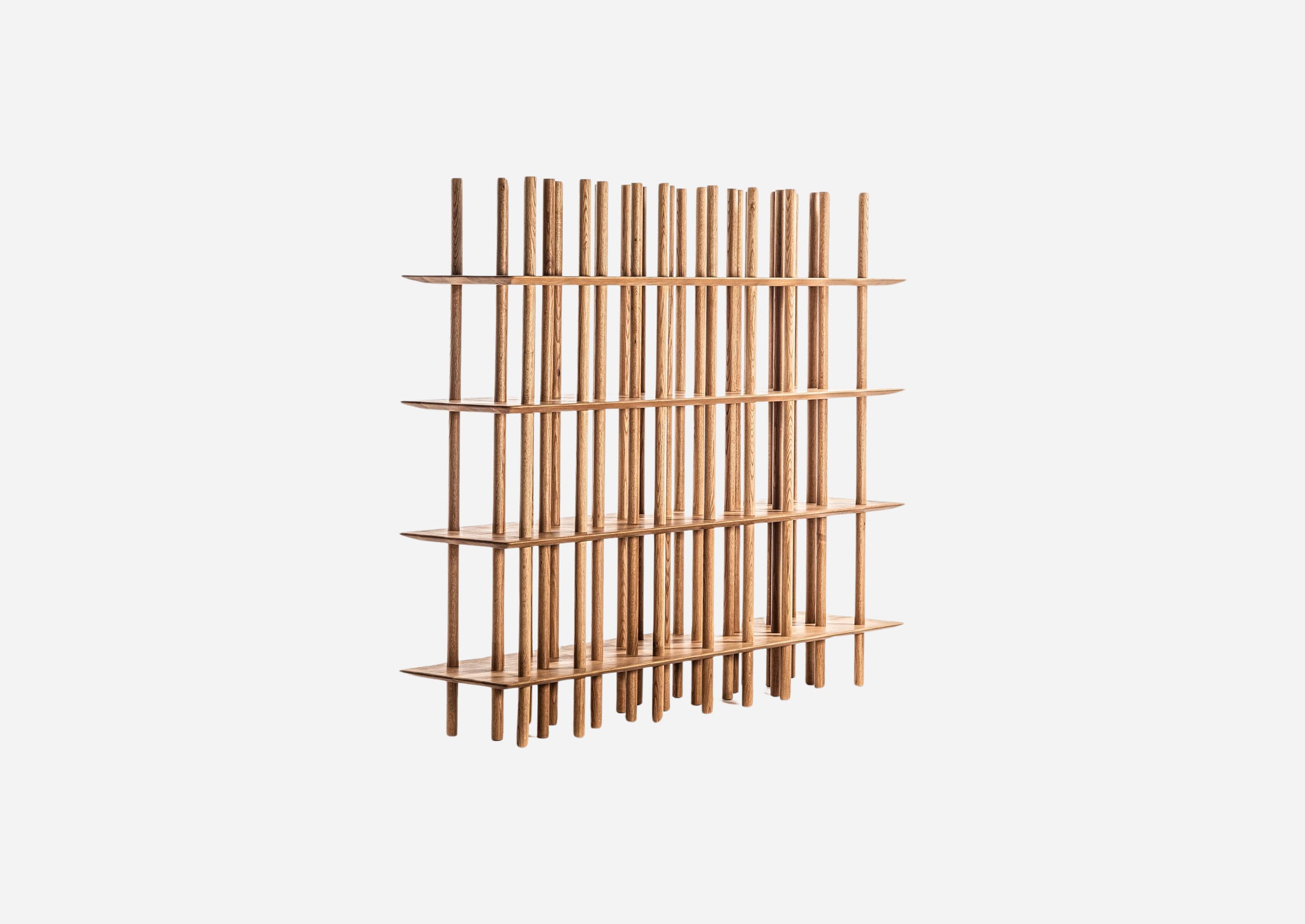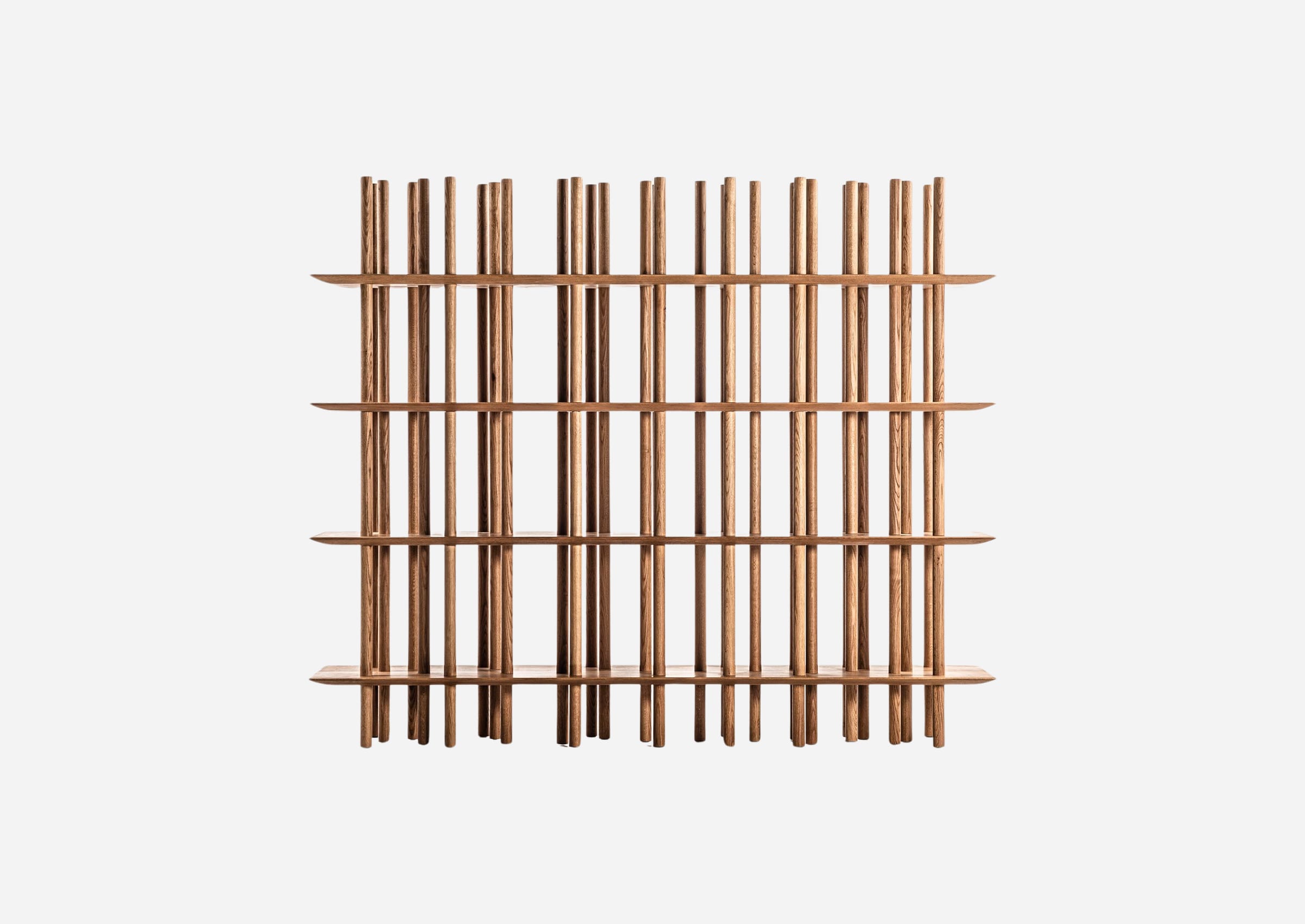 This shelf is inspired by the bamboo groves of Arashiyama in Kyoto. It retains traces of the Heian era of over a thousand years past, enveloped in an elegant and profound atmosphere. The round pillars patterned after straight bamboo are spaced for a feel of comforting sunlight streaming through trees while also serving as a partition that gently separates the sections. The presence of this shelf, which rhythmically holds books, gives a soft accent to any space.