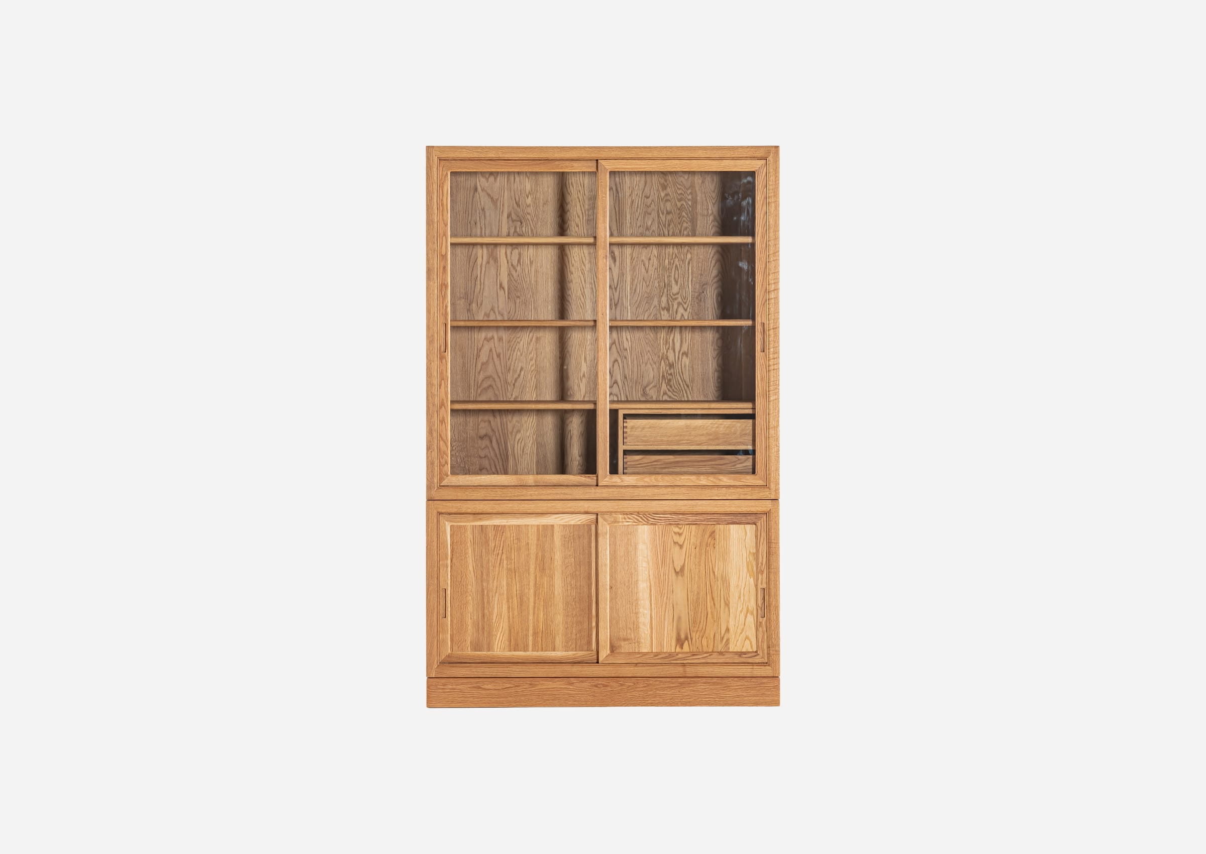 Designed as a contemporary reinterpretation of the traditional kitchen cabinet, it combines glass doors in the upper section with wooden doors below. The sliding doors ensure practicality, making it easy to use even in compact kitchen or dining areas where space is limited. The upper section, with its glass doors, serves as both storage and display, offering a refined setting for tableware, books, or cherished objects. Discreet drawers also provide convenient space for cutlery and small essentials.