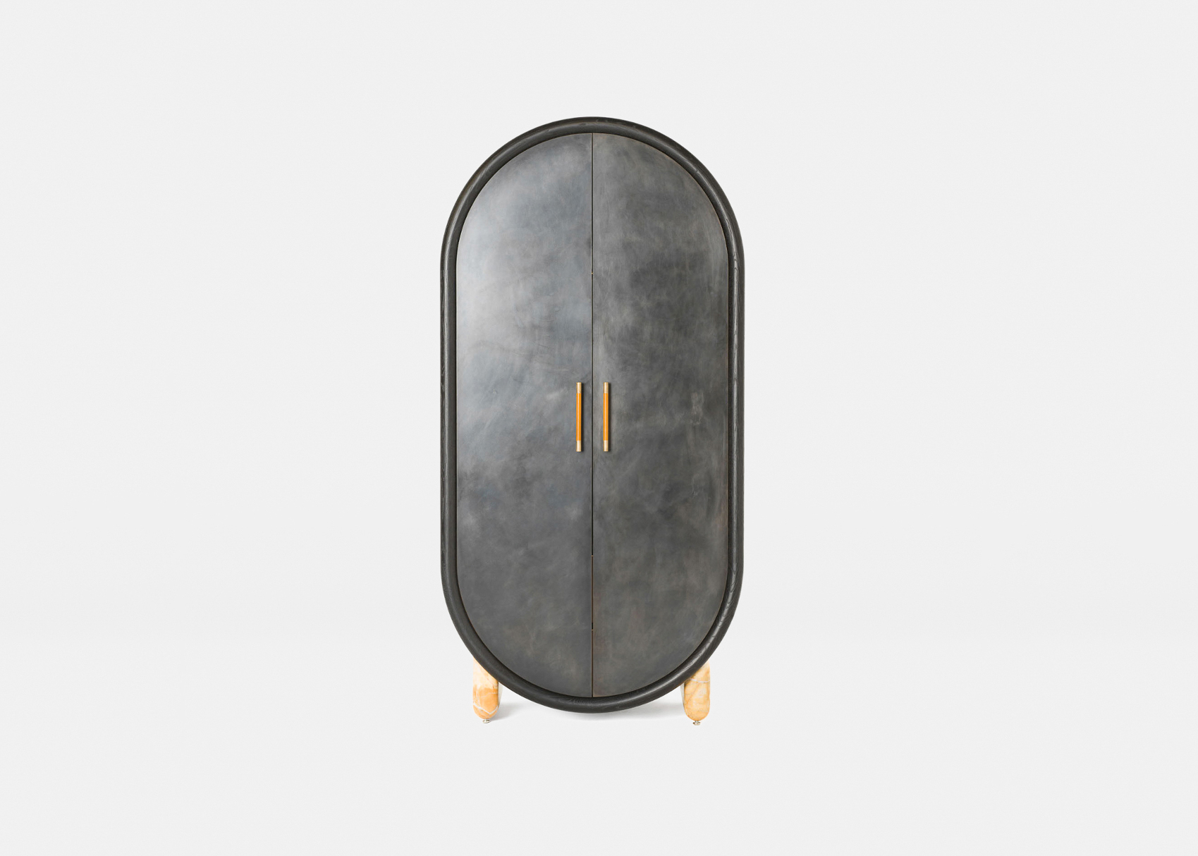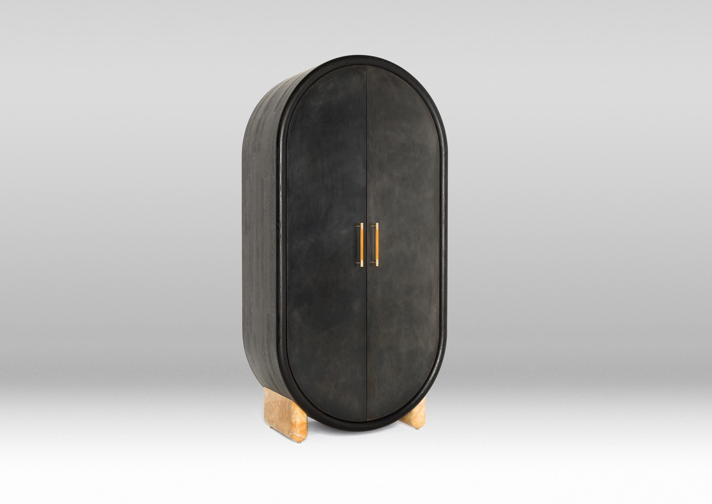 Pushing forward Orior’s ideation on shape and materials, the Artic wardrobe plays with an array of hand-crafted techniques. The soft bullnose edge frames the industrial blackened steel doors and creates an elegant touch to the dark, raw steel. The solid Giallo Sienna marble legs replicate the elongated rounded form of the piece. Brass leather-wrapped handles open up to a mirrored chest and clothing rail. The continuation of the leather-wrapped handles translates into the interior drawers and side panels.