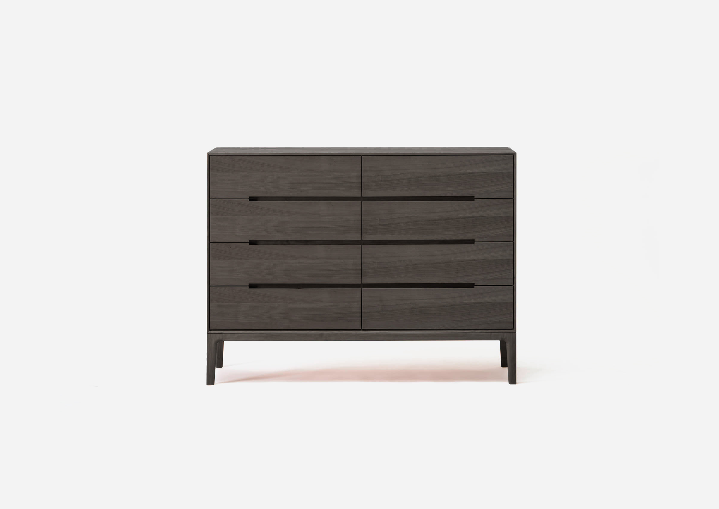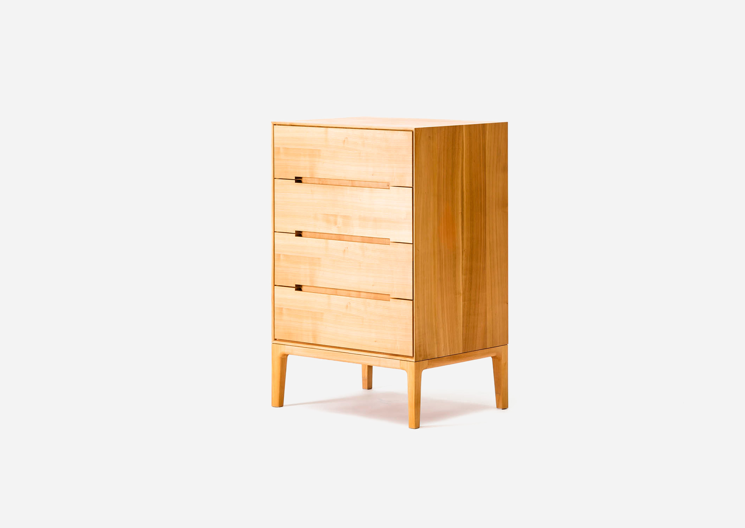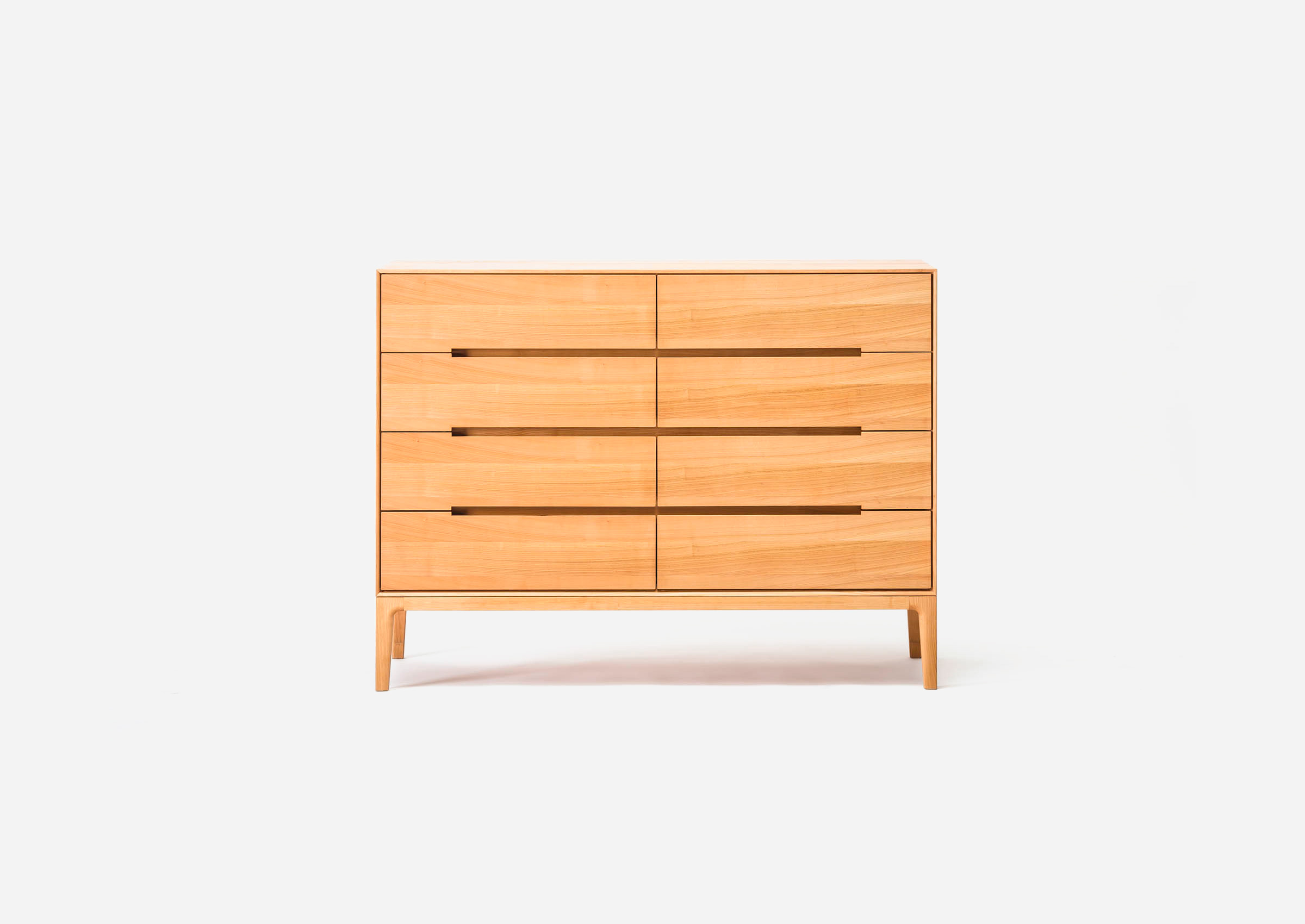To make it look like a cube that offers a solid impression of wood, the entire main body is made using thick wood veneers so that it conveys the natural atmosphere of the material. The sense of unity comes from the horizontal lines of the wood grain. The horizontal handholds of the cabinet, made by minimally hollowing out slits, add a transversely extended impression to the cabinet where the design would normally look heavy because of the materials.