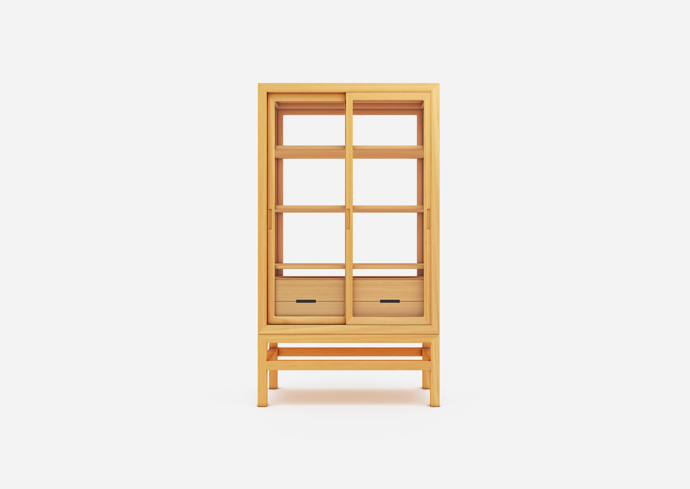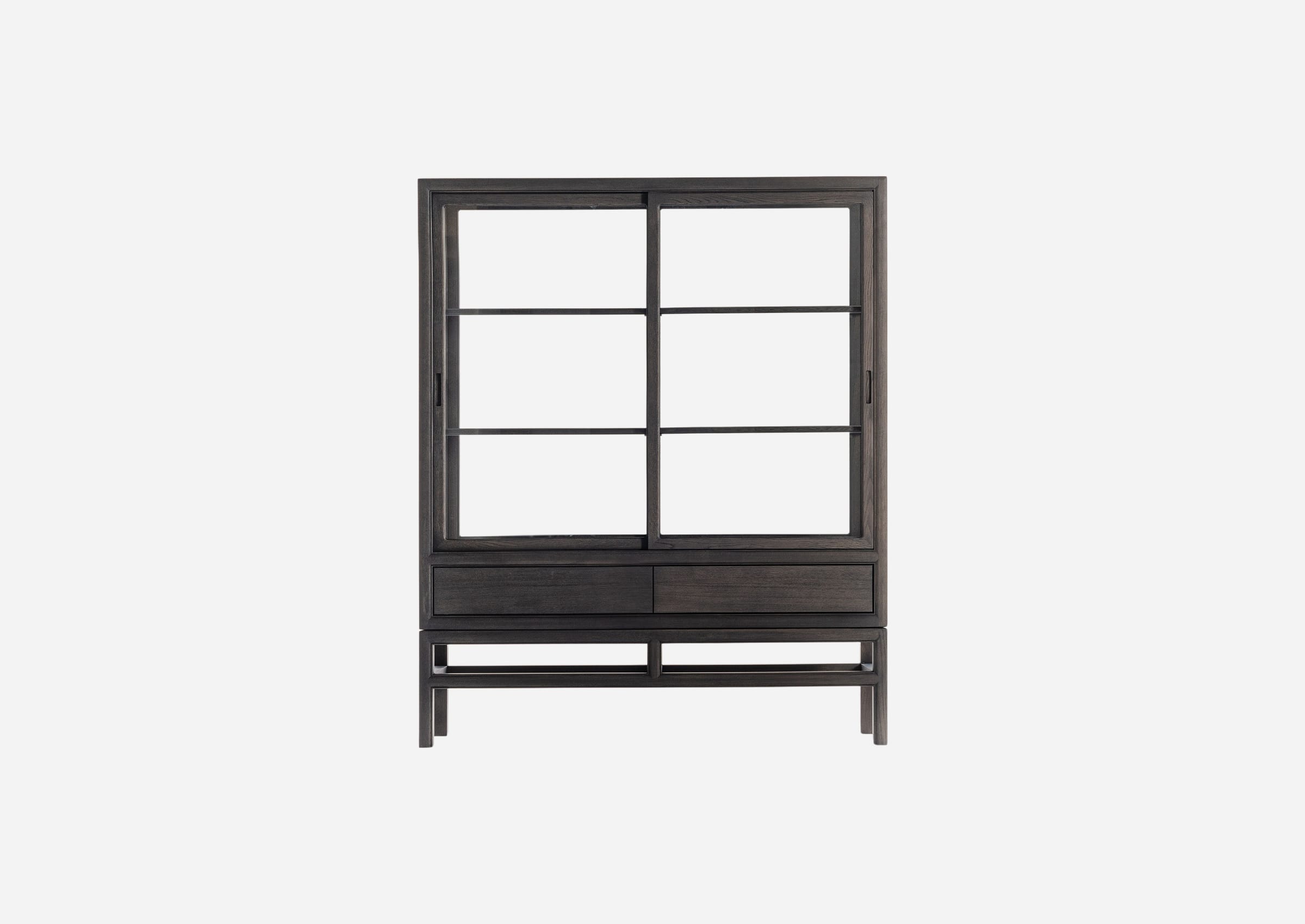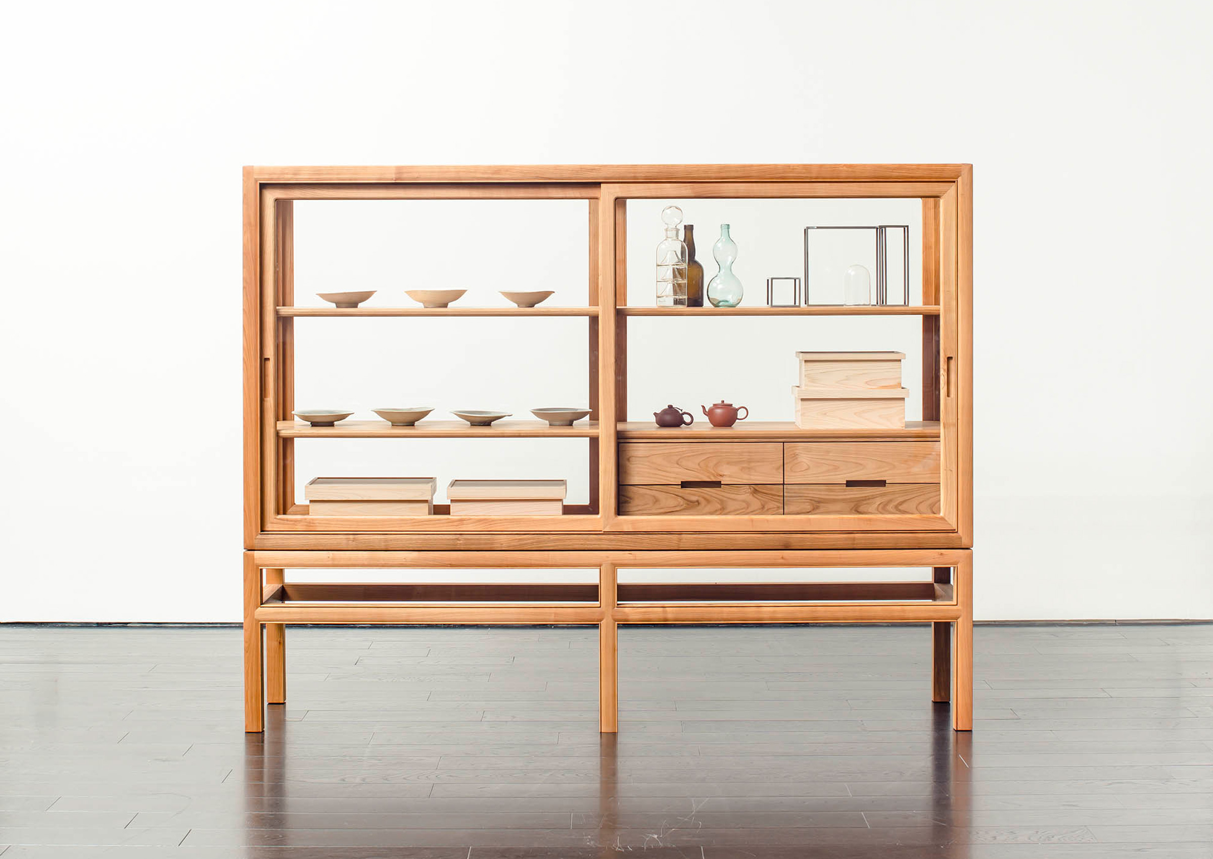 Released in 2015 as a cabinet that beautifully showcases pieces like collection cases in museums, museum cabinet for private collection has become a symbolic product of our craftsmanship. The frame composing the body incorporates traditional Japanese assembly methods, emphasizing strength and design. We gave the outer surface of the frame a gentle bulge that replaces the hard expression common to cabinets with a soft impression. Classic beading decoration lends a Japanese and Oriental air.