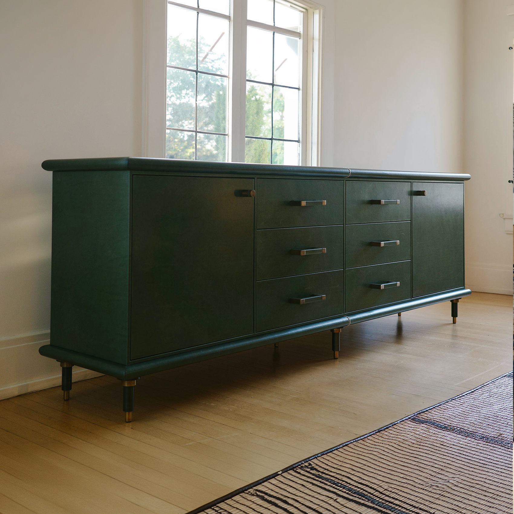 A six-drawer dresser with a singular presence. Fully wrapped in Italian leather with hand-stitched detailing, aged brass hardware, and a solid wood interior. The subtle contrast of soft leather, linear form, and geometric bronze details define the Bembo dresser. Available in numerous colorful leather and hair-on-hide options.