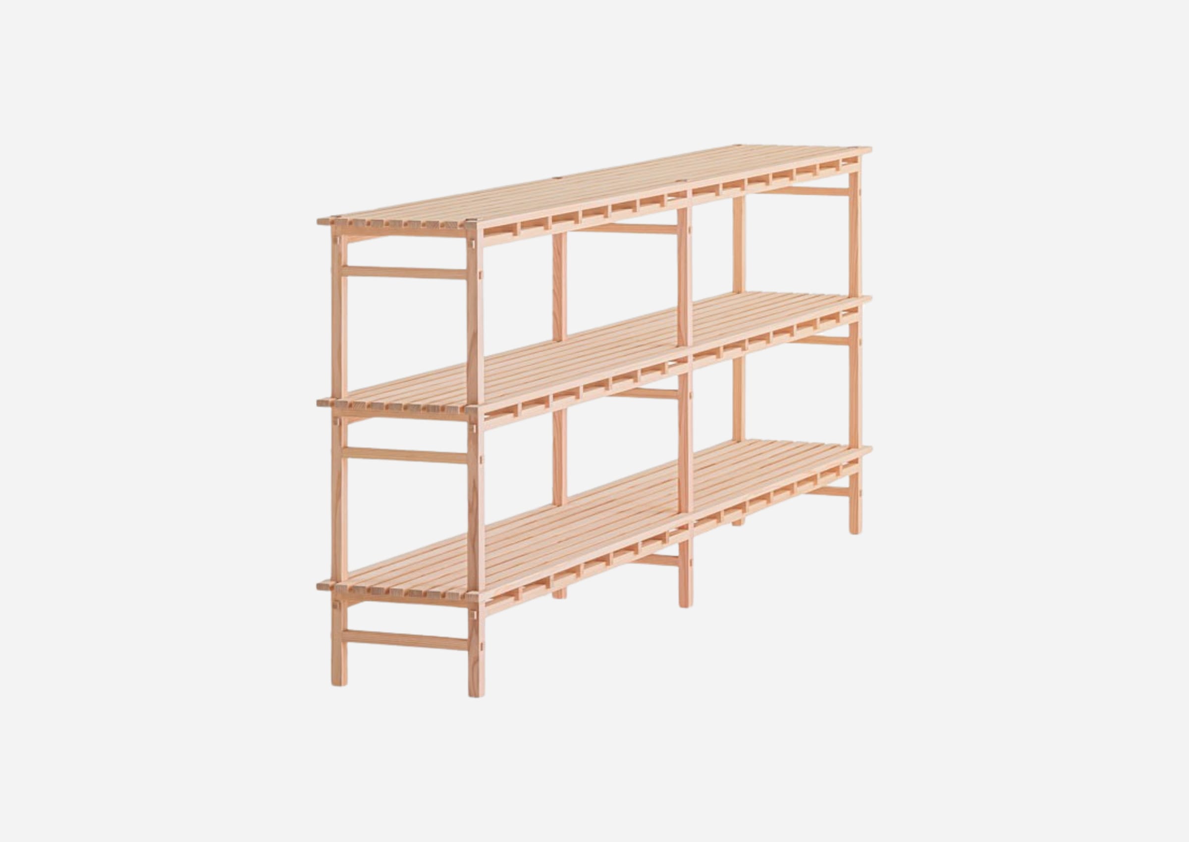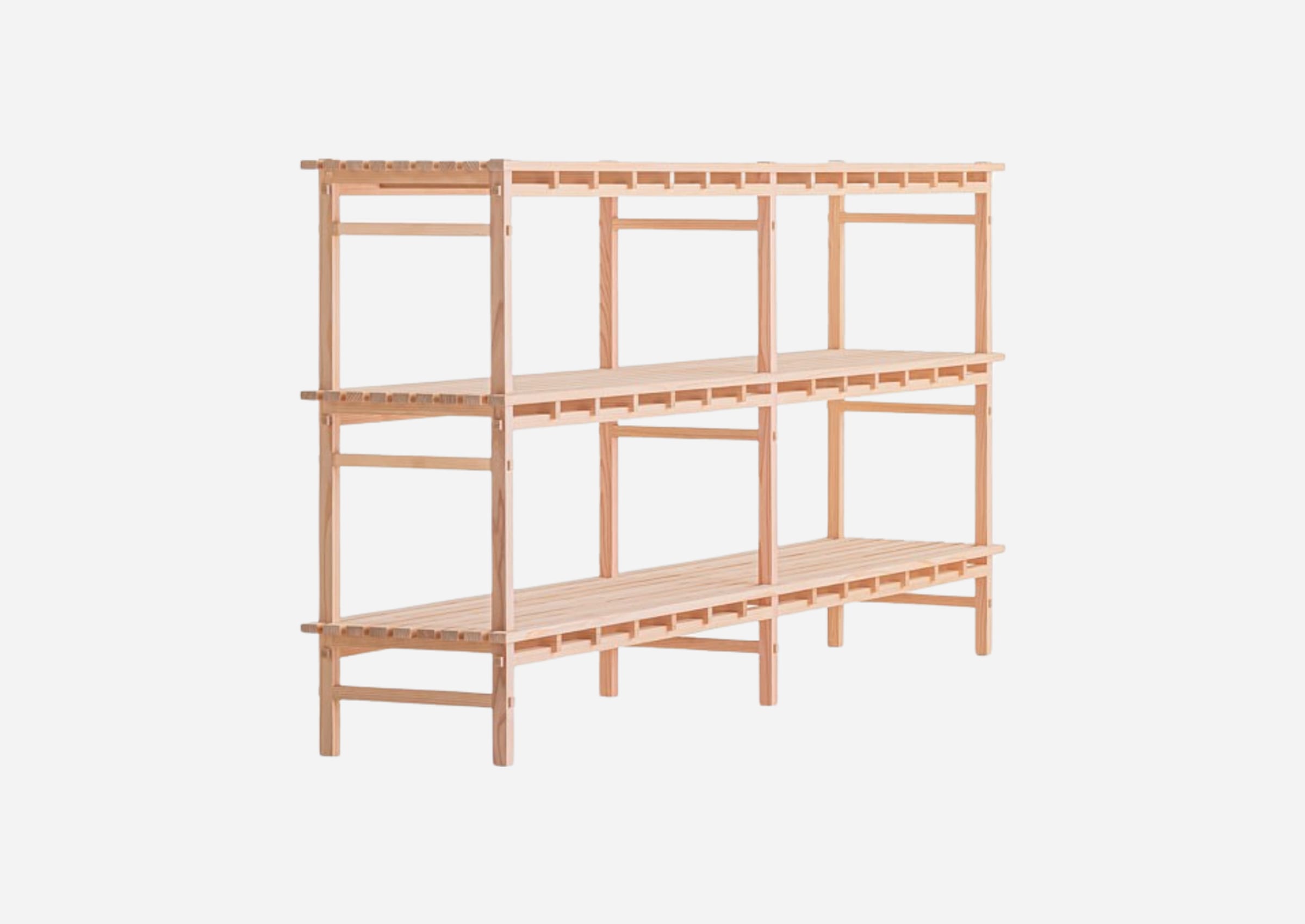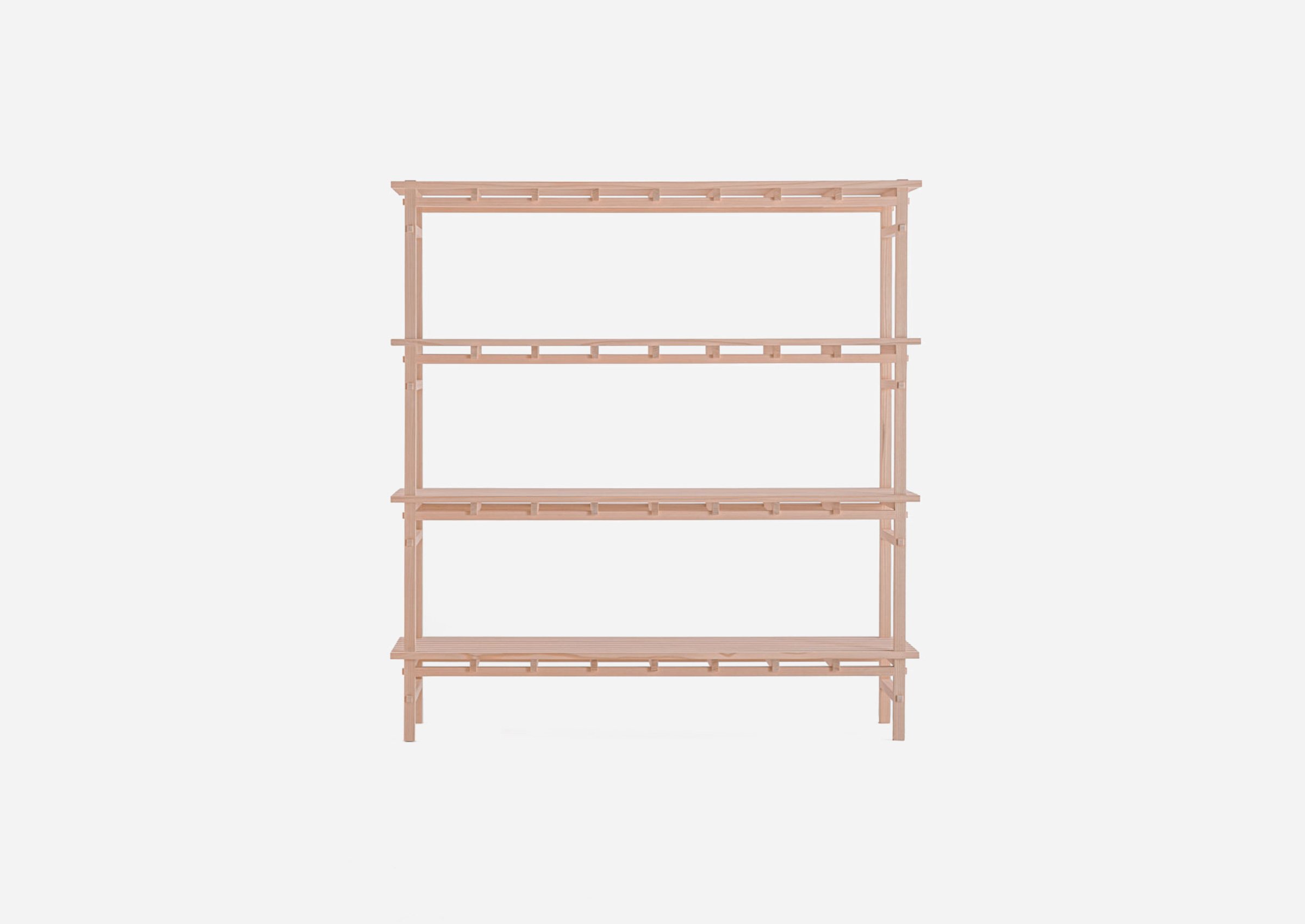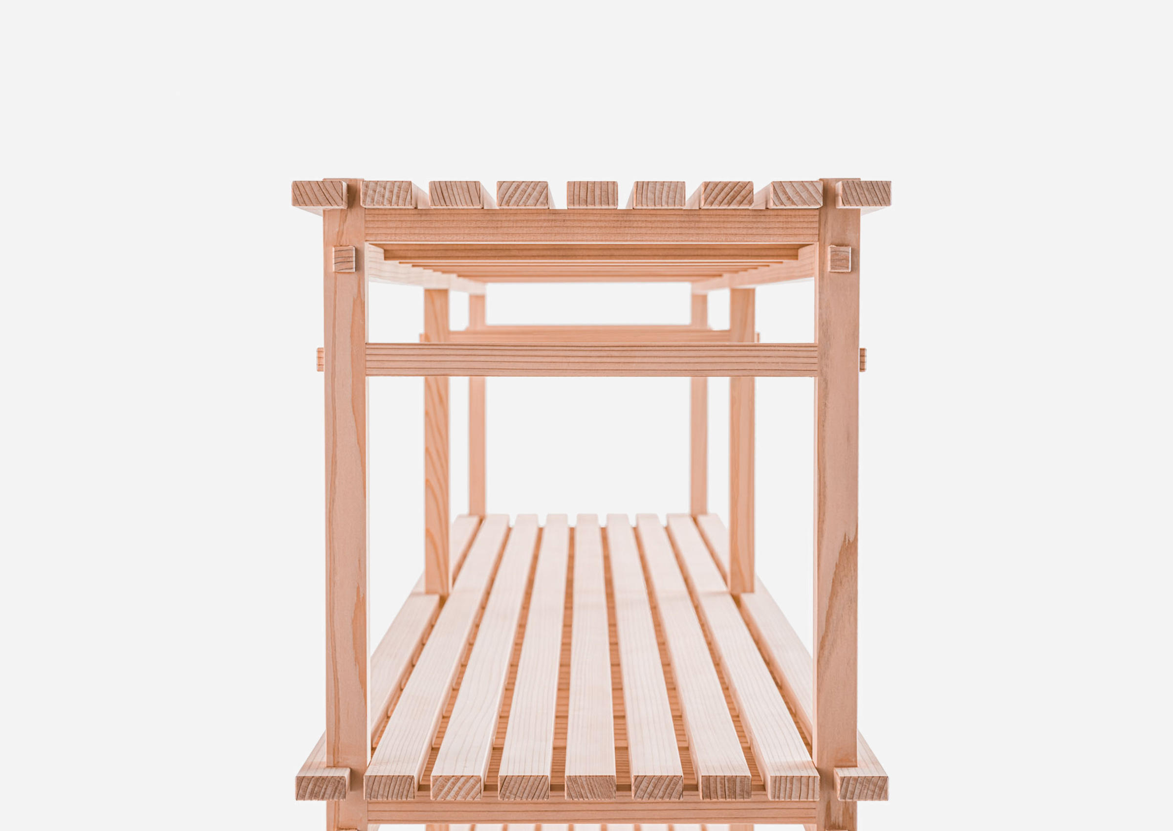 A shelf that reflects the Kigumi philosophy while maximizing the material’s potential for thinness and lightness. The slatted shelf creates a subtle tension with the warmth of the cedar, while its contrast of light and shadow imbues the space with a gentle quietude.