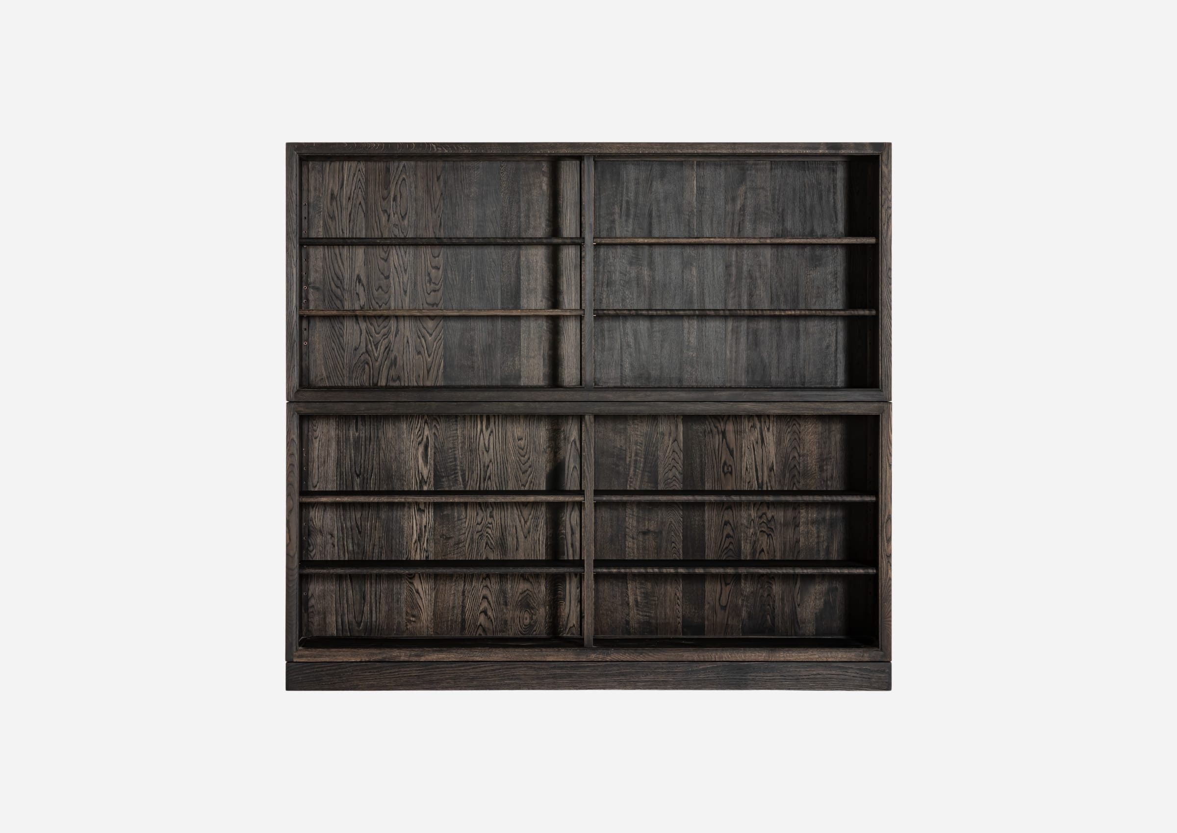 As the name suggests, this variation is designed specifically for storing books and records. Featuring richly textured solid wood for the top, side panels, and back, it achieves a minimalist aesthetic that removes unnecessary ornamentation while maintaining a strong presence in the space, enhancing the backdrop of the stored items. The two-tiered composition recalls the classic form of a mizuya tansu, bridging the past and present in a timeless silhouette.