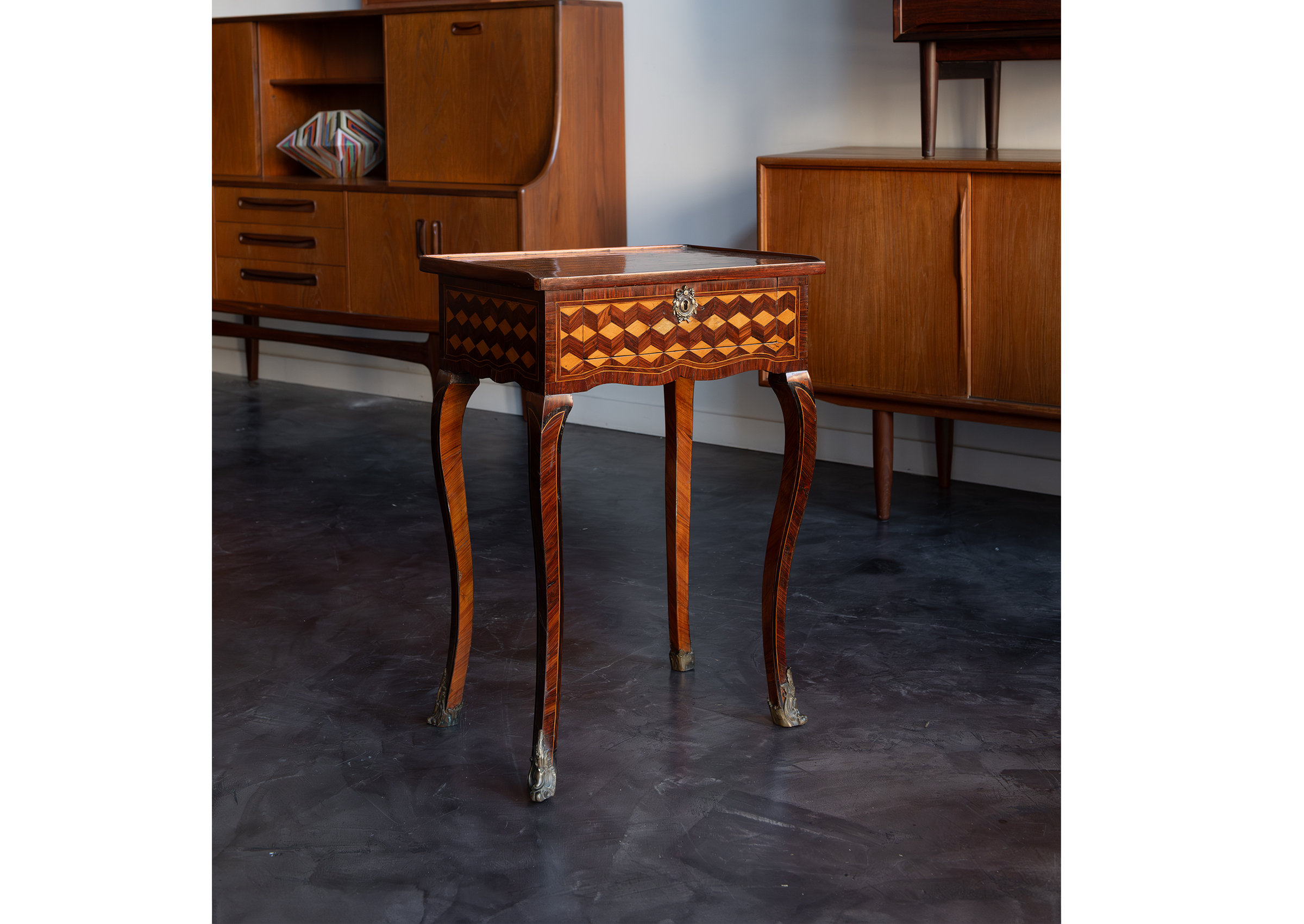 This Mid-18th Century Louis XV Transitional Parquetry Side Table in rosewood and satinwood is distinguished by its materials and period detailing. Designed for everyday use, it offers practical storage or surface space with a refined, collected presence.