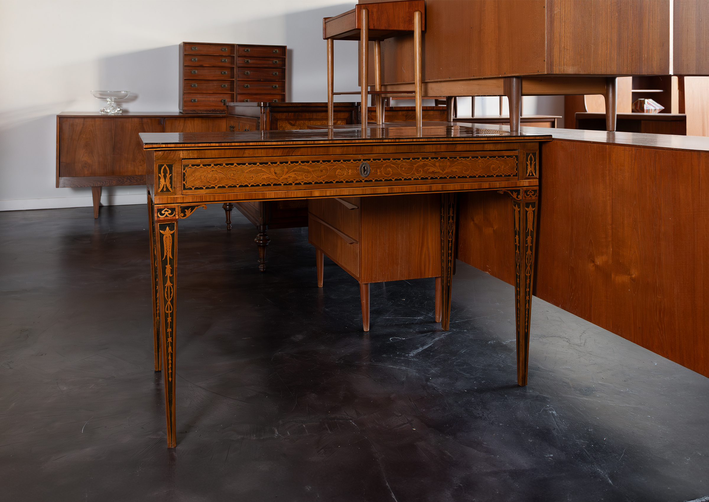 This rare 18th Century Italian Writing Desk in the style of Maggiolini features satinwood, ebony, rosewood and walnut marquetry. Distinguished by its materials and period detailing, it is designed for everyday use and offers practical storage or surface space with a refined, collected presence.