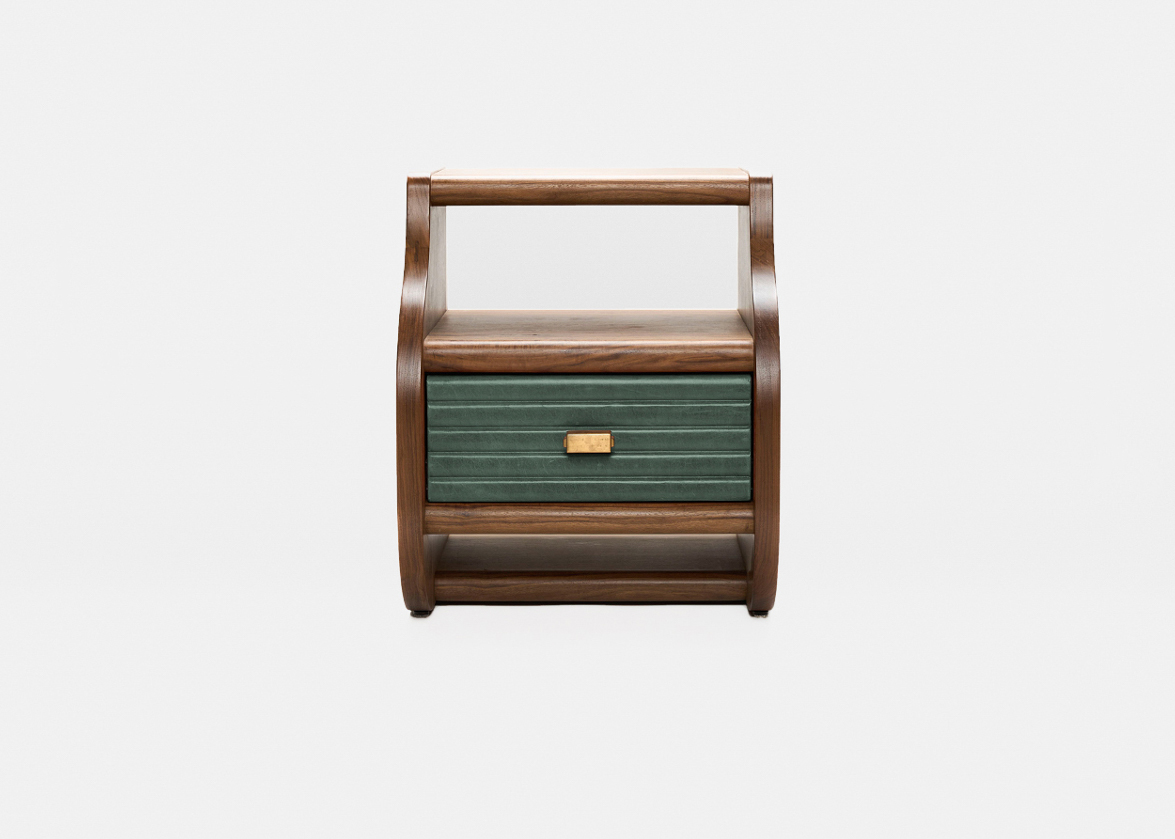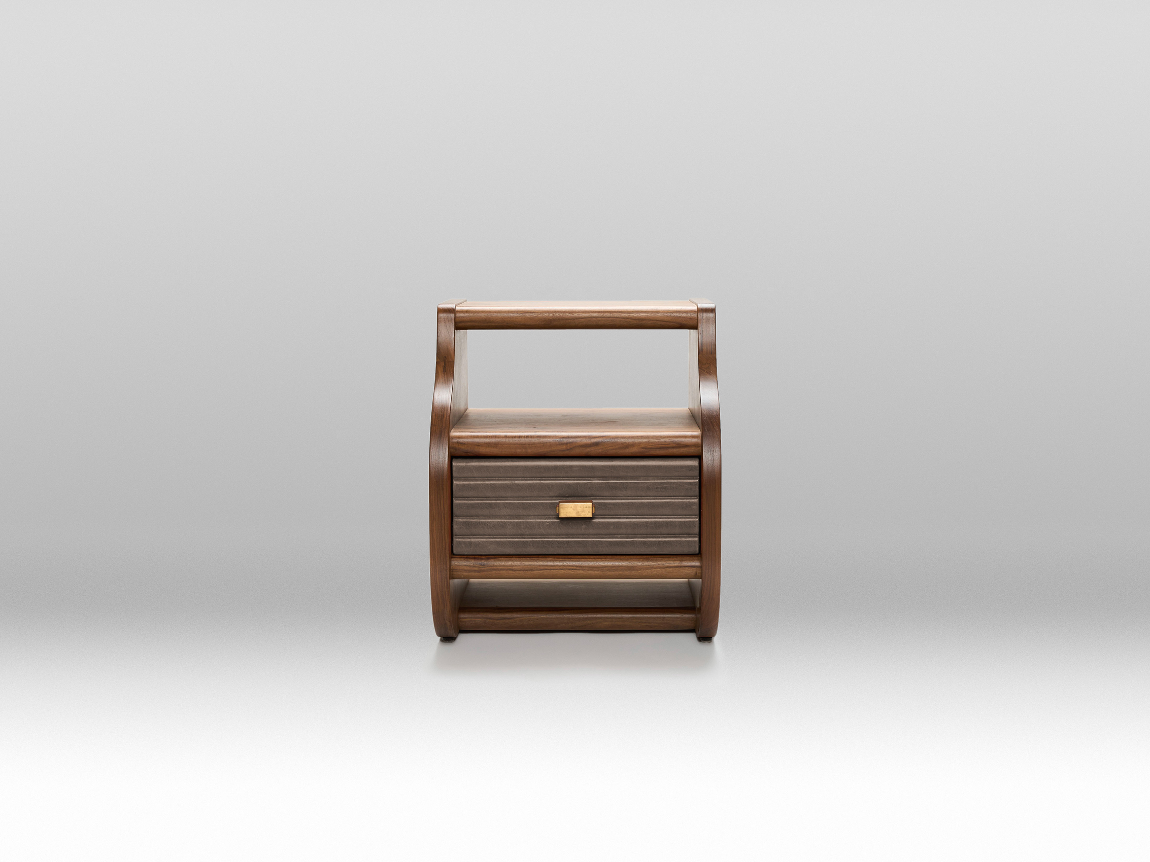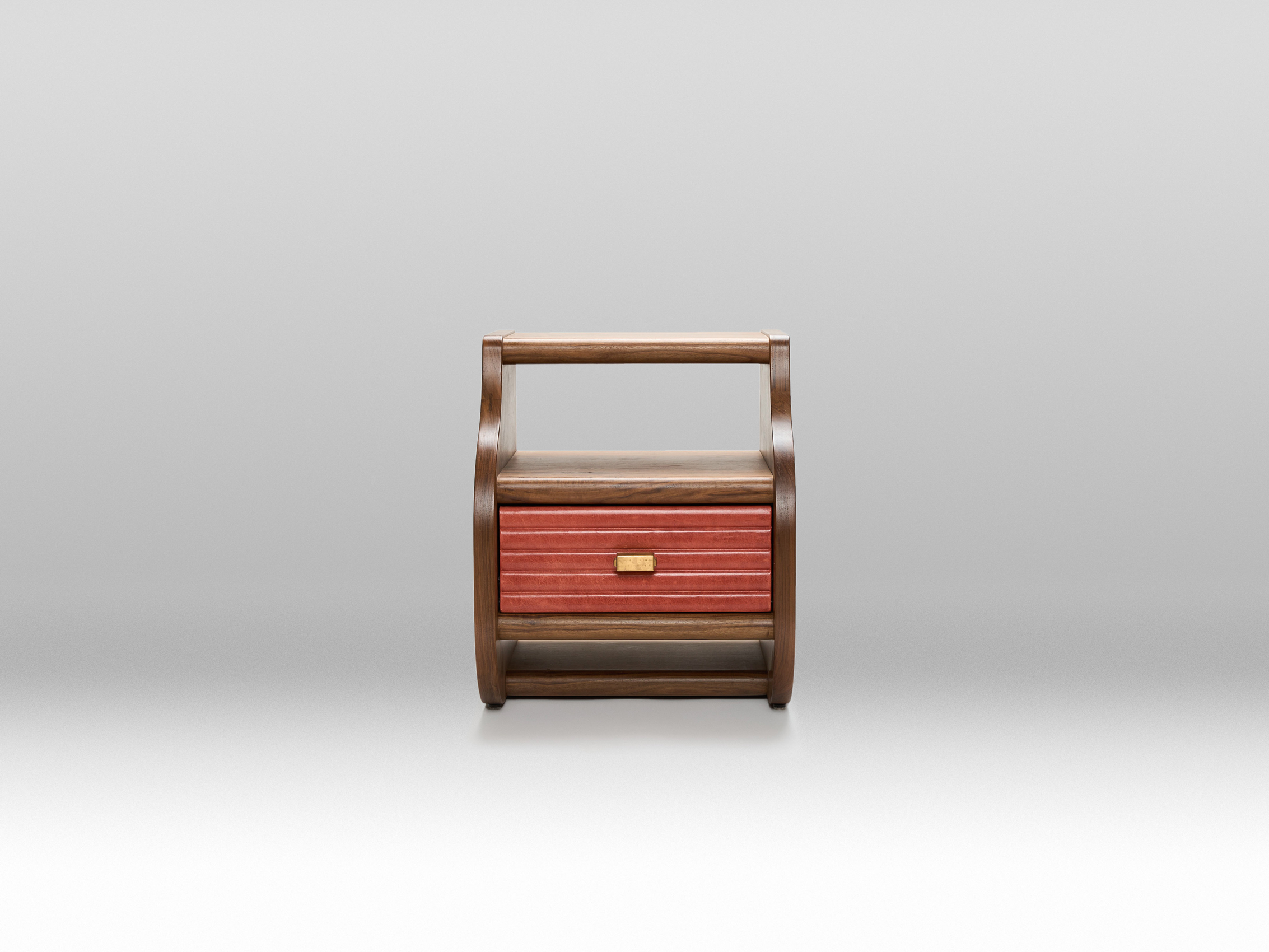 Rounded edges and a reeded leather drawer front create a playful side table design, custom brass hardware on top of the leather adds a final layer of tactility.
