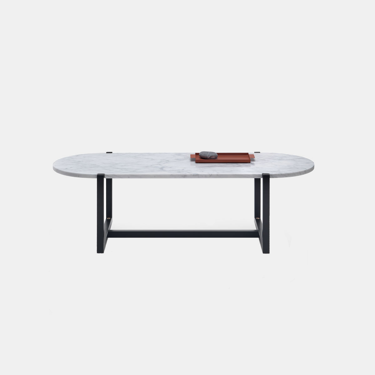 Arflex presents the Cradle family, a system consisting of an armchair, sofa, and coffee table. Their characteristic is based on the structure: a classic triangular construction, which is repeated several times around the products, so as to allow it to be appreciated from every point of view. Instead of hiding the structure and trying to make the product rise from the ground, the elegant support elements are themselves the highlights of the model. The coffee table is composed of legs in black lacquered die-cast metal, which support the marble top, in the finishes of the Arflex collection.
