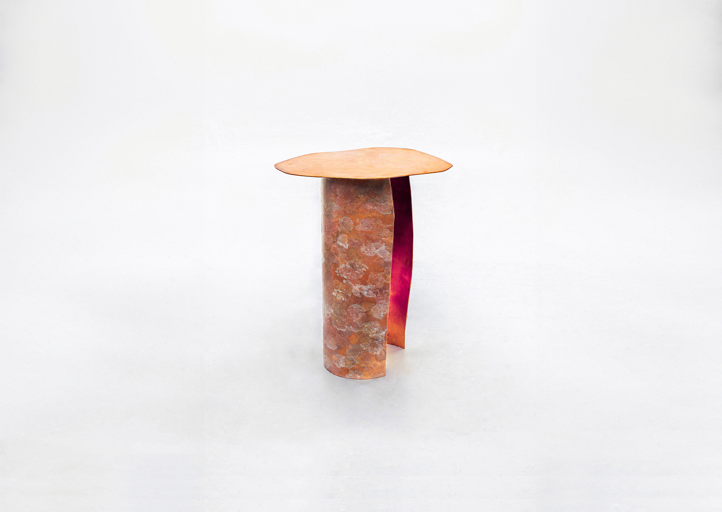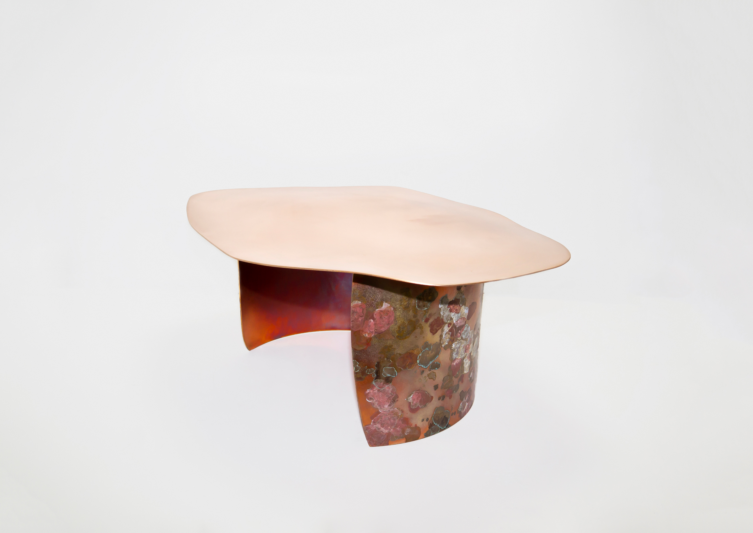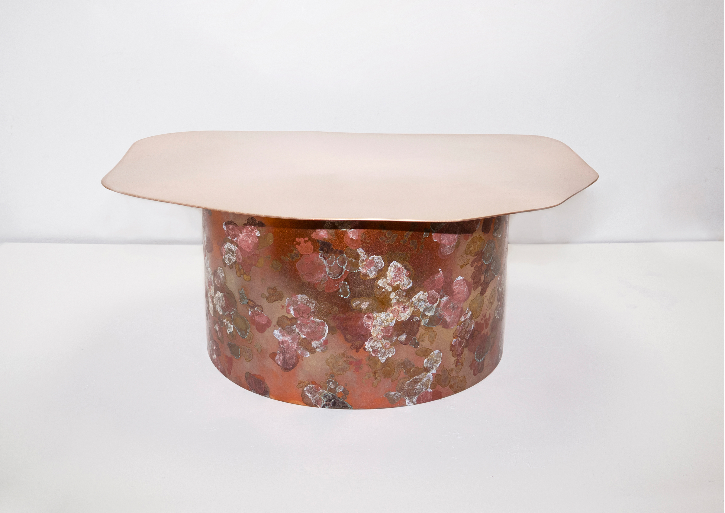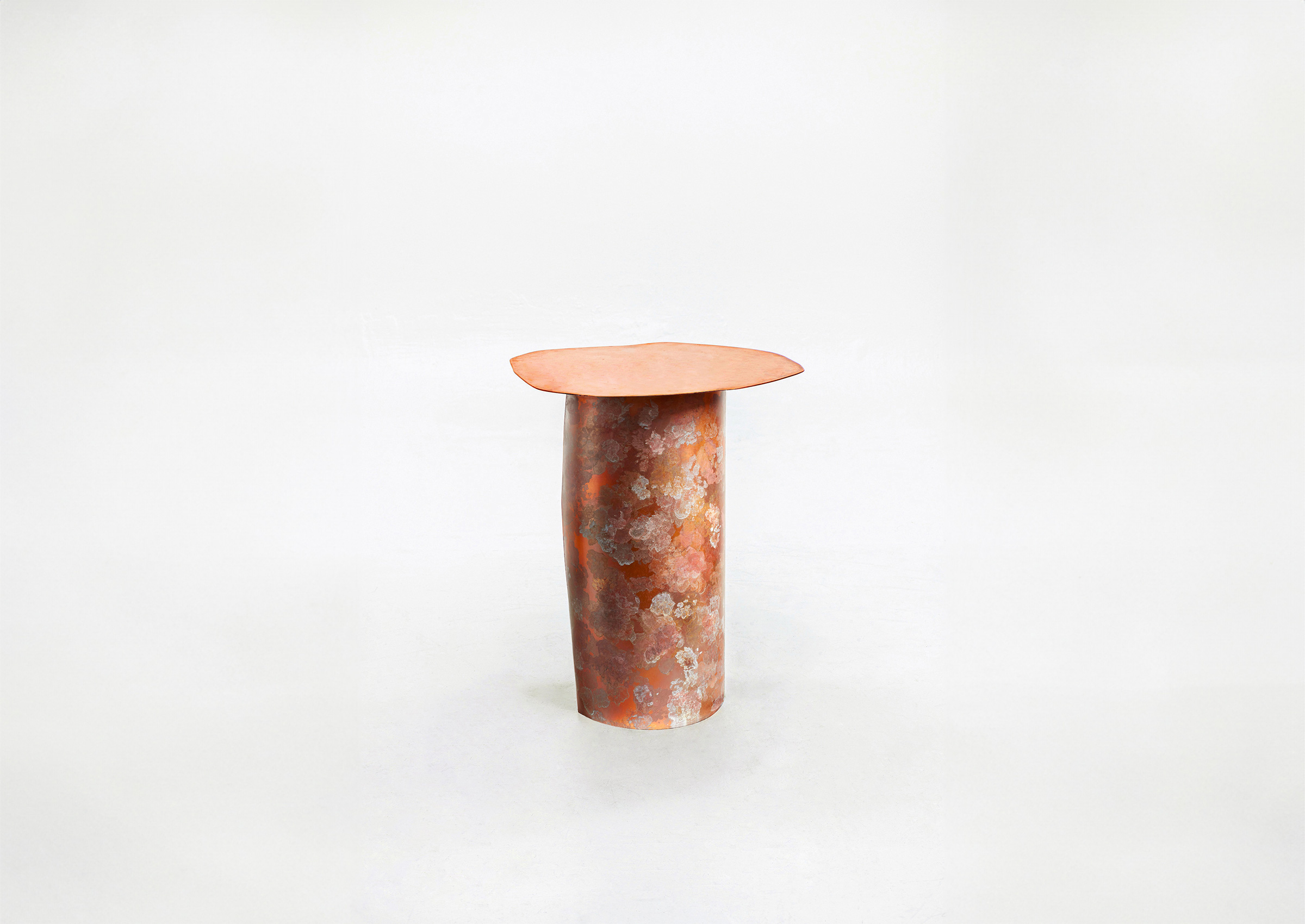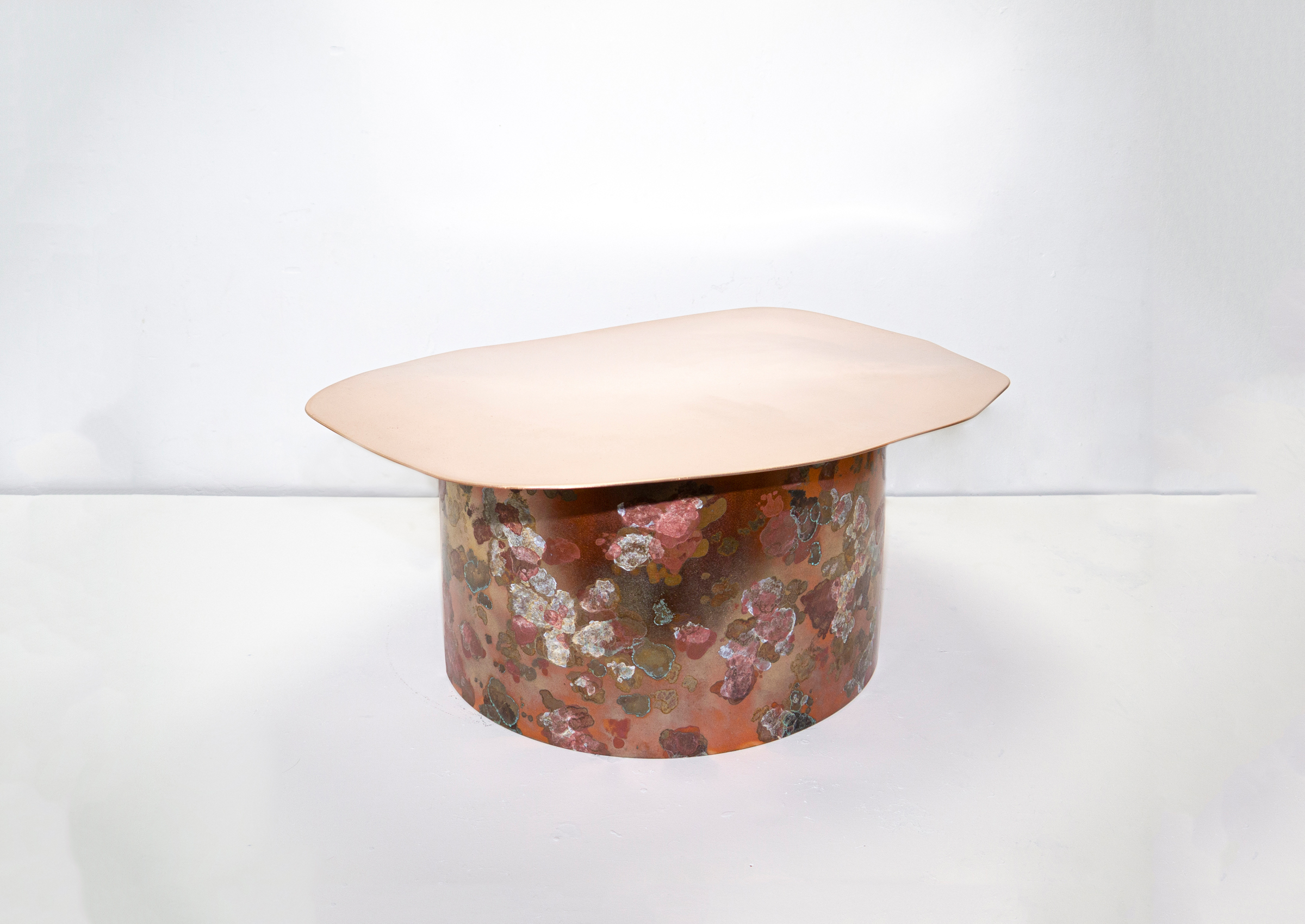 With the careful application of specially formulated lichen-like patina, this rudimentary bronze table form is sprouting with a colorful garden of fungal textures. Layers lichen-like patina tarnish the body of the table. The inside surface of the cylindrical base glows a fiery orange and tonal blues as a result of the heat application.