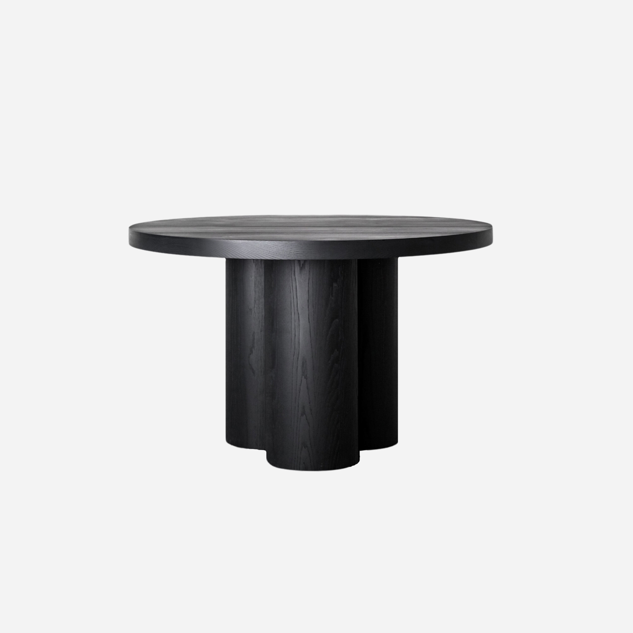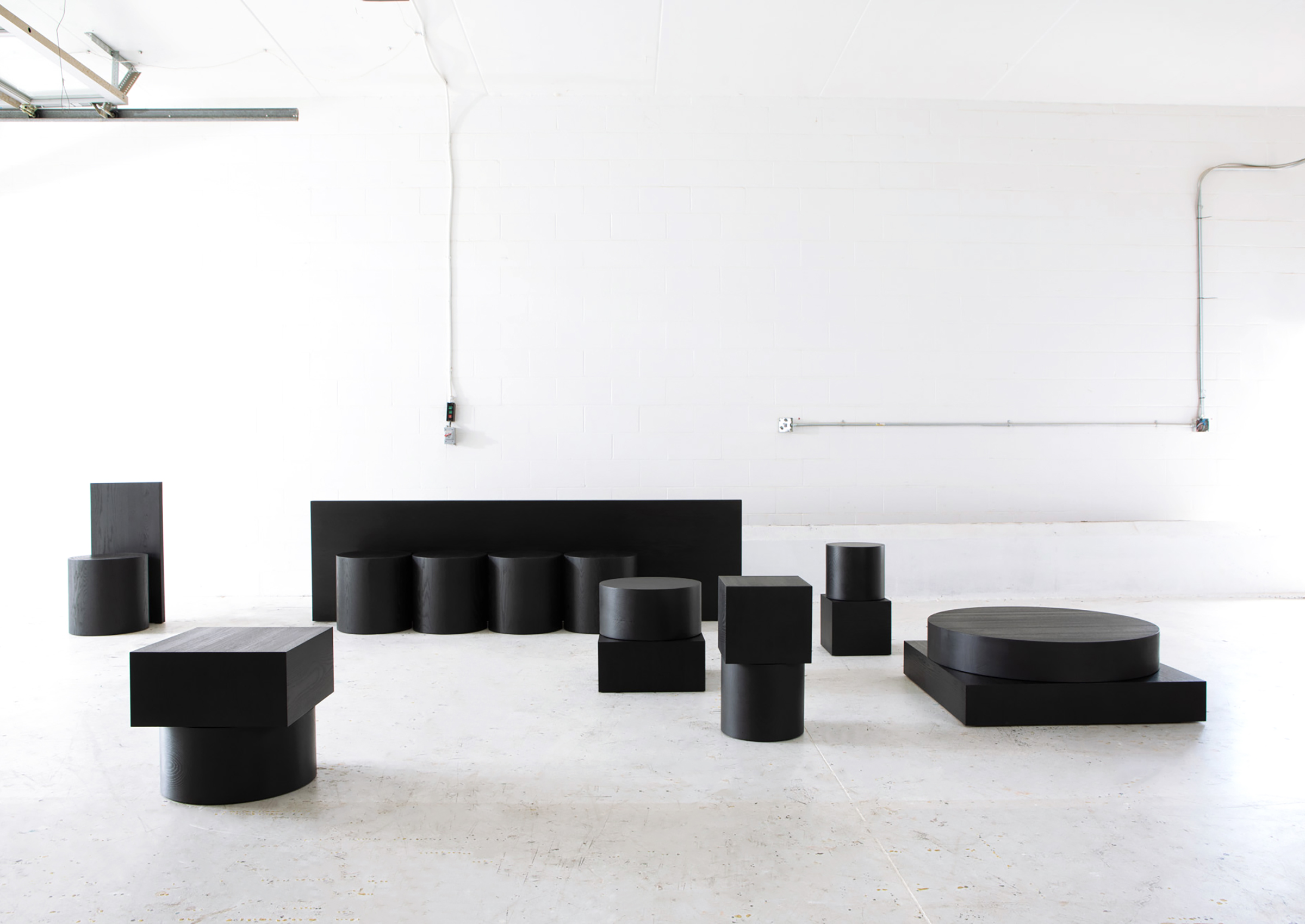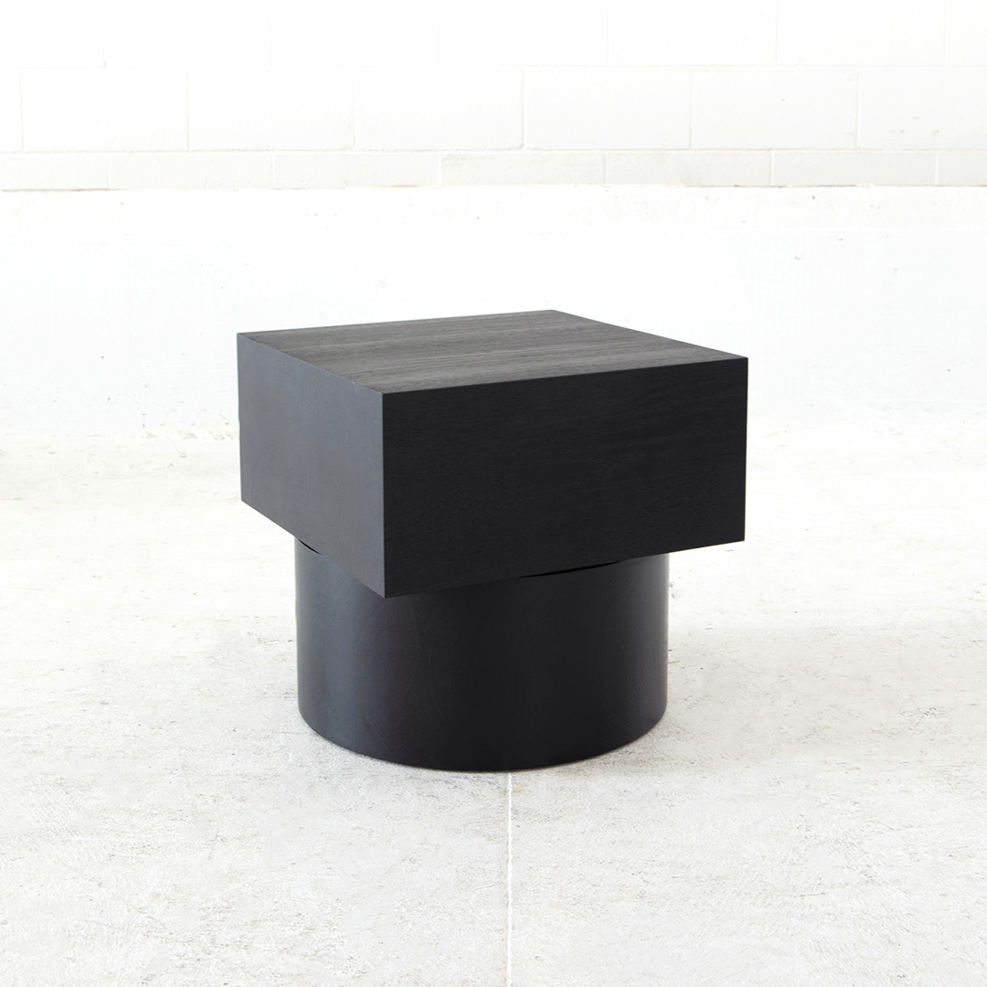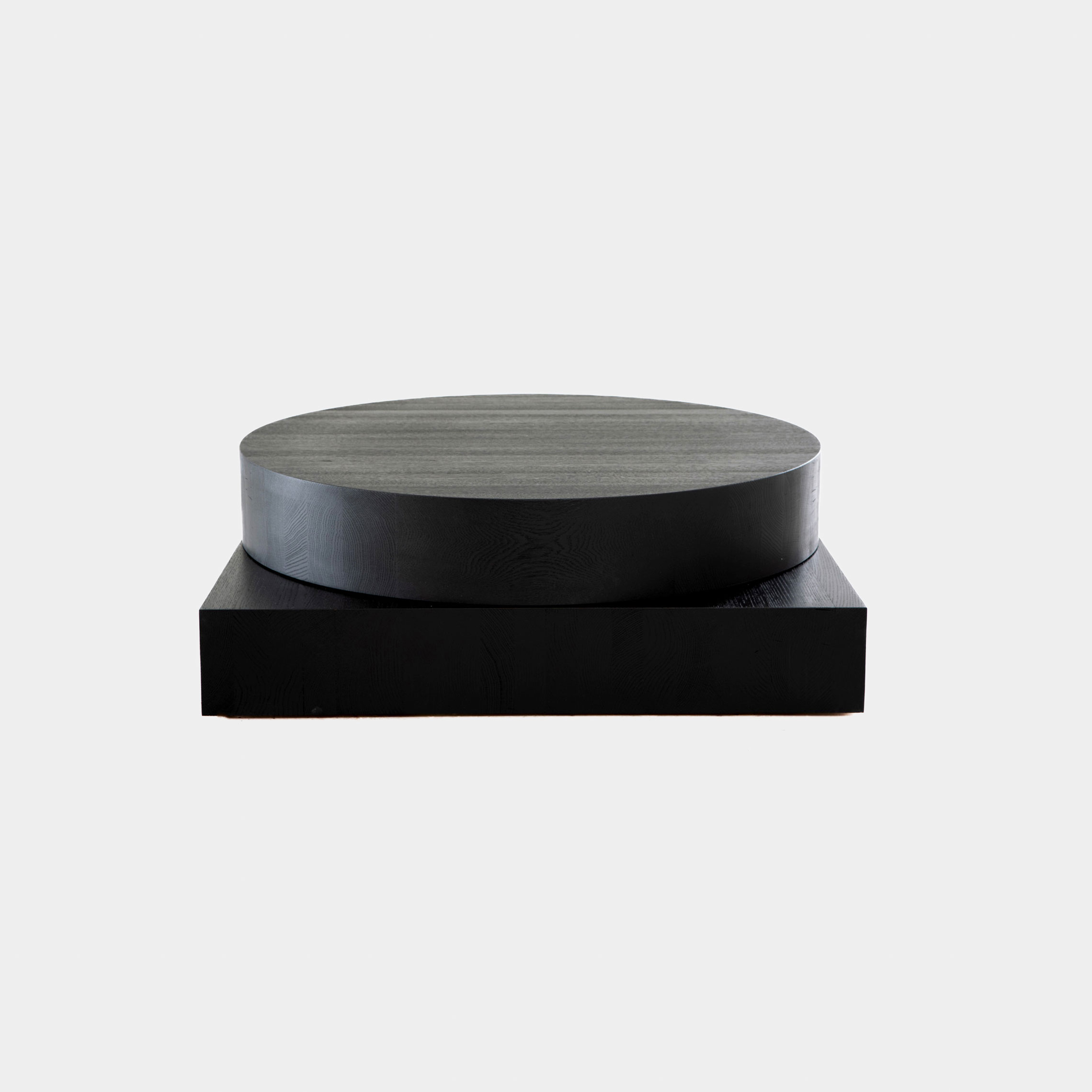 Part of the Noga Series, this sculptural coffee table is influenced by wood block compositions. A stacked, handcrafted solid wood turned cylinder and cube.