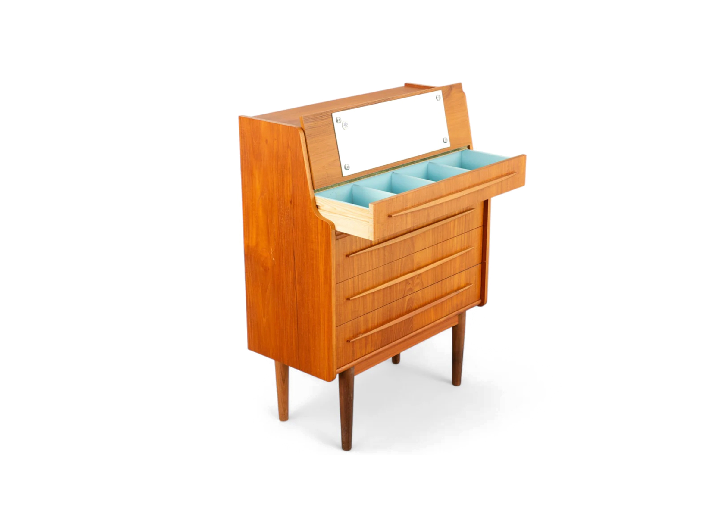 This Danish Modern Secretary Desk / Vanity in teak is distinguished by its materials and period detailing. Designed for everyday use, it offers practical storage or surface space with a refined, collected presence.