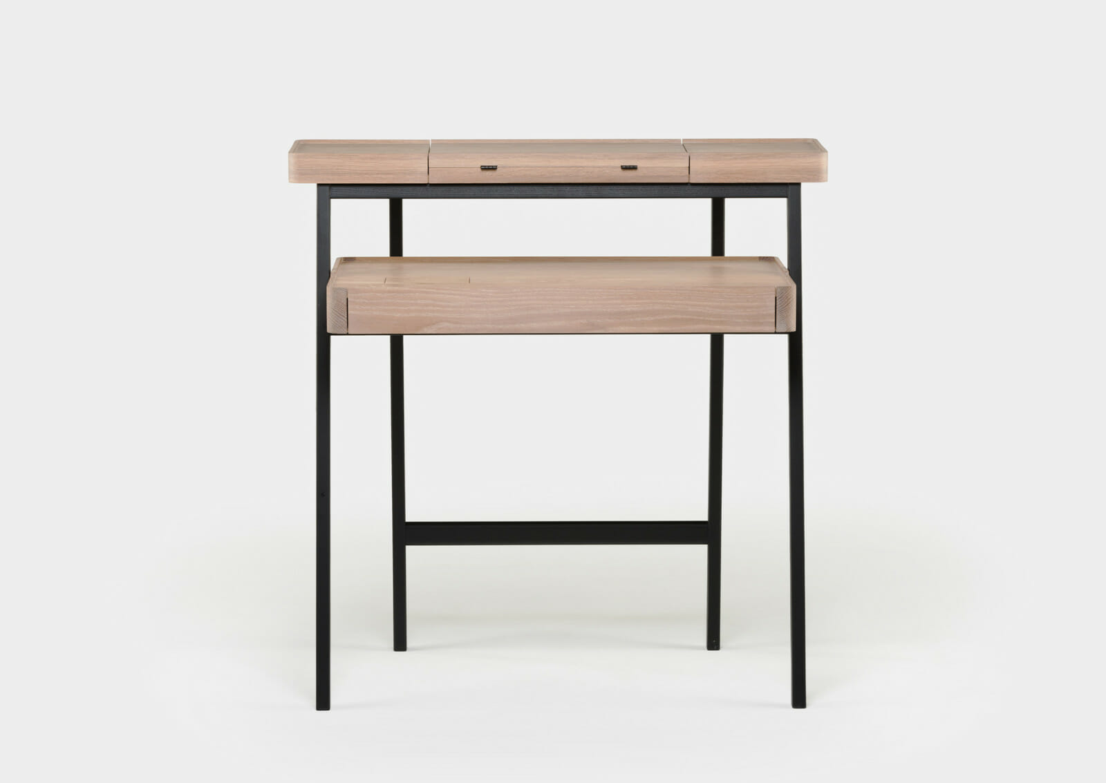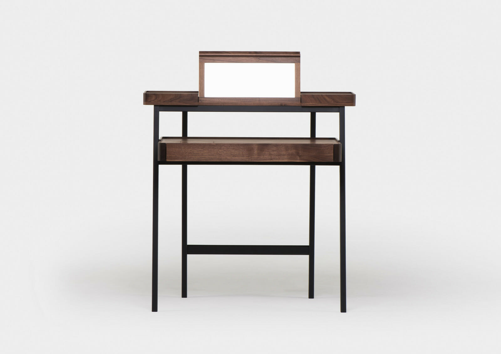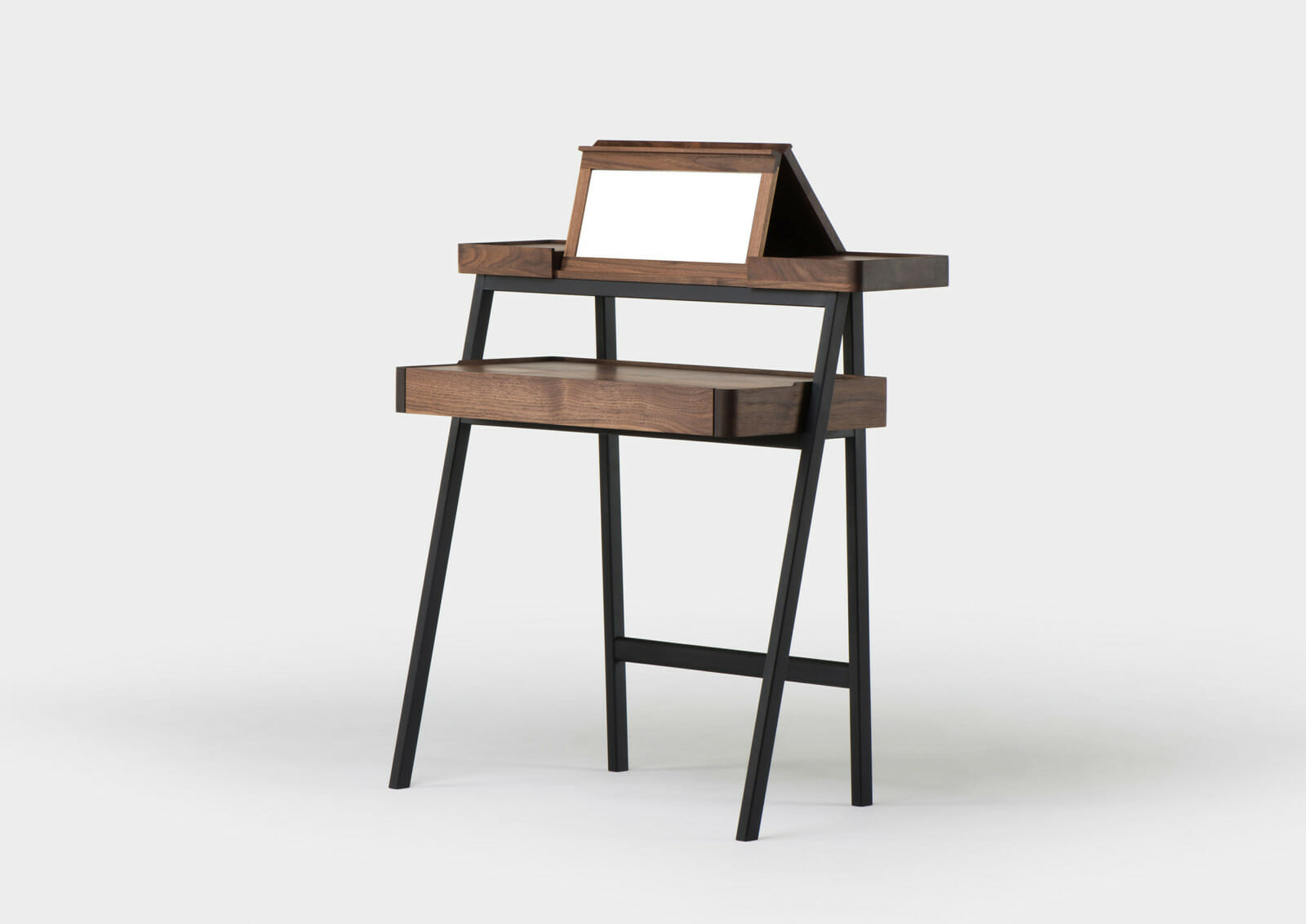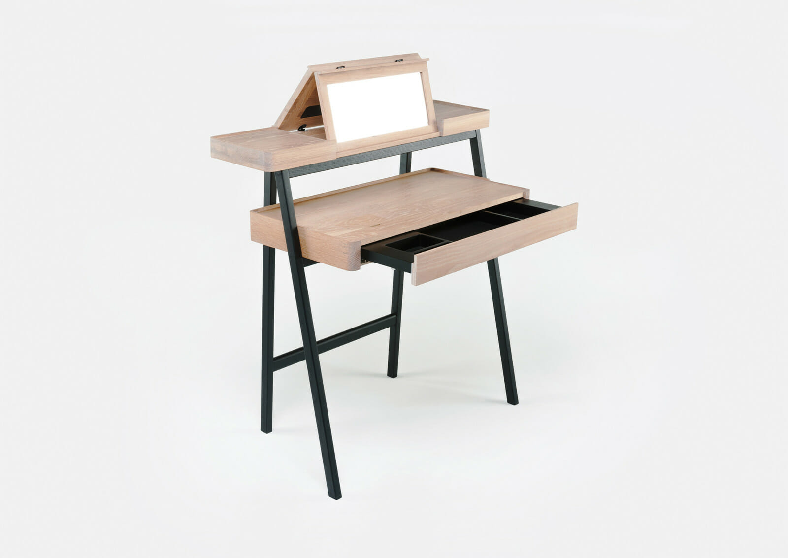 Trays function as surface containers for collectibles, and this multi-tasking desk/vanity table was designed as two stacking trays on a light wooden frame. Contemporary lifestyles demand furniture to be more mobile and flexible, servicing multiple functions, while remaining lightweight for easy transport. This piece responds to that need, using the analogy of trays on trestles as a point of departure. When the drawer is closed, the small door on the desktop provides access to the drawer contents. When the drawer is fully extended, the desktop door provides access to a concealed compartment lined with red leather. The fold-out mirror is adjustable to three possible angles.