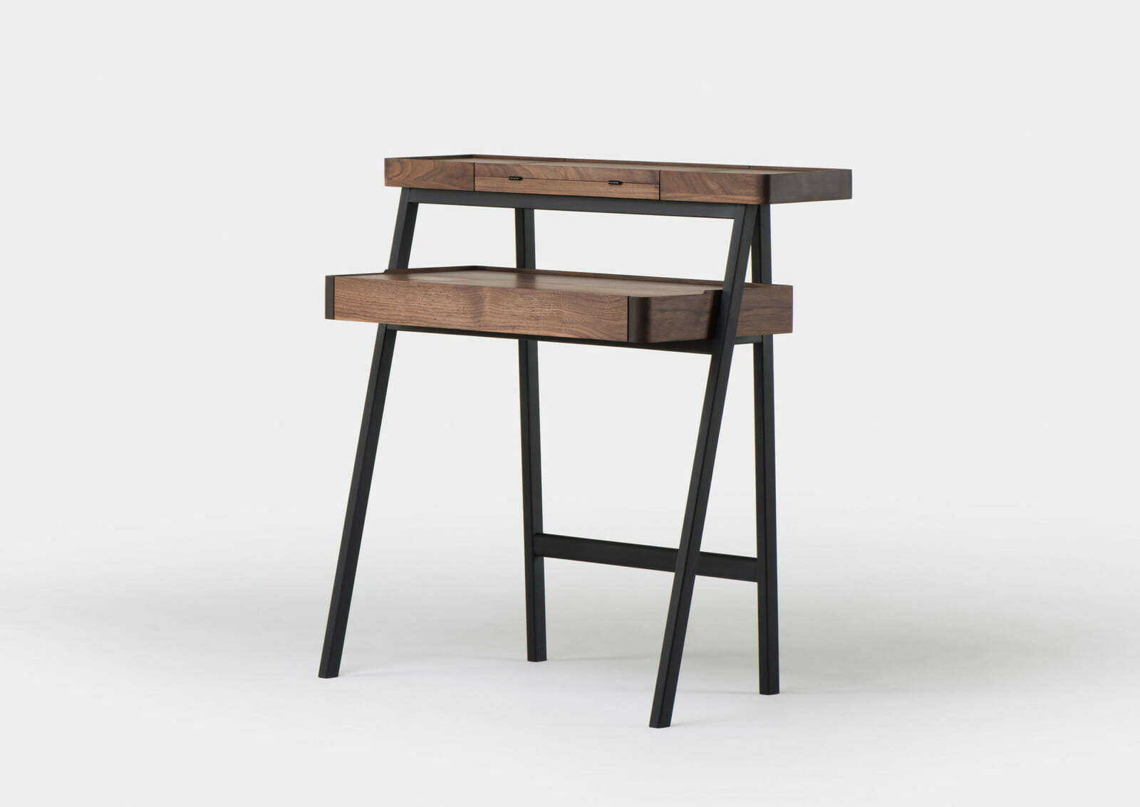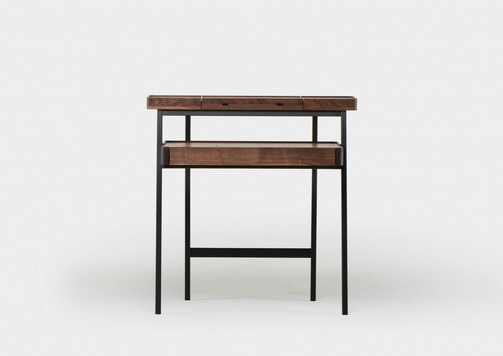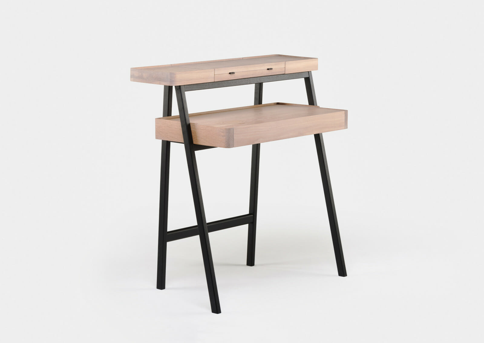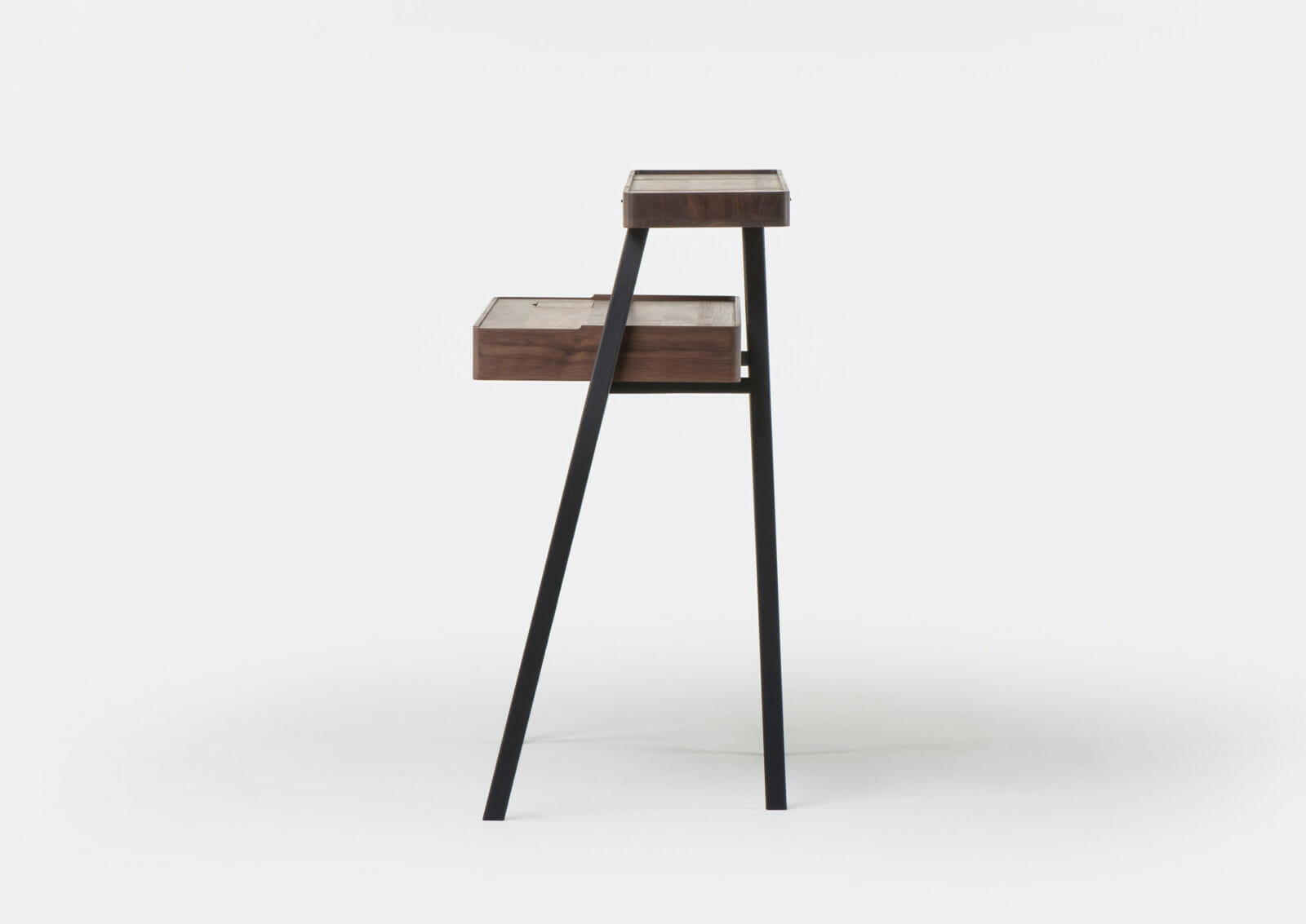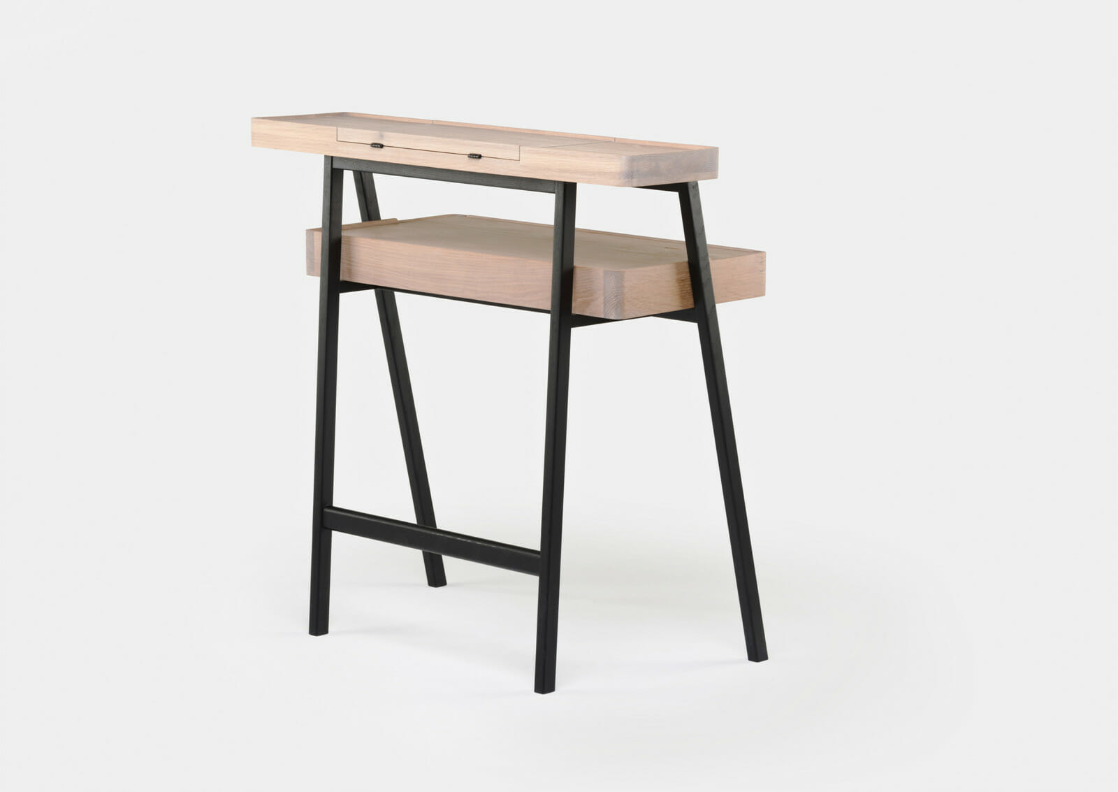 Trays function as surface containers for collectibles, and this multi-tasking desk/vanity table was designed as two stacking trays on a light wooden frame. Contemporary lifestyles demand furniture to be more mobile and flexible, servicing multiple functions, while remaining lightweight for easy transport. This piece responds to that need, using the analogy of trays on trestles as a point of departure. When the drawer is closed, the small door on the desktop provides access to the drawer contents. When the drawer is fully extended, the desktop door provides access to a concealed compartment lined with red leather. The fold-out mirror is adjustable to three possible angles.