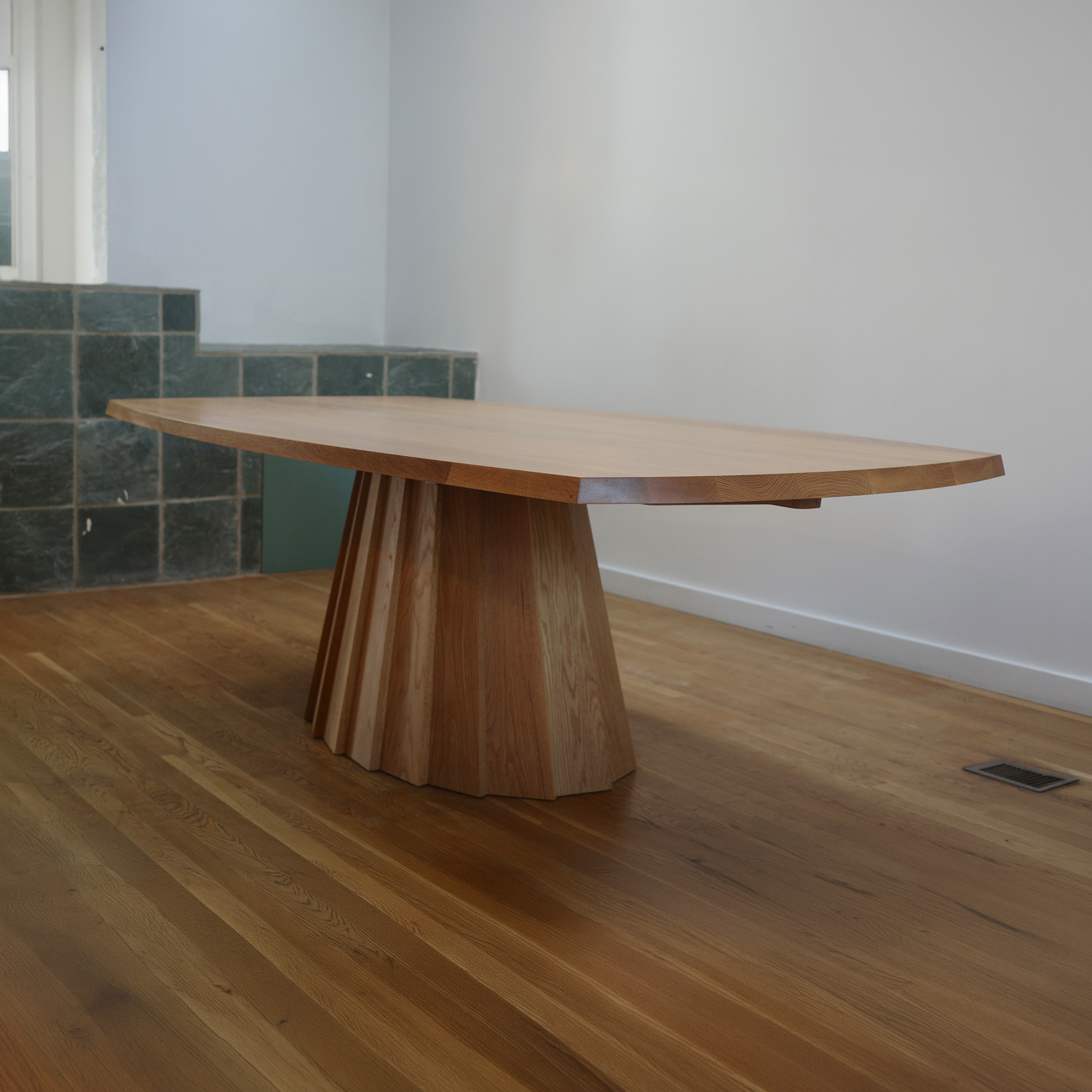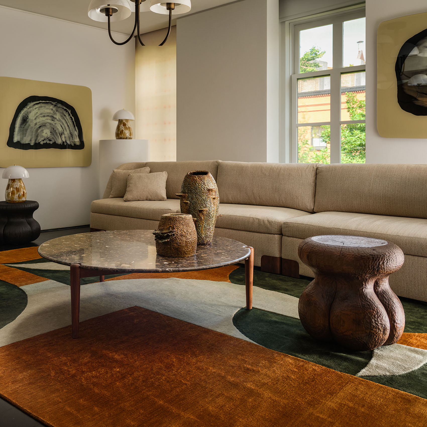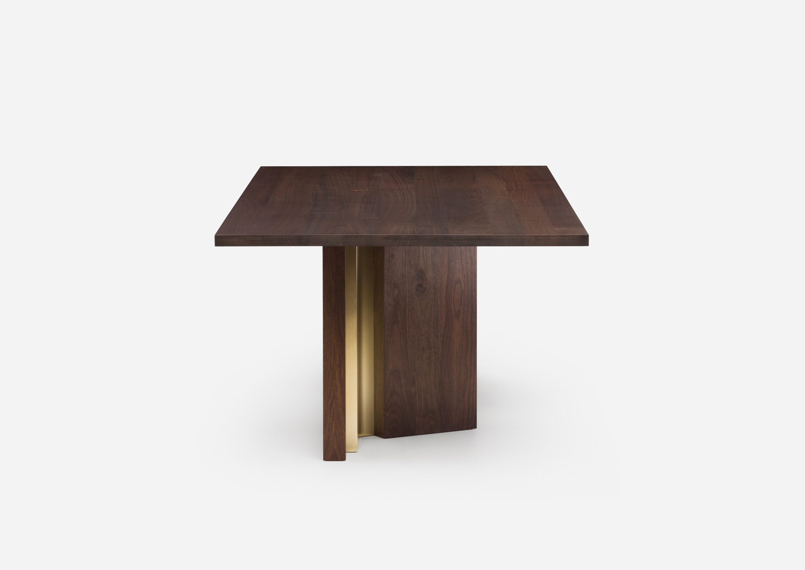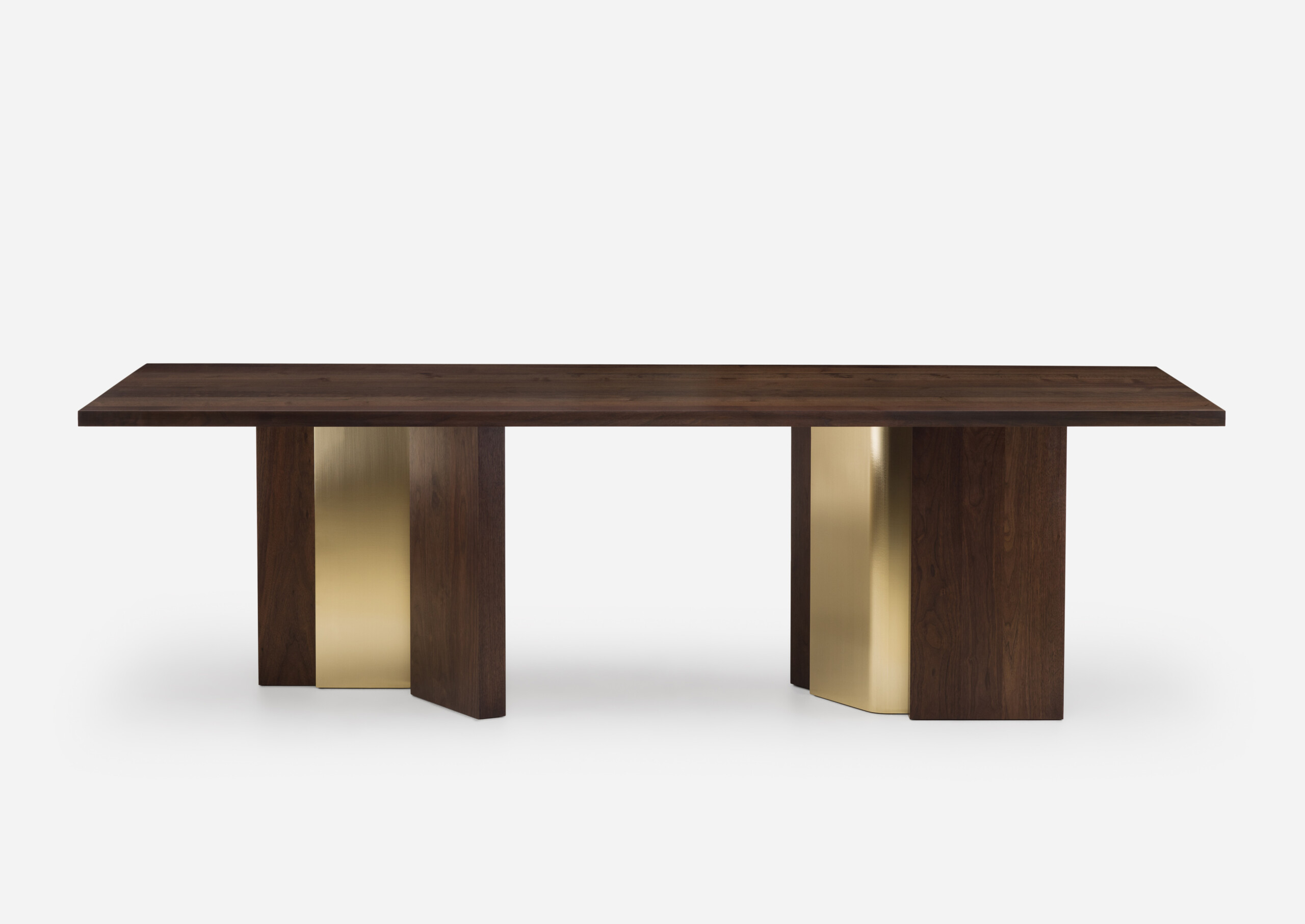 Inspired by the binary star in the northern constellation of Boötes, Izar is a sculptural dining table crafted in solid timber with details in brushed brass. In an elegant encounter between two contrasting materials, Guerrée expresses his artistry by playing with the volume under the tabletop, adding two asymmetrical legs that give a rhythm to the whole.
