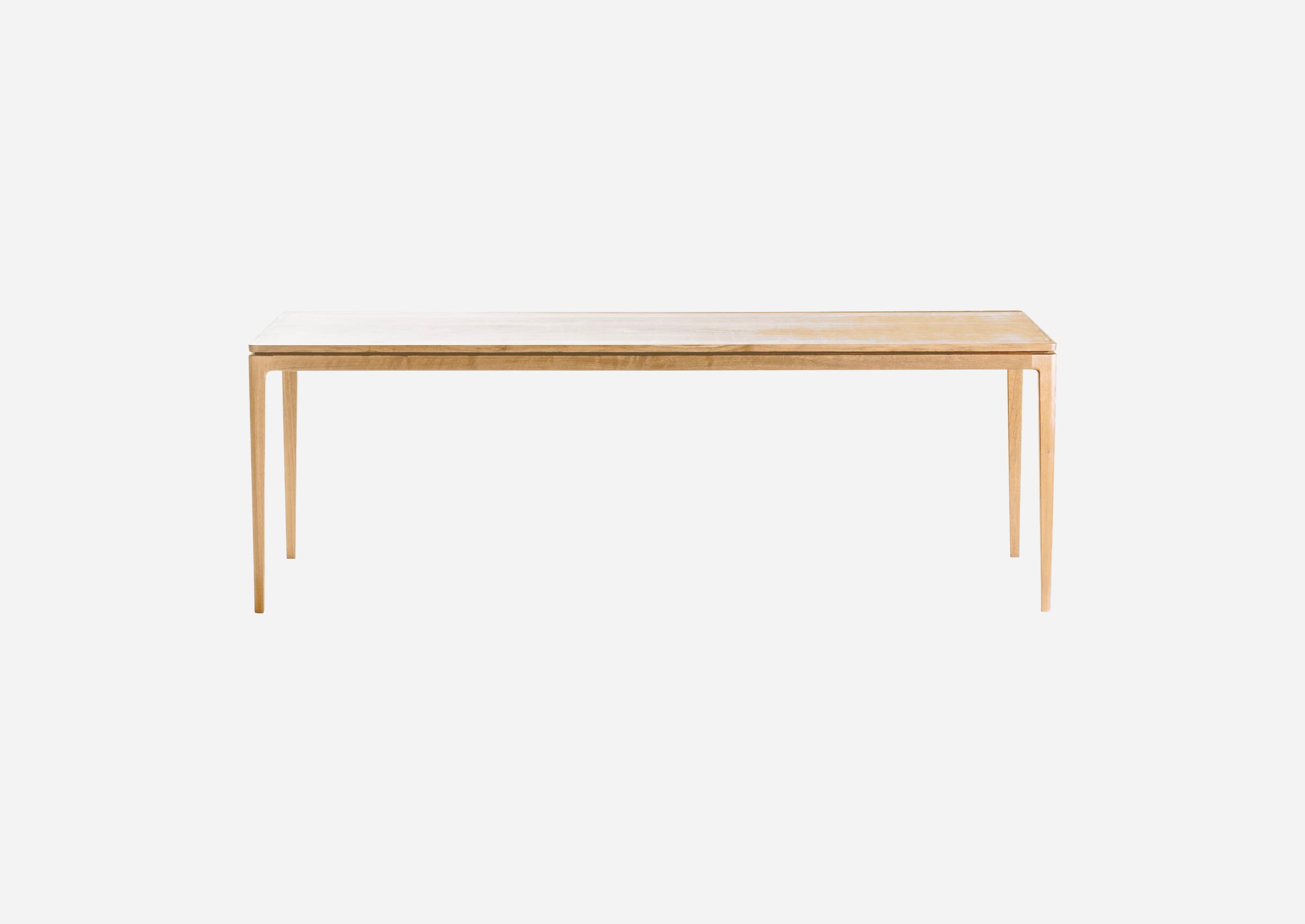 Lotus Moon is a table, resembling a large lotus leaf, with a delicate upright rim at the edge of the tabletop. The rim naturally rises from the tabletop, since it is carved and smoothly polished the inside of the solid board. There is a Japanese tradition to dine by using a small personal table, such as a gozen. The rim of the small personal tables prevent spillage, just like trays. We desired to create a presence resembling the traditional Japanese personal table, by likening the large tabletop to a lotus leaf.