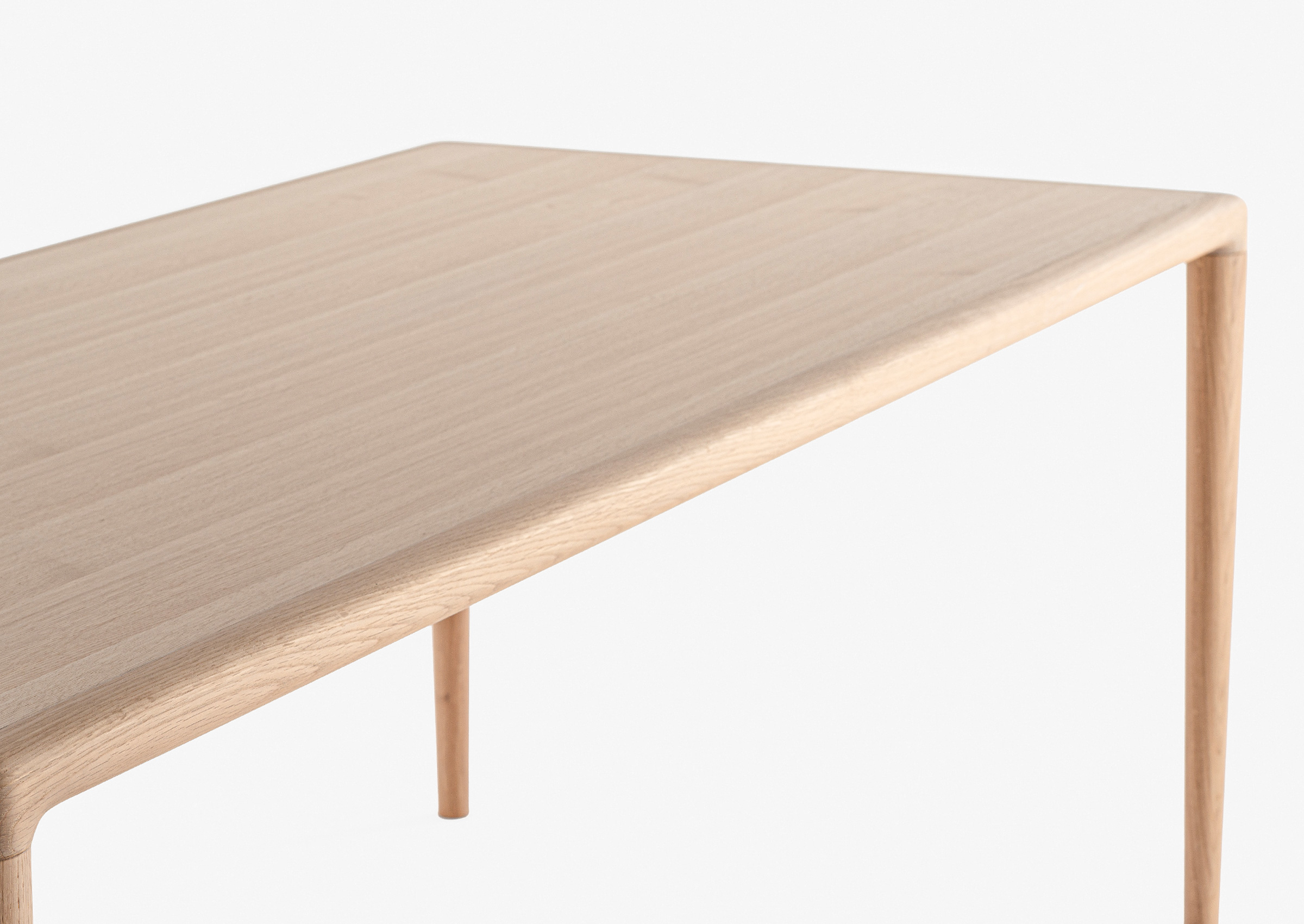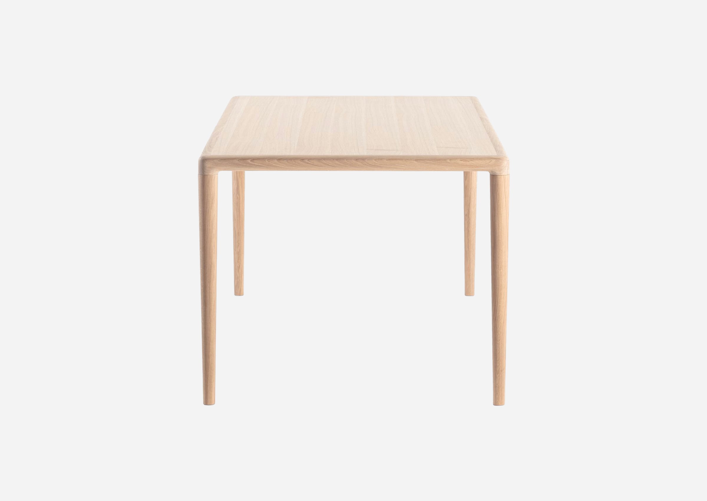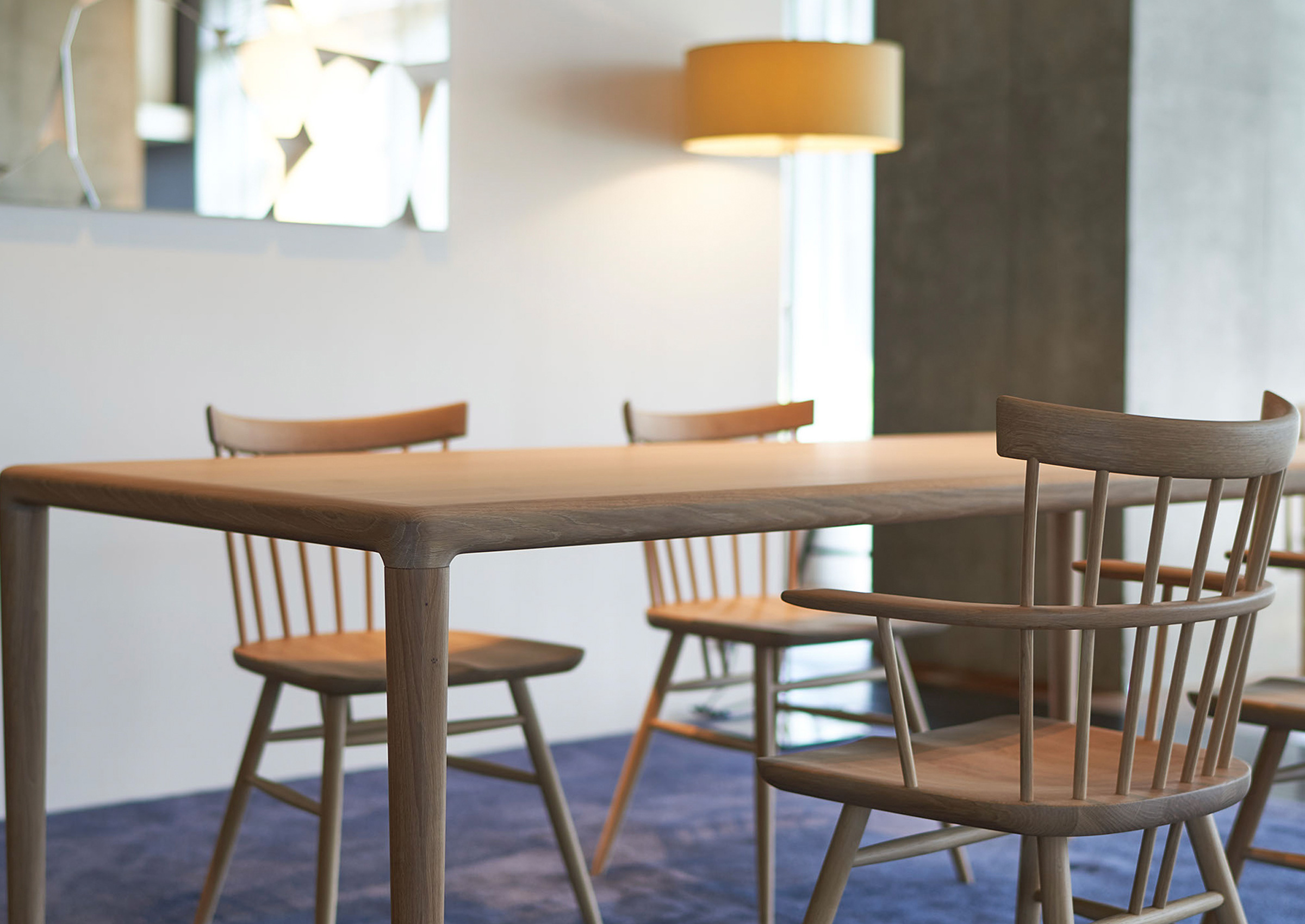 This is a four-legged dining table that has the basic shape of the table. It has a very simple form, but the miter treatment of the tabletop frame portion requires a high level of accuracy and it is equipped with a density as a product. It is made up of elliptical legs that extend straight and smoothly and a thick wood veneer tabletop, can be made at a lower cost as compared to tables made only with solid wood, and also boasts a lightweight. The knockdown mechanism is made in-house and the structure with removable legs is convenient when setting up the table.