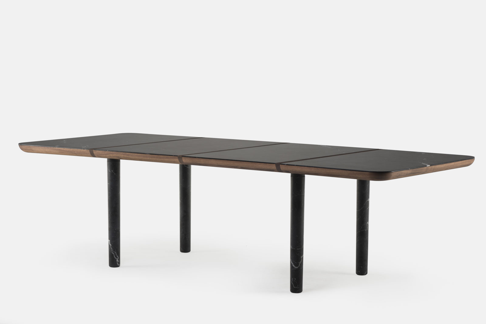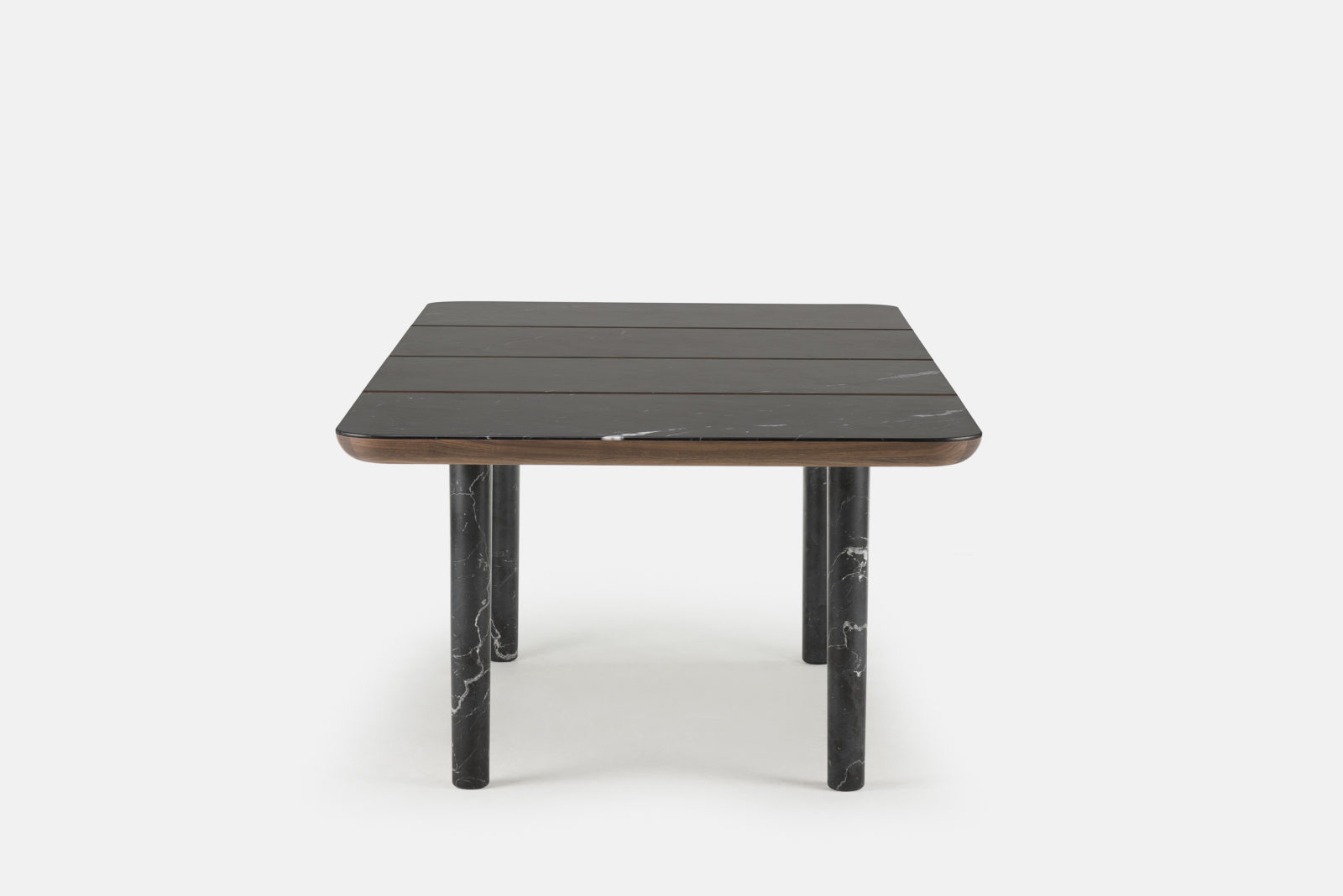 Marlon is a table with an understated form that highlights the beautiful contrast of materials. A timber frame supports a marble tabletop set upon slender legs, for a table that is visually light yet extremely robust. Each table is formed from numerous segments, creating intriguing design details where the parts intersect. Designed by Luca Nichetto and manufactured by De La Espada for the Nichetto brand.