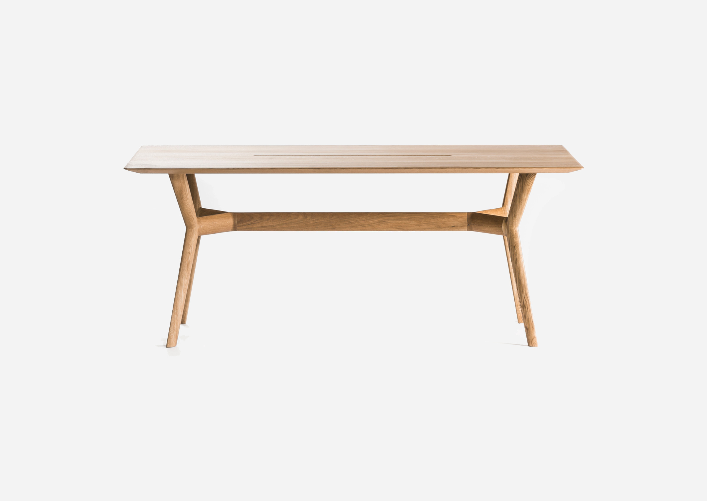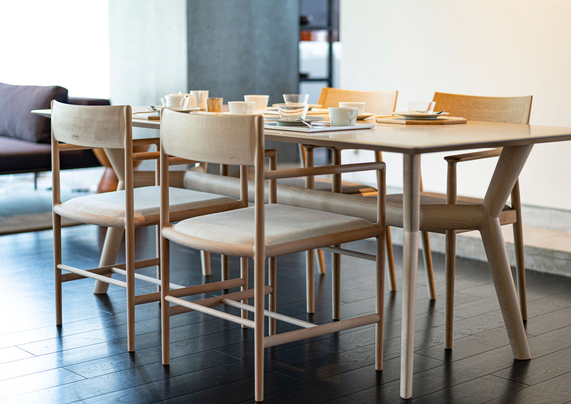 The distinct dogleg shape of the legs are carved from a single timber. Using a joining method called agodashi, the parts that join at the centre are given a sense of oneness and strength. The legs are placed on the inside with an angle, not for design purposes but to prevent the knees from hitting when people sit anywhere at the table. The round table has a part to connect the four legs in the centre, which are made from a single timber as well. The curved wooden connecting part gives increased strength to these legs.
