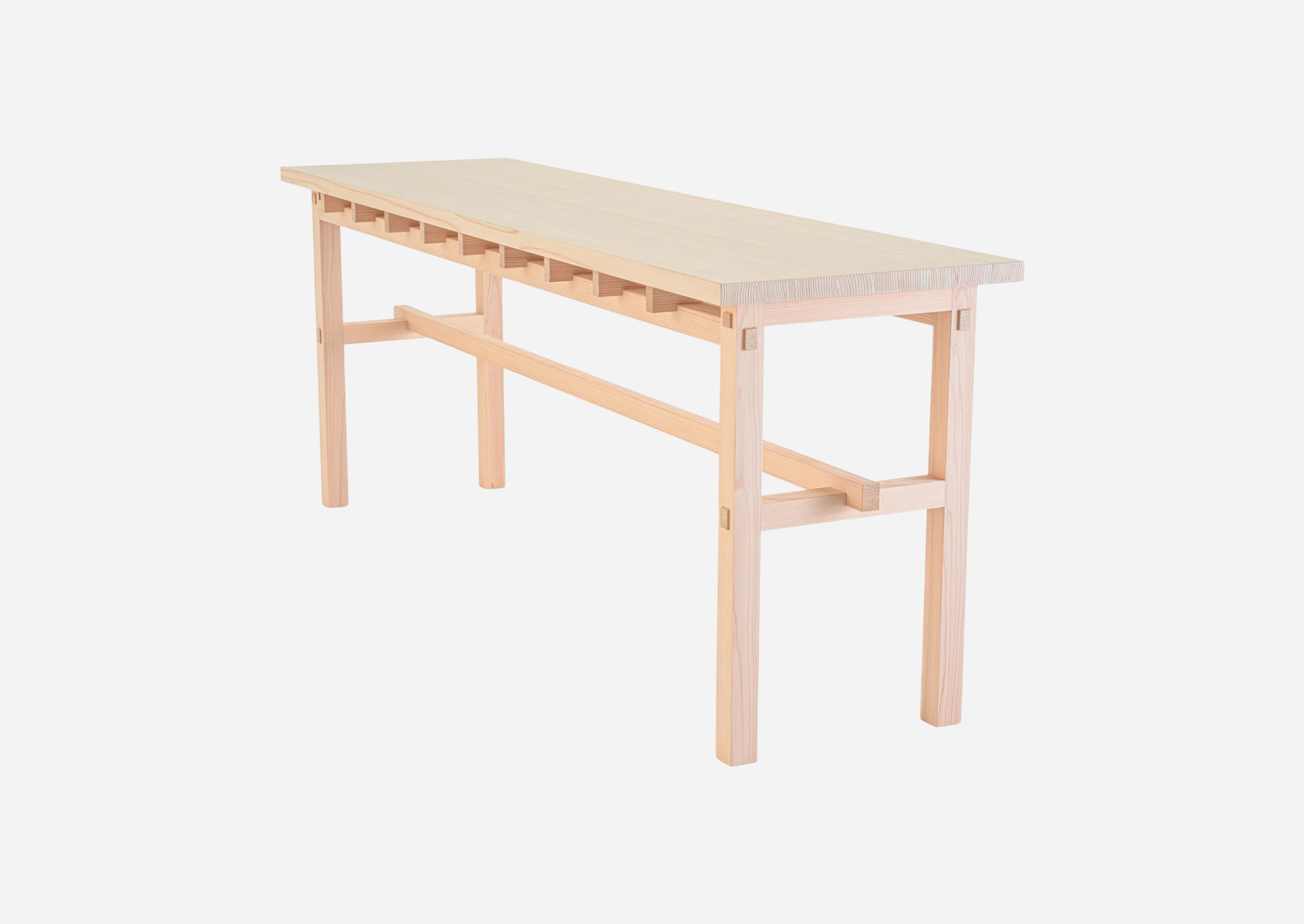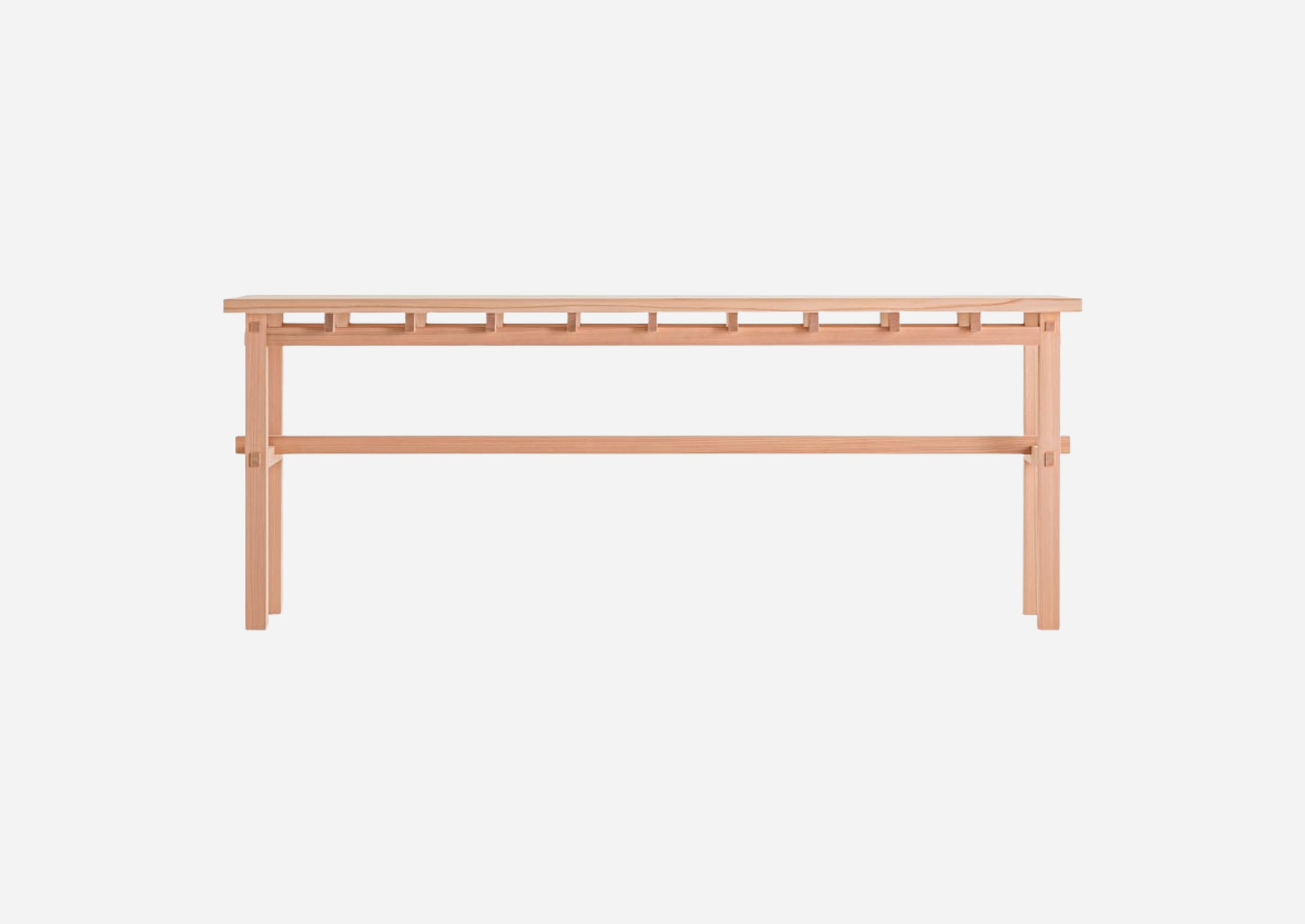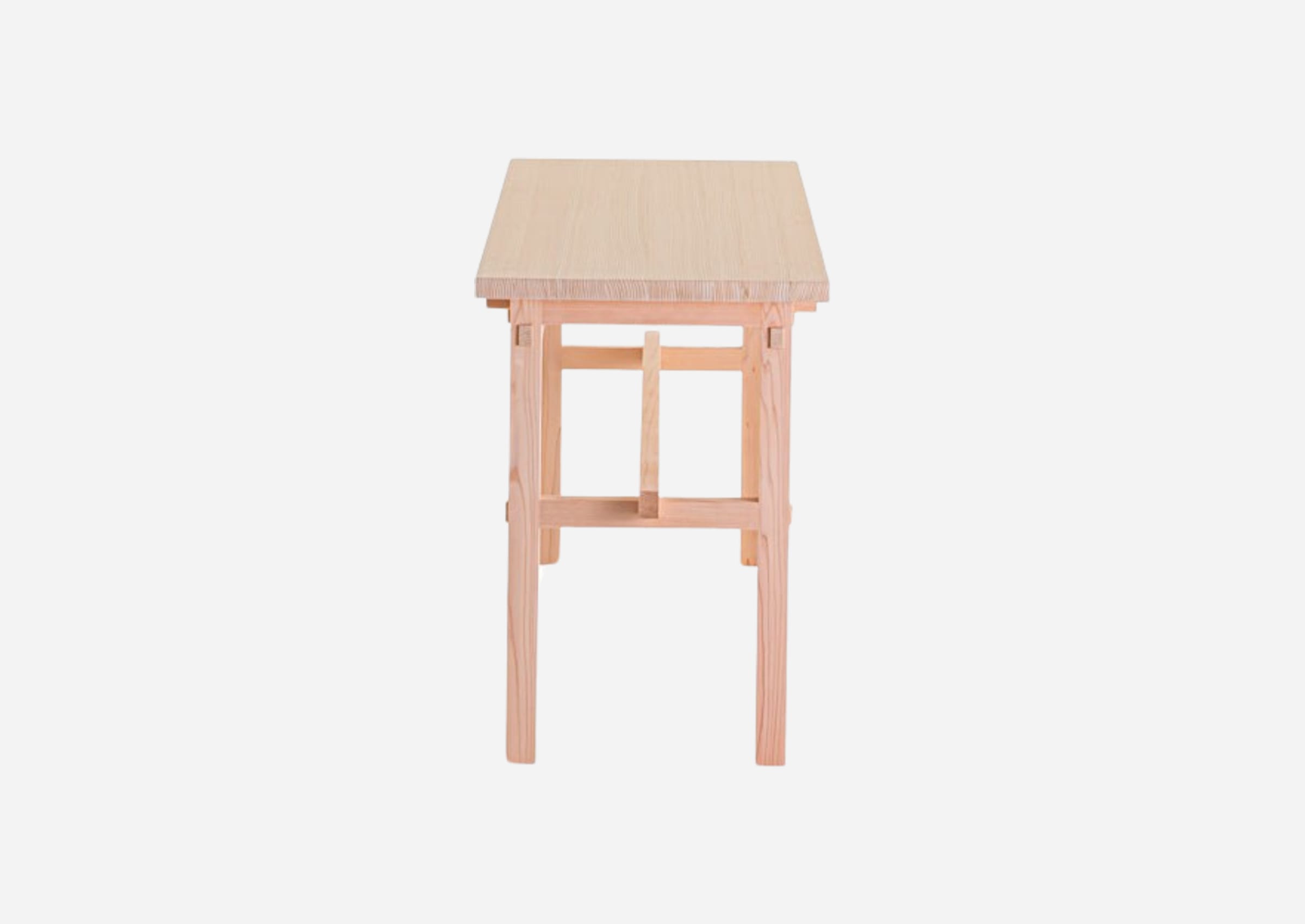 A console table that highlights the beauty of the wood grain. Its moderate depth makes it versatile for use as a counter, desk, or display stand. The wooden joinery of the legs subtly blends with the interior, adding a tranquil presence to its space.