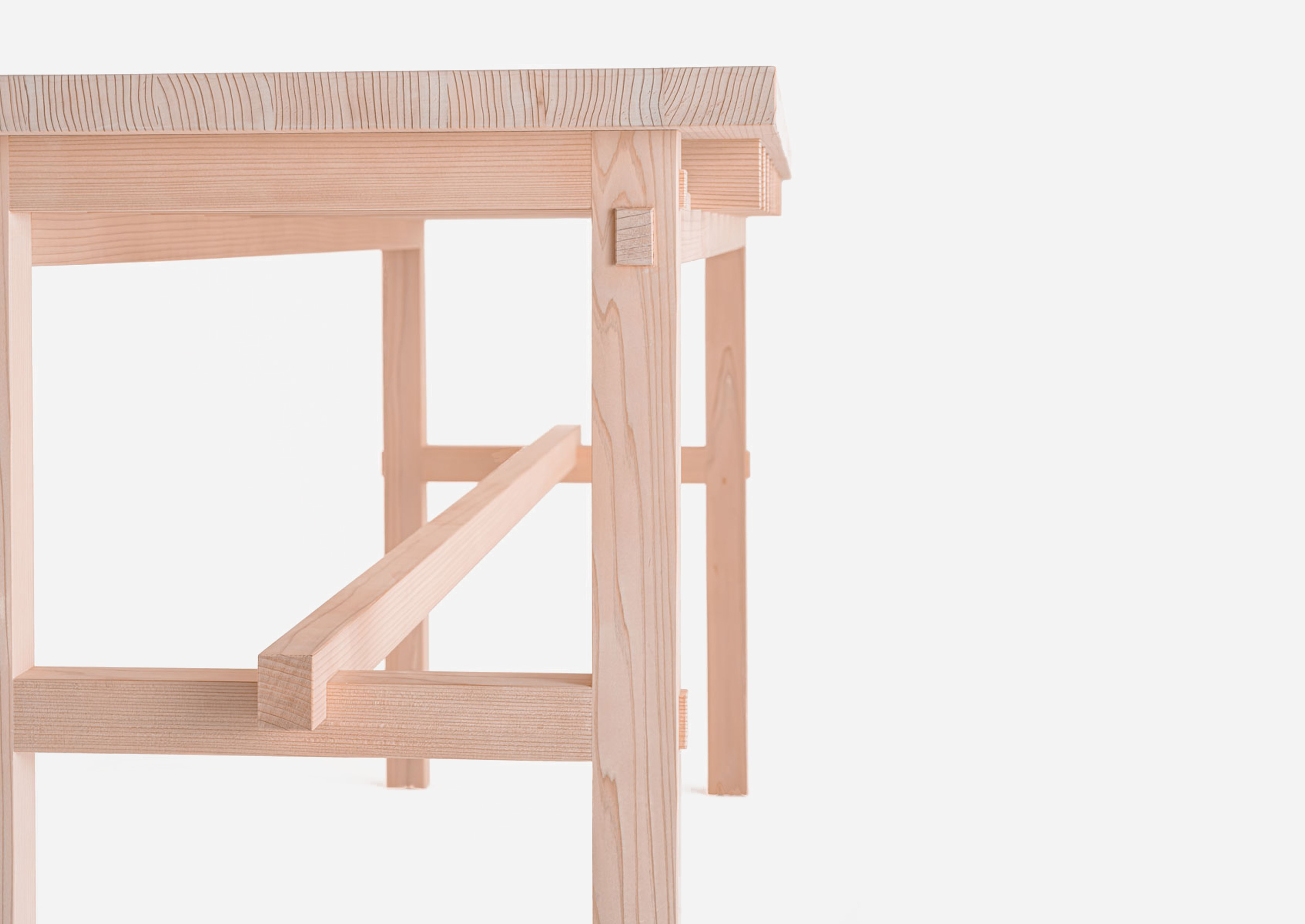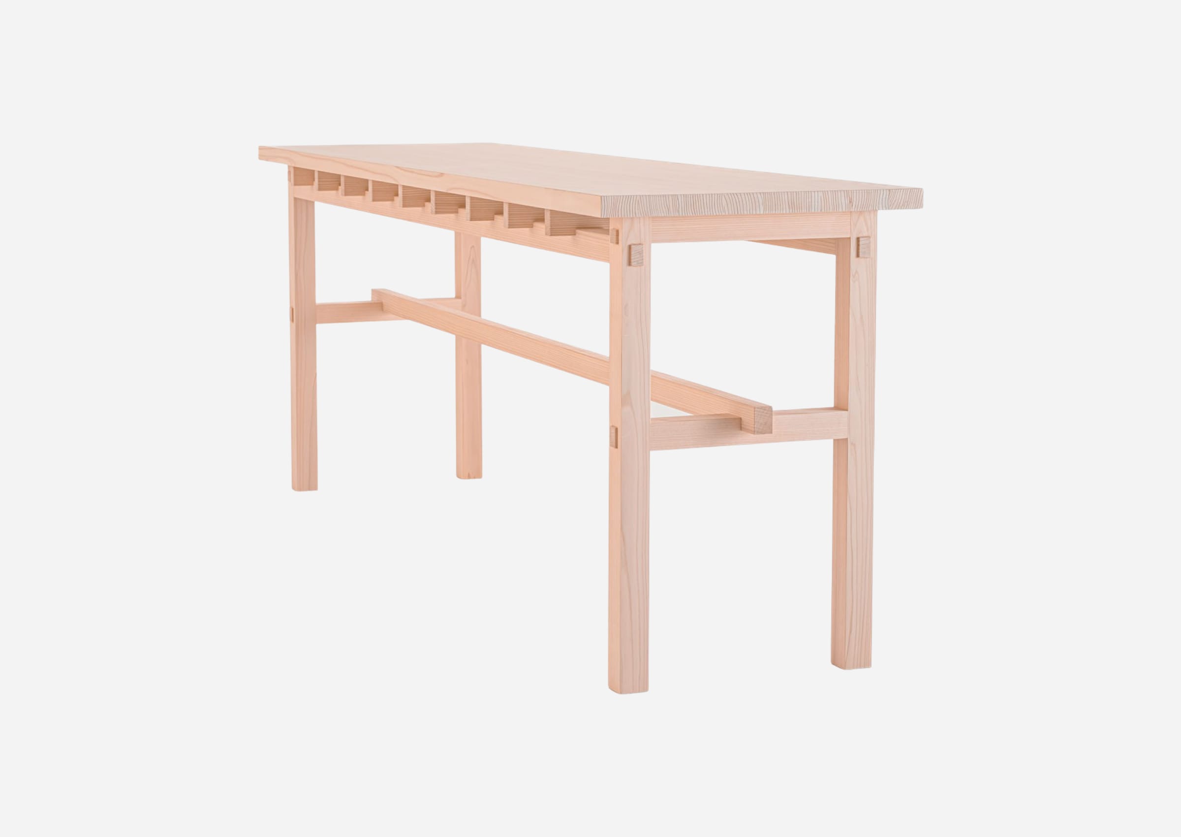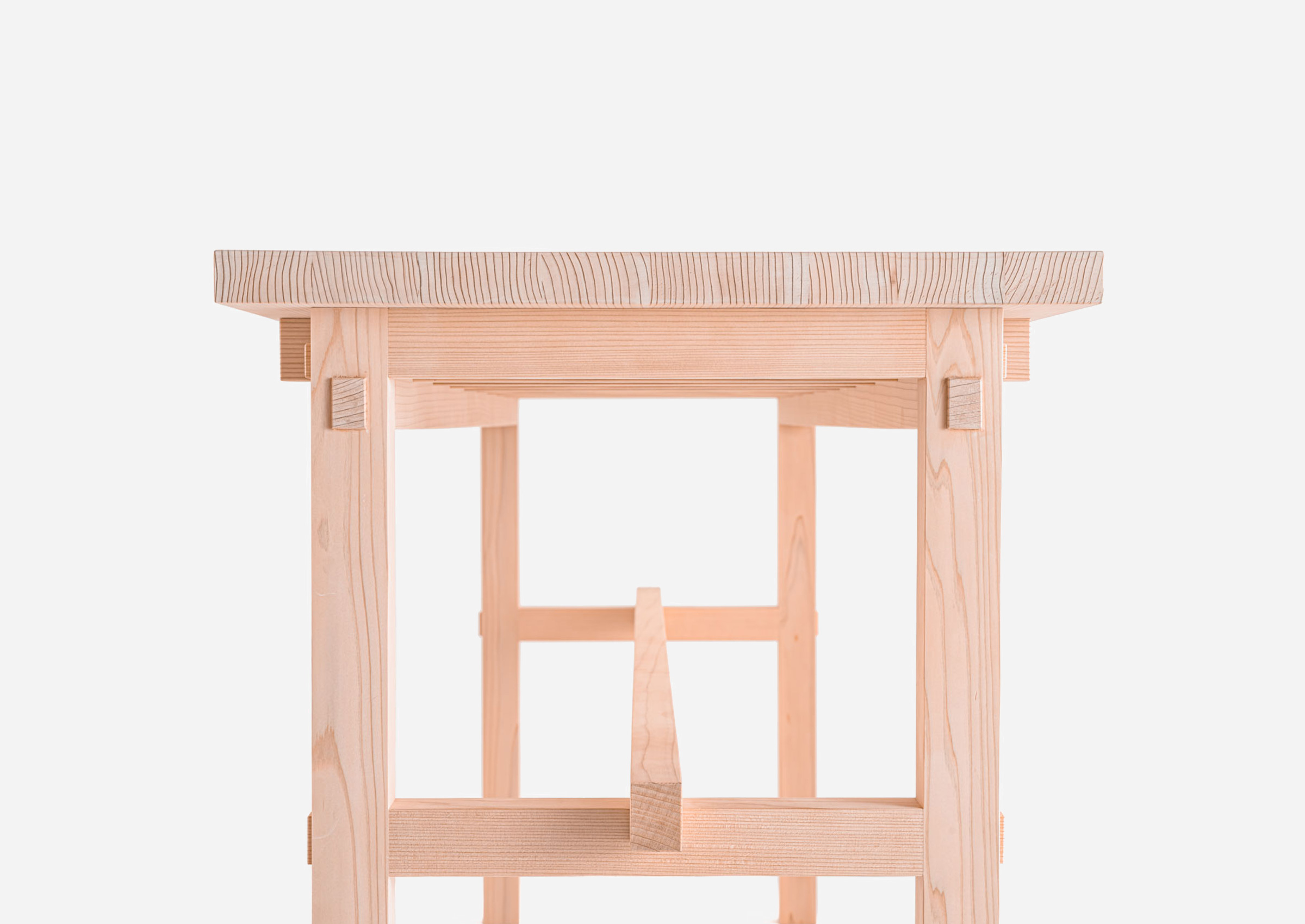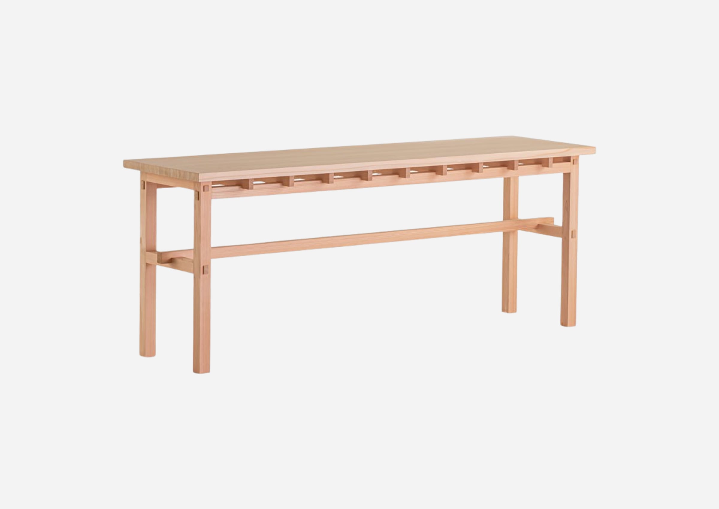 A console table that highlights the beauty of the wood grain. Its moderate depth makes it versatile for use as a counter, desk, or display stand. The wooden joinery of the legs subtly blends with the interior, adding a tranquil presence to its space.
