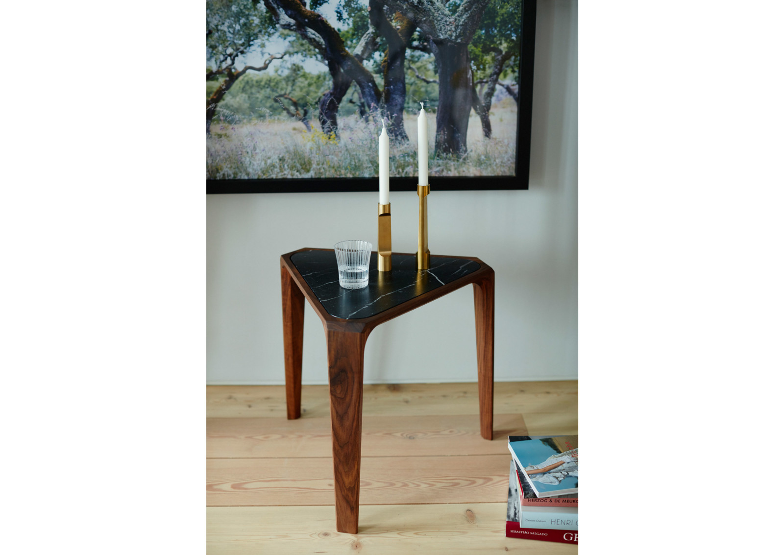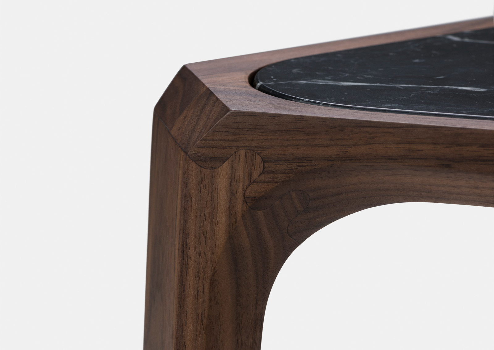 Mary's Side Table, crafted in solid hardwood with a marble top, is substantial yet delicate, sculptural yet highly functional. It was inspired by a visit to the Cathedral of St. Mary of the Assumption in San Francisco. Matthew Hilton was moved by the contrast between the oppressive weight of the concrete structure and the release of the swooping, expansive space within. Mary's side table captures this paradox of weight and weightlessness. Designed by Matthew Hilton for his eponymous brand, and manufactured by De La Espada craftsmen.
