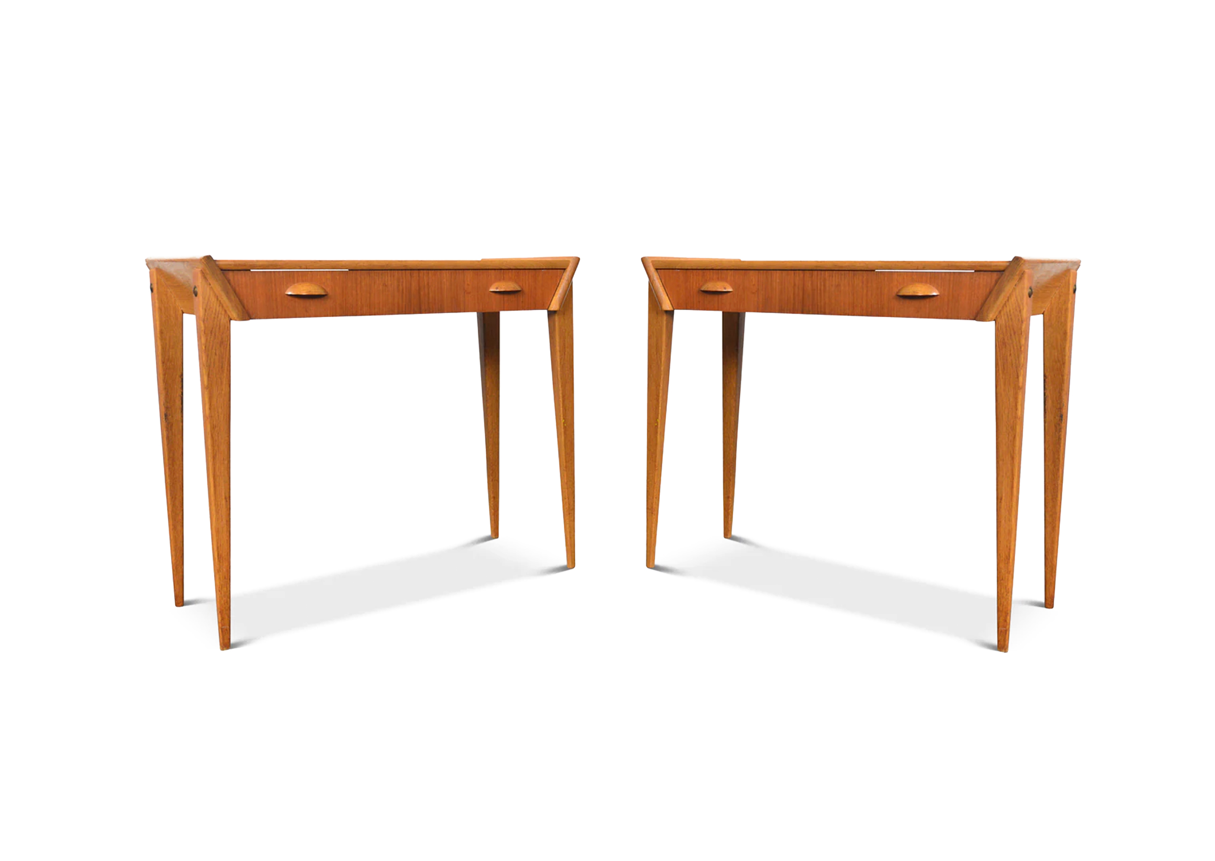This pair of Atomic Teak + Oak Swedish Modern Nightstands are distinguished by their materials and period detailing. Designed for everyday use, they offer practical storage or surface space with a refined, collected presence.